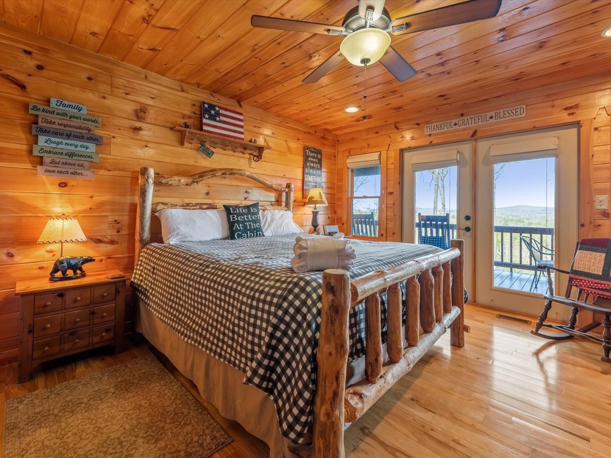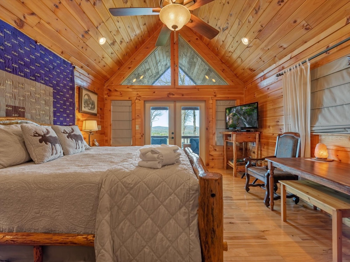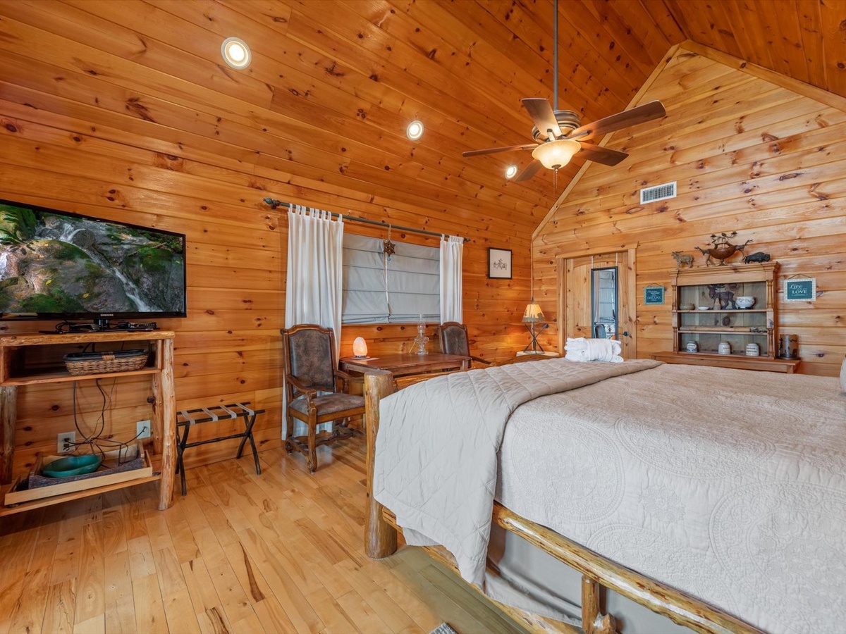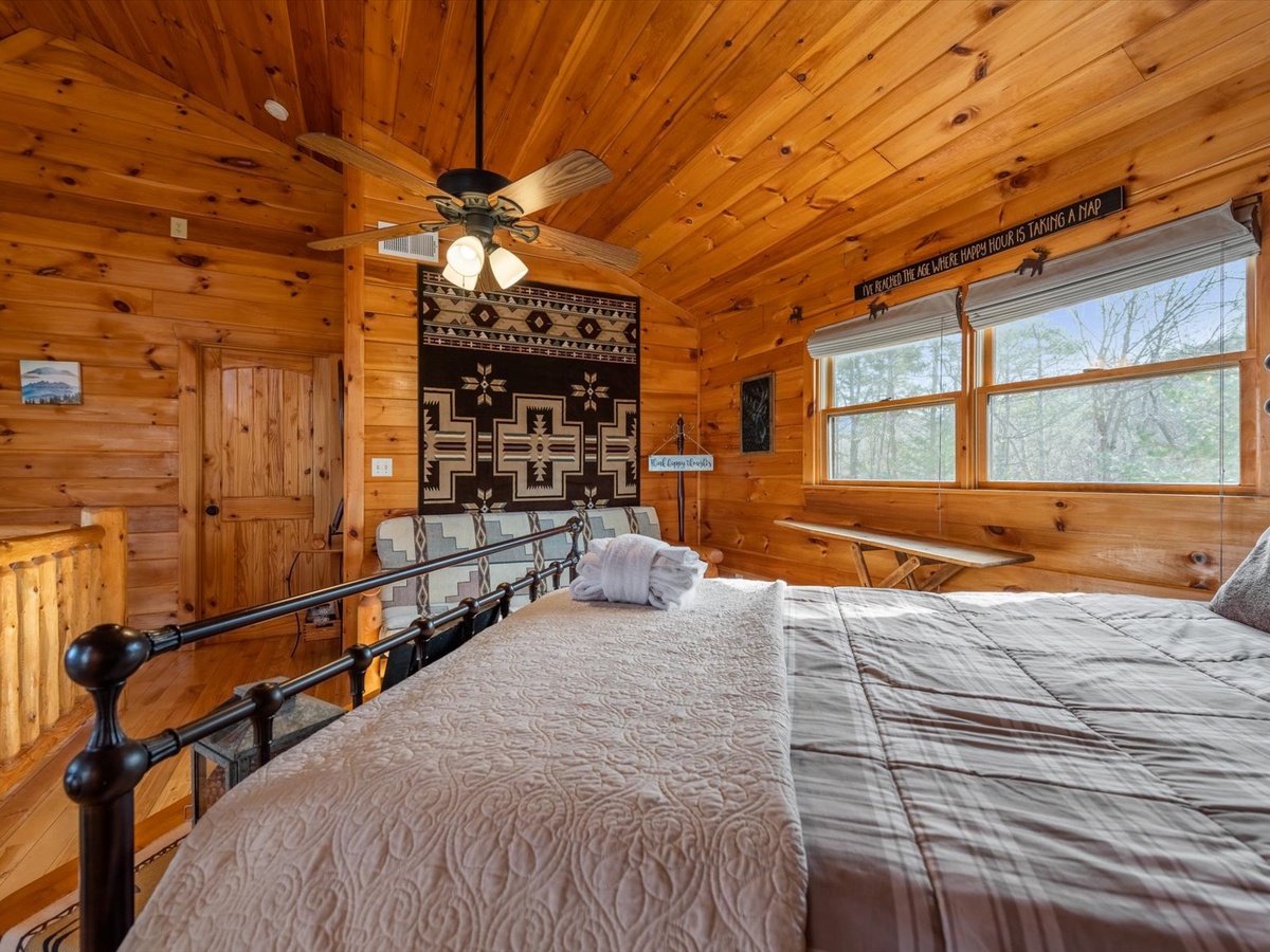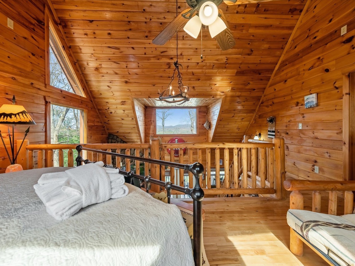 Head upstairs to the king master suite with an attached bathroom boasting a large jetted tub and a stand-up tile shower. This wonderfully appointed king suite also has its very own private balcony/deck along with rocking chairs. Wind down before bed watching your favorite shows on the 42" TV while laying down on the comfy king size mattress soaking in the views from your room. There is also a queen bed in the open loft area for even more sleep accommodations.