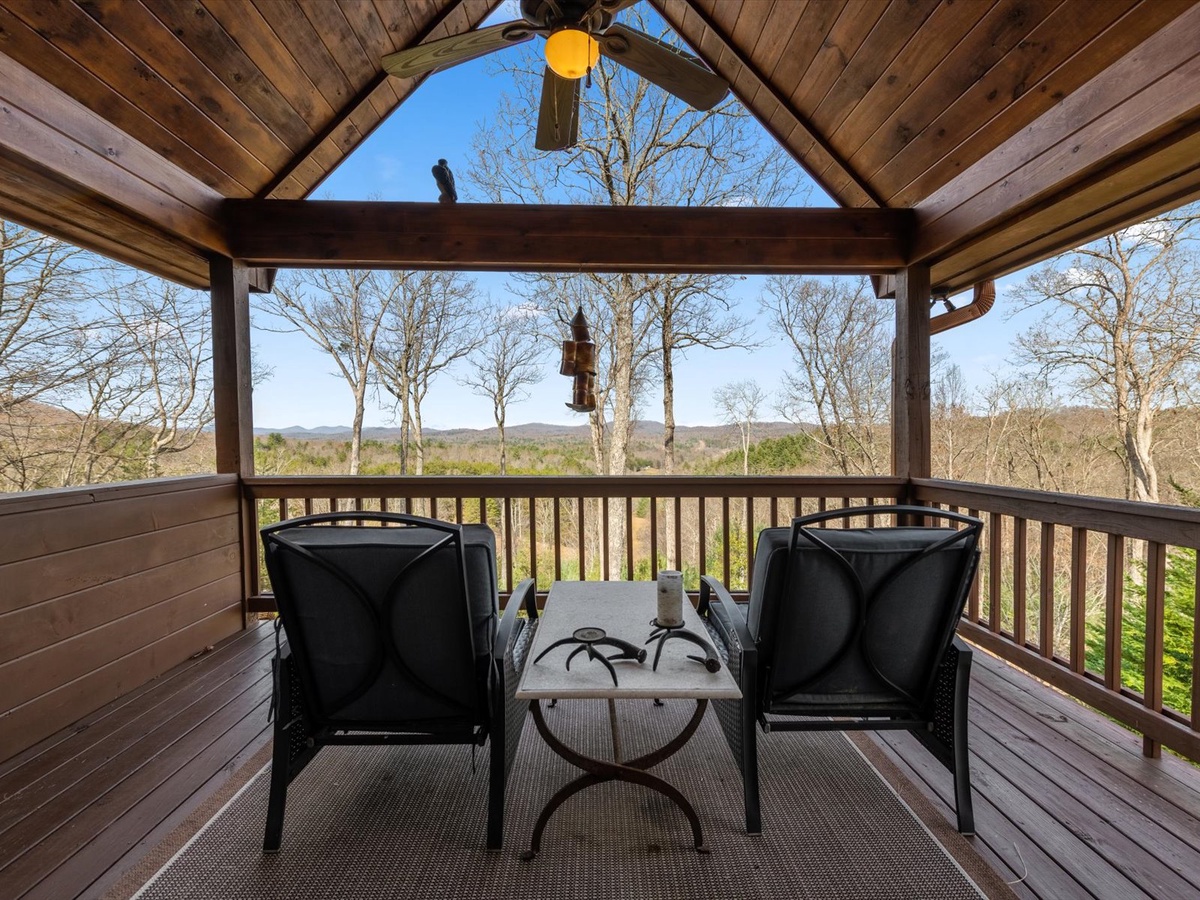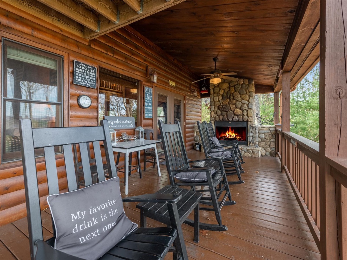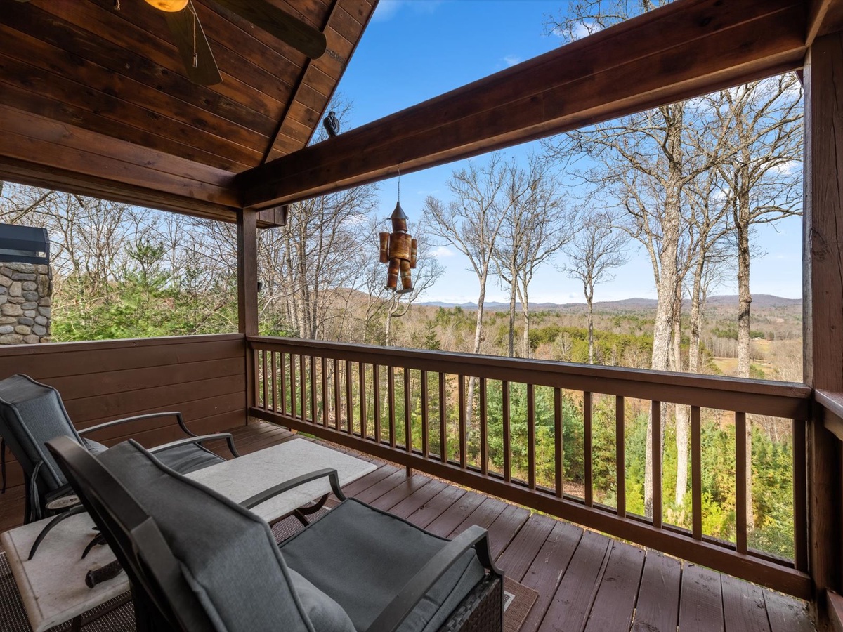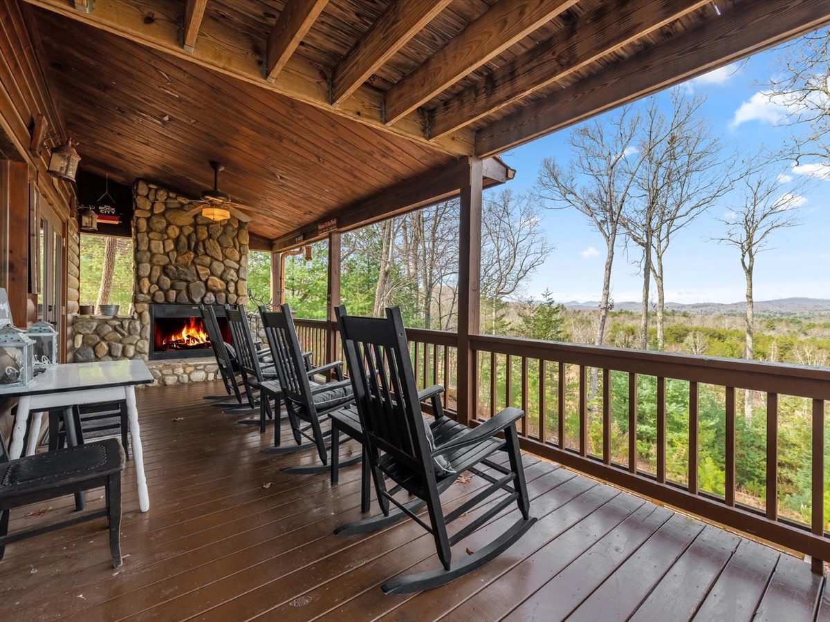 - Entry level deck has rocking chairs near the covered wood burning fireplace with phenomenal mountain views
