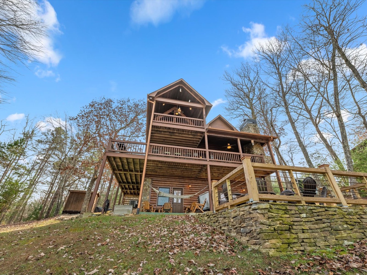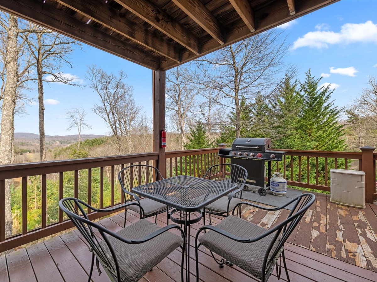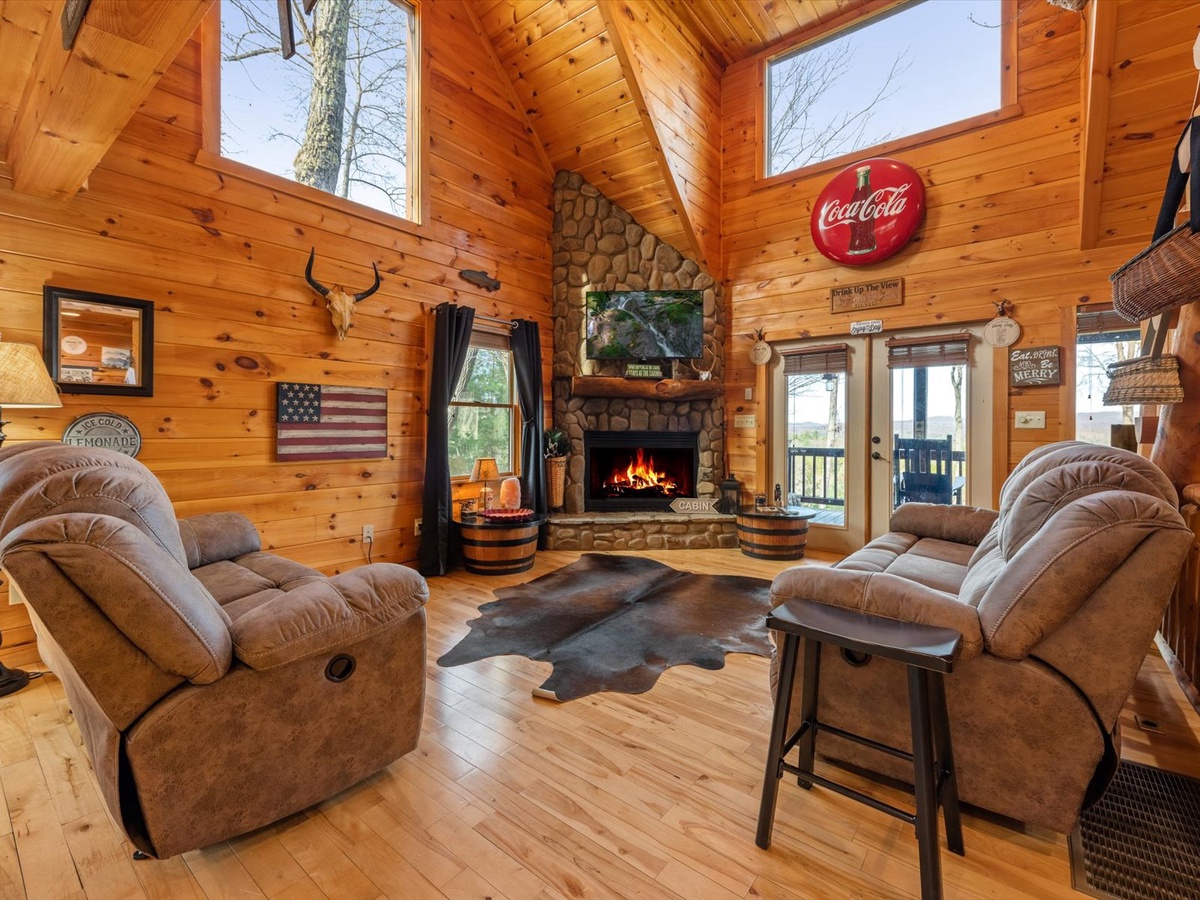 "Drink Up The View" pretty much says it all! This cabin offers amazing medium-long range mountain views while also having a pasture in the valley in view at the same time! Take a step into this beautiful 3 bedroom, 3 bath cabin and you will instantly feel at home. The open floor plan allows the entry-level to flow all together as one, inviting everyone to spend time together by the gas log fireplace while supper is cooked in the kitchen. Take a step on to the deck and you will find a wood-burning fireplace, LOTS of rocking chairs and a gas grill giving you another wonderful area to kick back and relax. The entry-level is also home to a king bedroom which also has access to the deck. There is a shared bathroom with a shower/tub combo on this level as well.