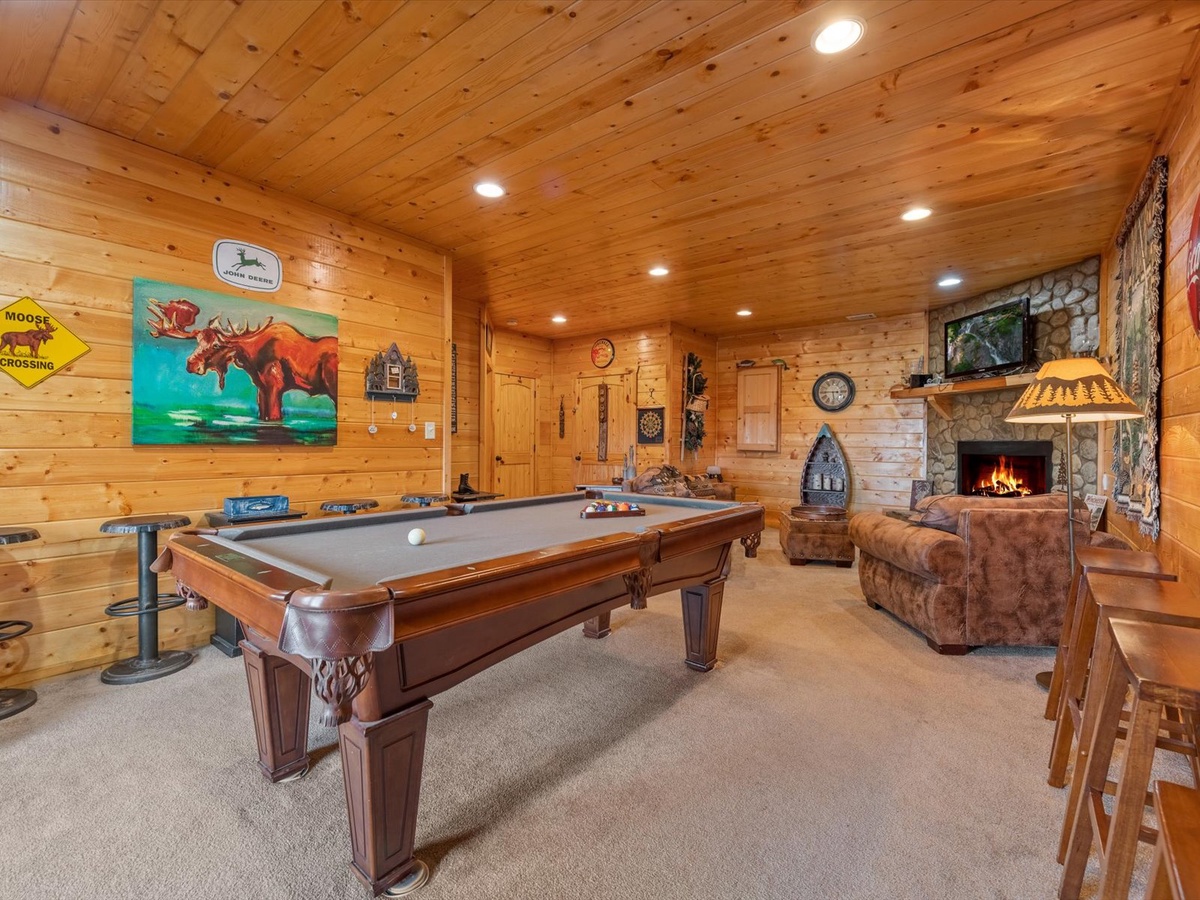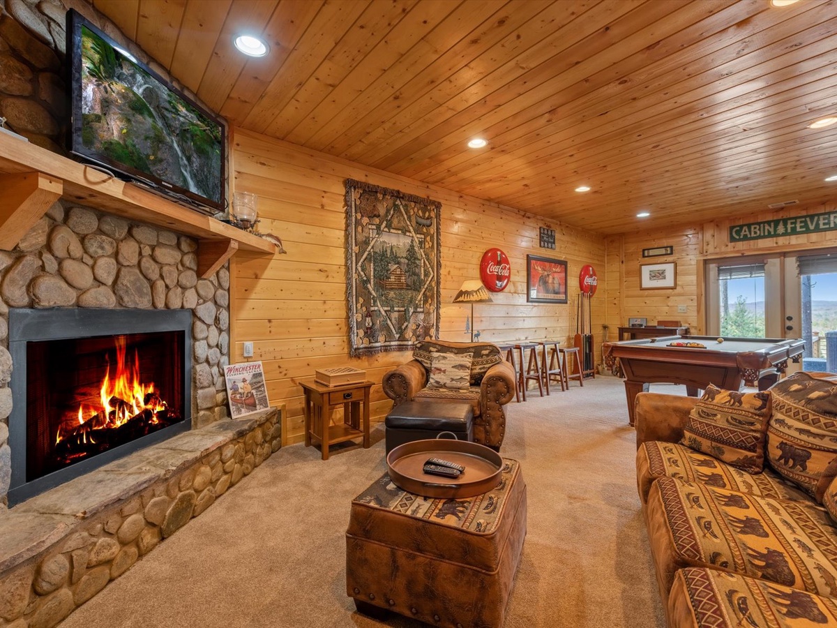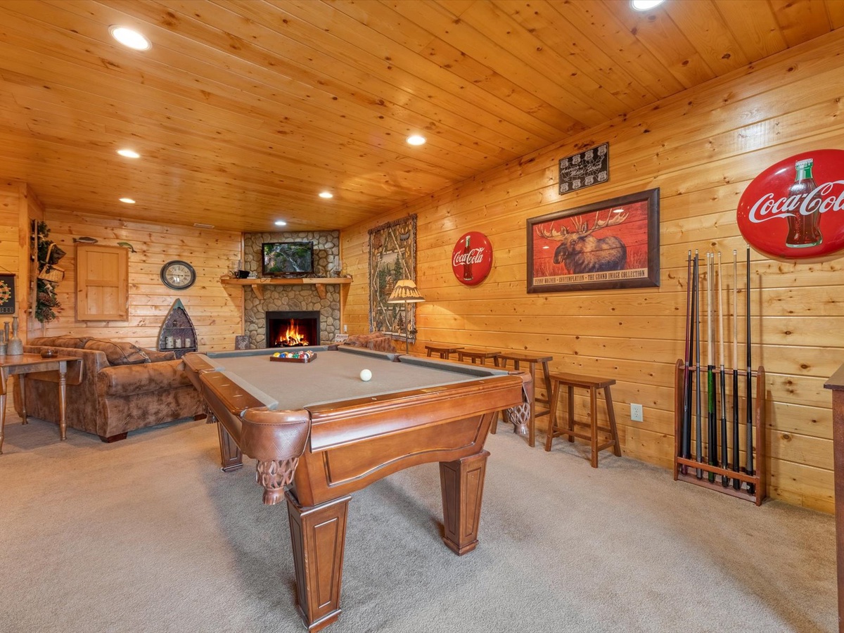 - Den area with pool table, comfy furniture, 48" TV, gas log fireplace, and WII with plenty of games
