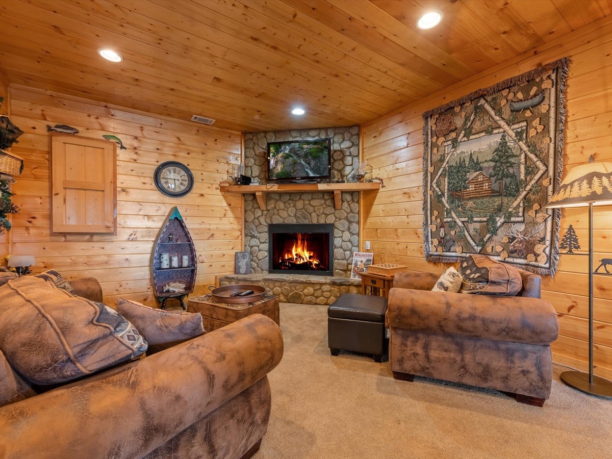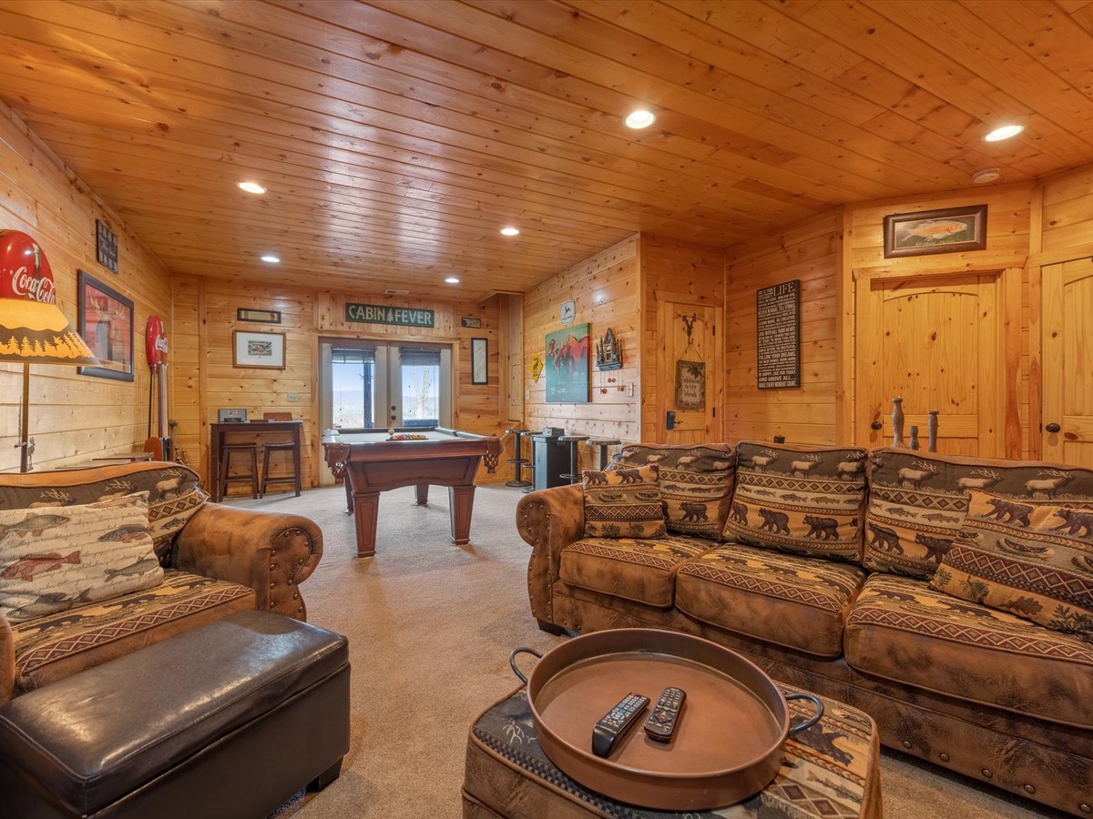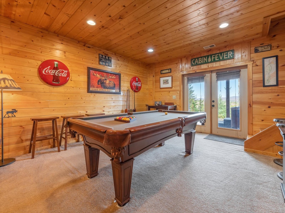- Den area with pool table, comfy furniture, 48" TV, gas log fireplace, and WII with plenty of games