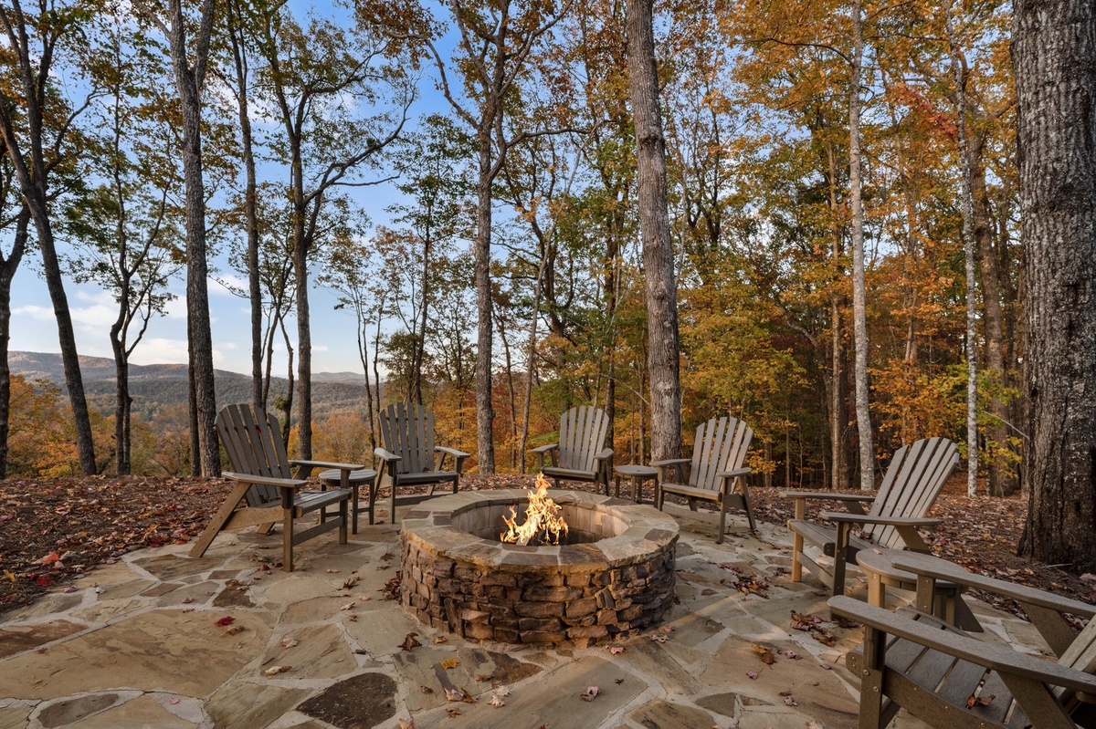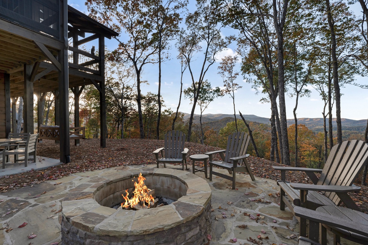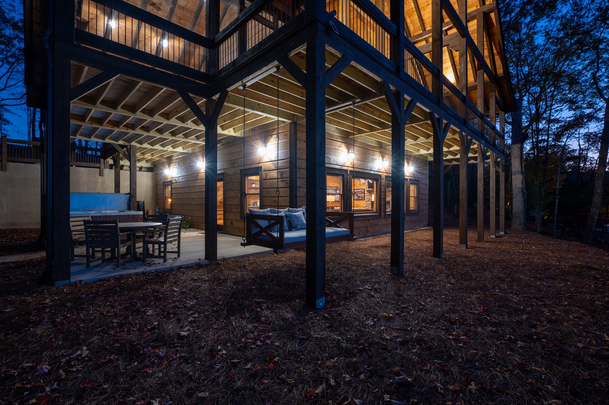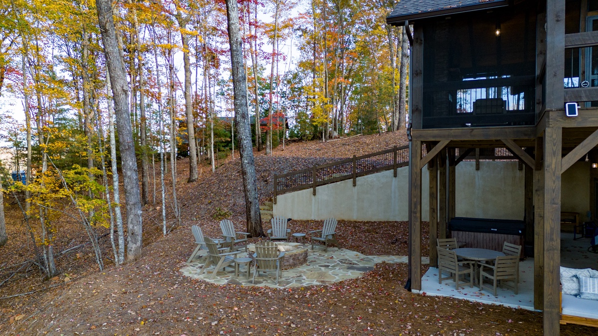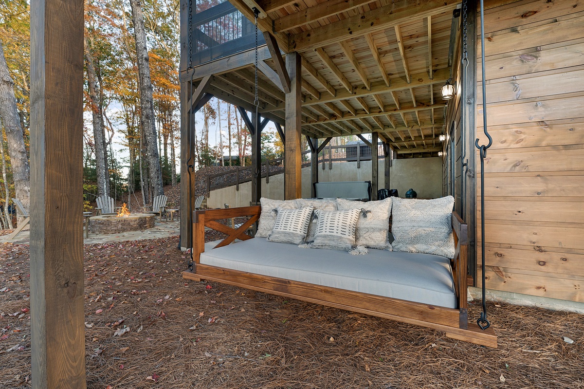 As you exit downstairs, you will find a unique outdoor space that is both flat and private which can be hard to find. Since the home is the last house on the street the outdoor space provides nothing but trees and views with privacy for relaxing. Outside, you will find a Big Green Egg for charcoal grilling or smoking, a fire pit with 6 Adirondack chairs, a swinging bed, an outdoor dining table seating 4, and a 6-person hot tub, plus a few outdoor games for entertainment.