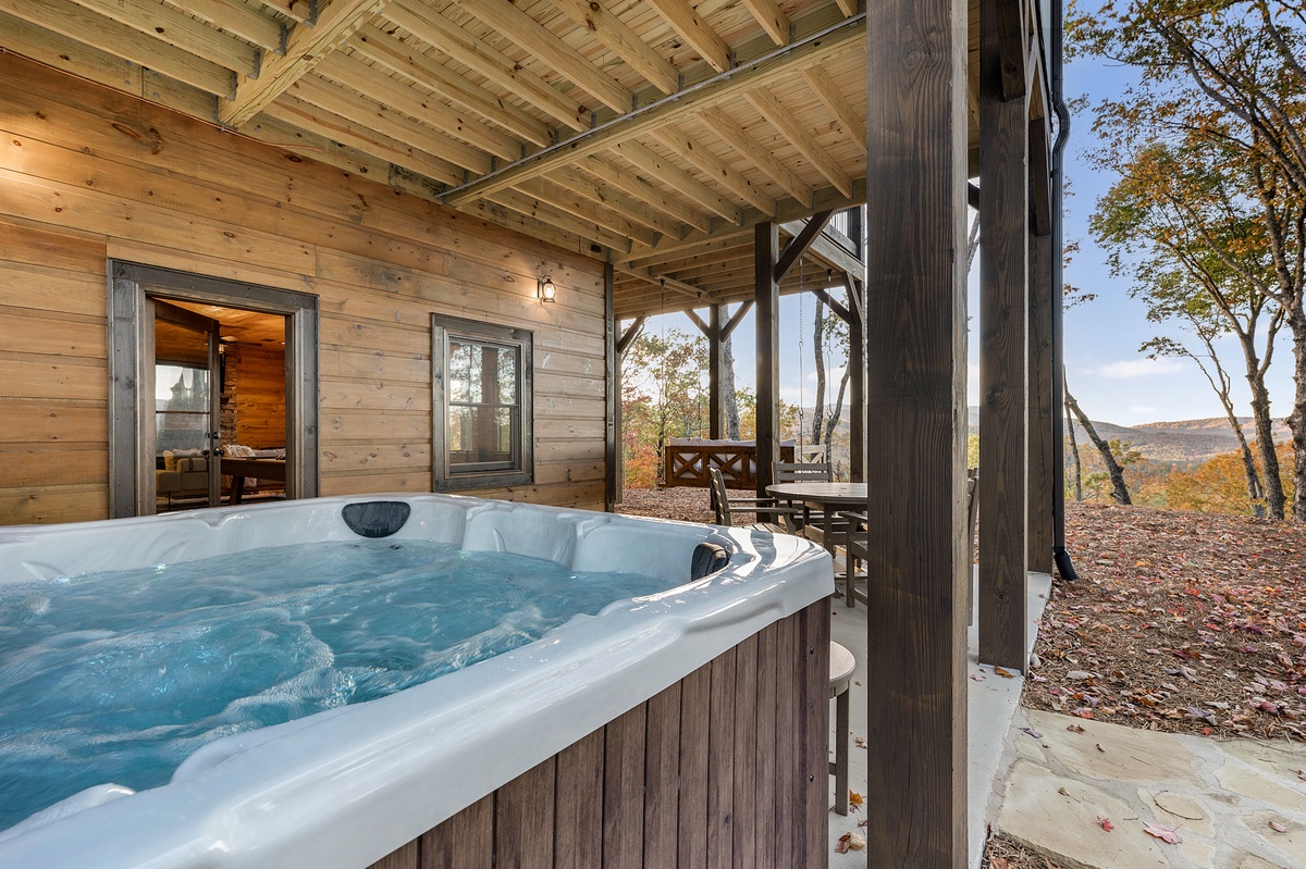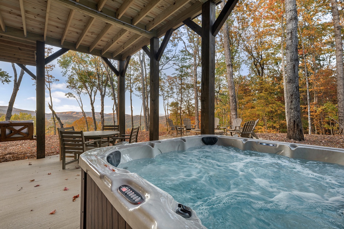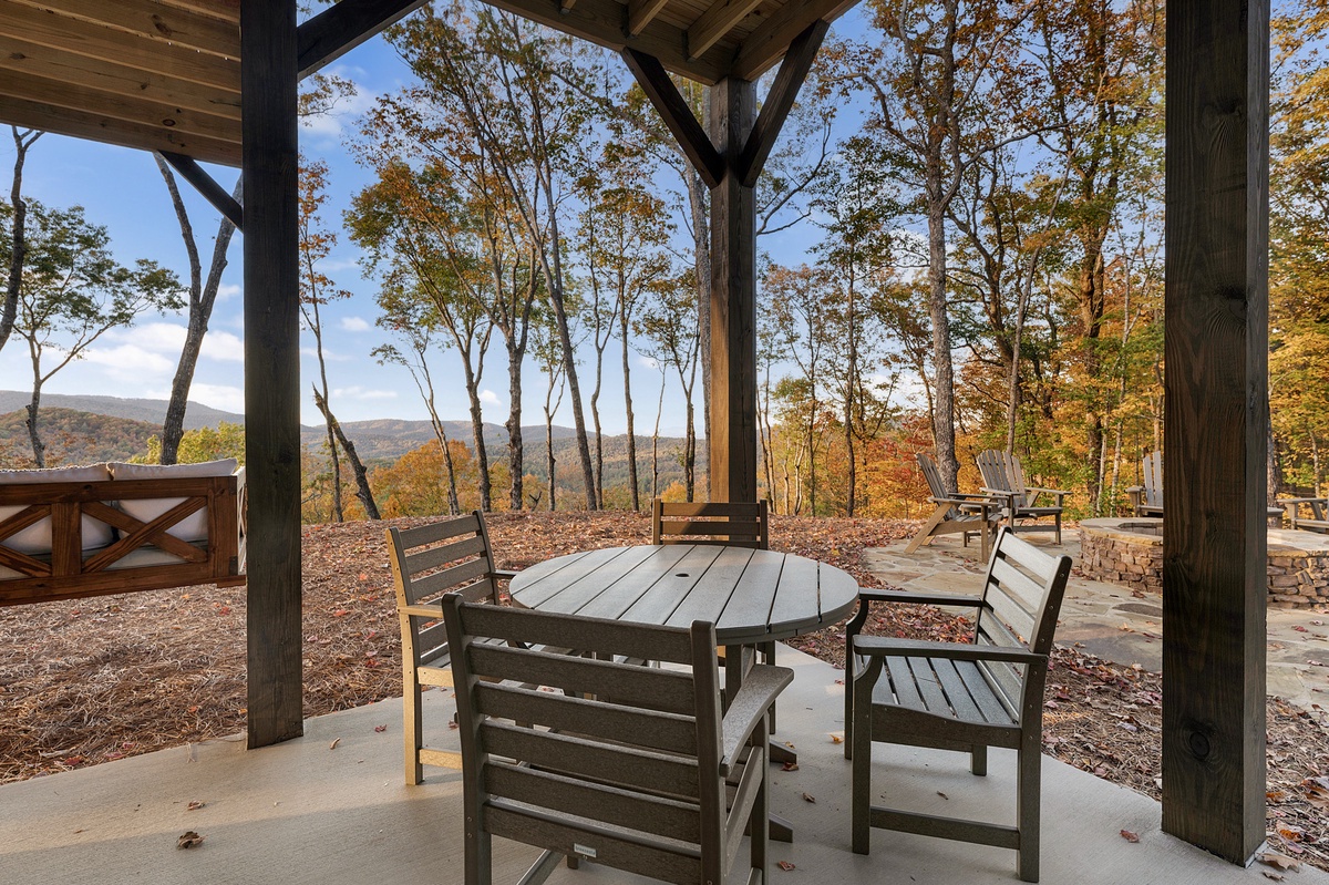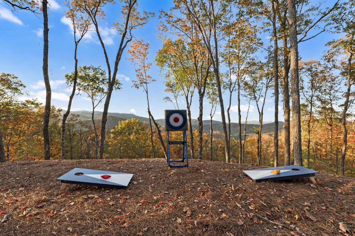 As you exit downstairs, you will find a unique outdoor space that is both flat and private which can be hard to find. Since the home is the last house on the street the outdoor space provides nothing but trees and views with privacy for relaxing. Outside, you will find a Big Green Egg for charcoal grilling or smoking, a fire pit with 6 Adirondack chairs, a swinging bed, an outdoor dining table seating 4, and a 6-person hot tub, plus a few outdoor games for entertainment.