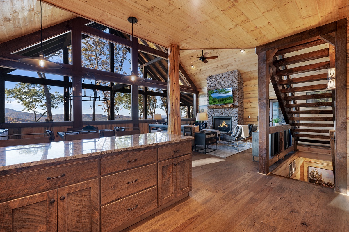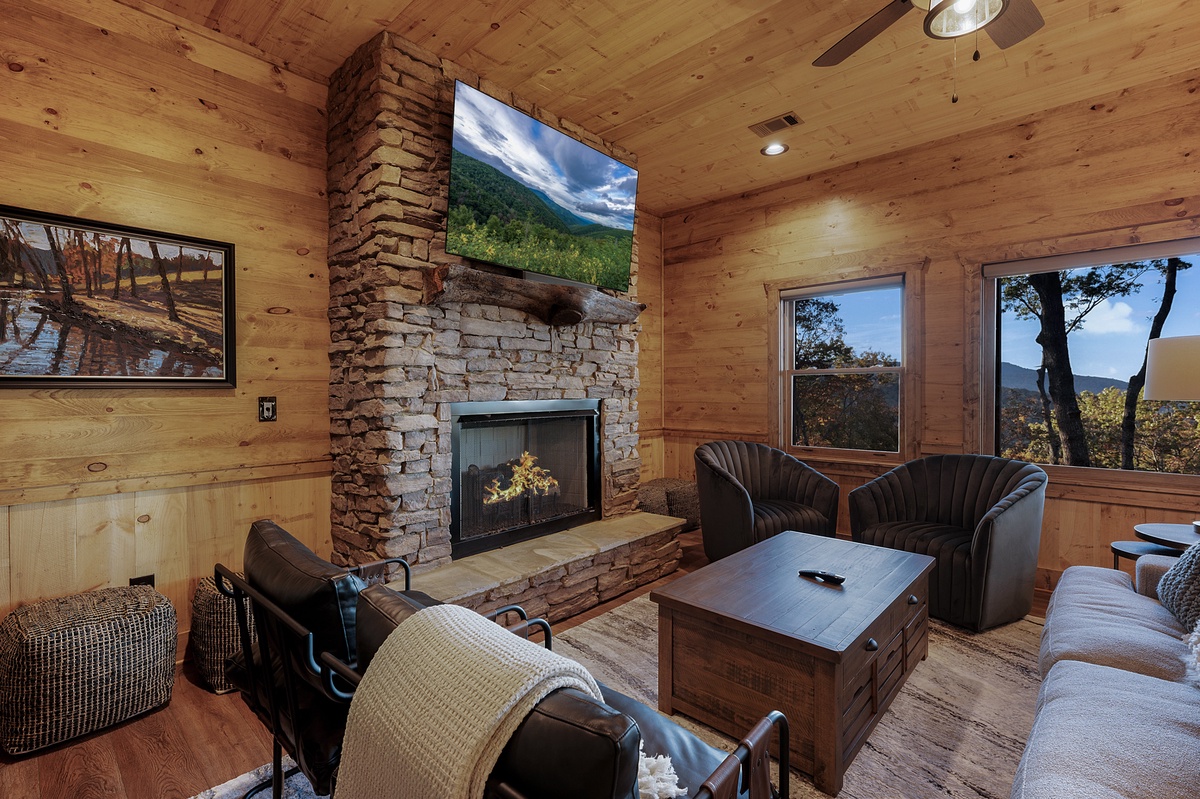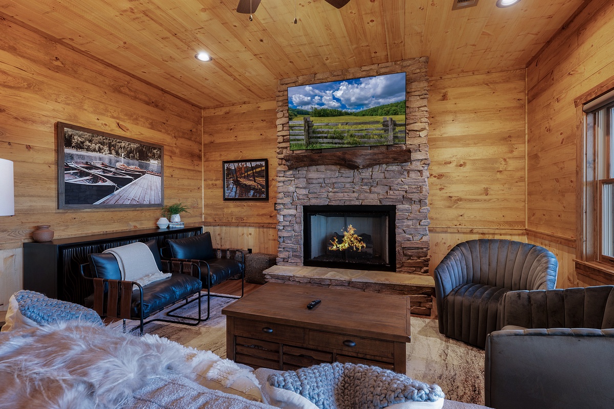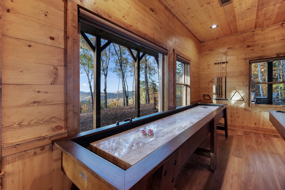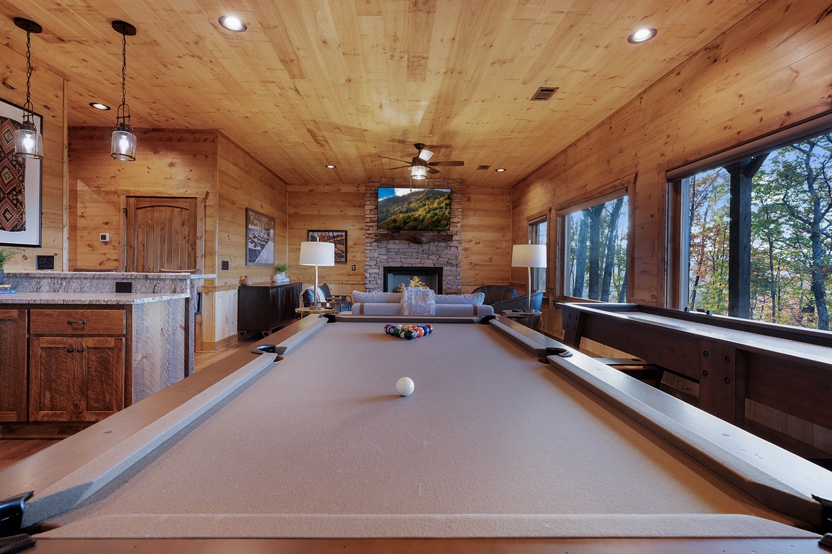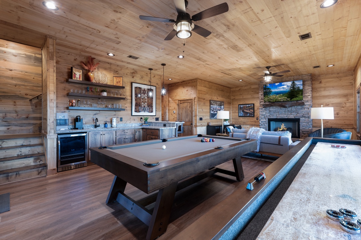 As you set foot upon Eagle Ridge, you are greeted by uninterrupted mountain vista views of the Aska Adventure Area and longer views as far as North Carolina. Indoors, the main living room provides multiple seating areas to unwind near a stone laid gas fireplace including a 65” TV above. Our fully-equipped kitchen accommodates large family feasts with the main dining table seating 8, the kitchen island seating 4 and extra bar stool seating 3, all with mountain views. These same views can be found downstairs which includes a wet bar with a beverage/wine cooler, a pellet ice maker, a Keurig coffee maker, and plenty of barware. You will also find a pool table, shuffleboard table, board games, puzzles and a 65” TV above another stone laid gas fireplace.