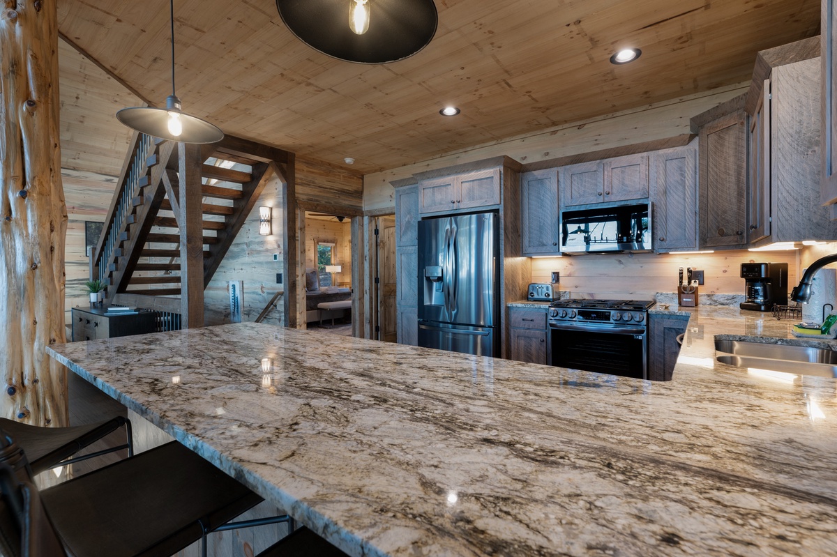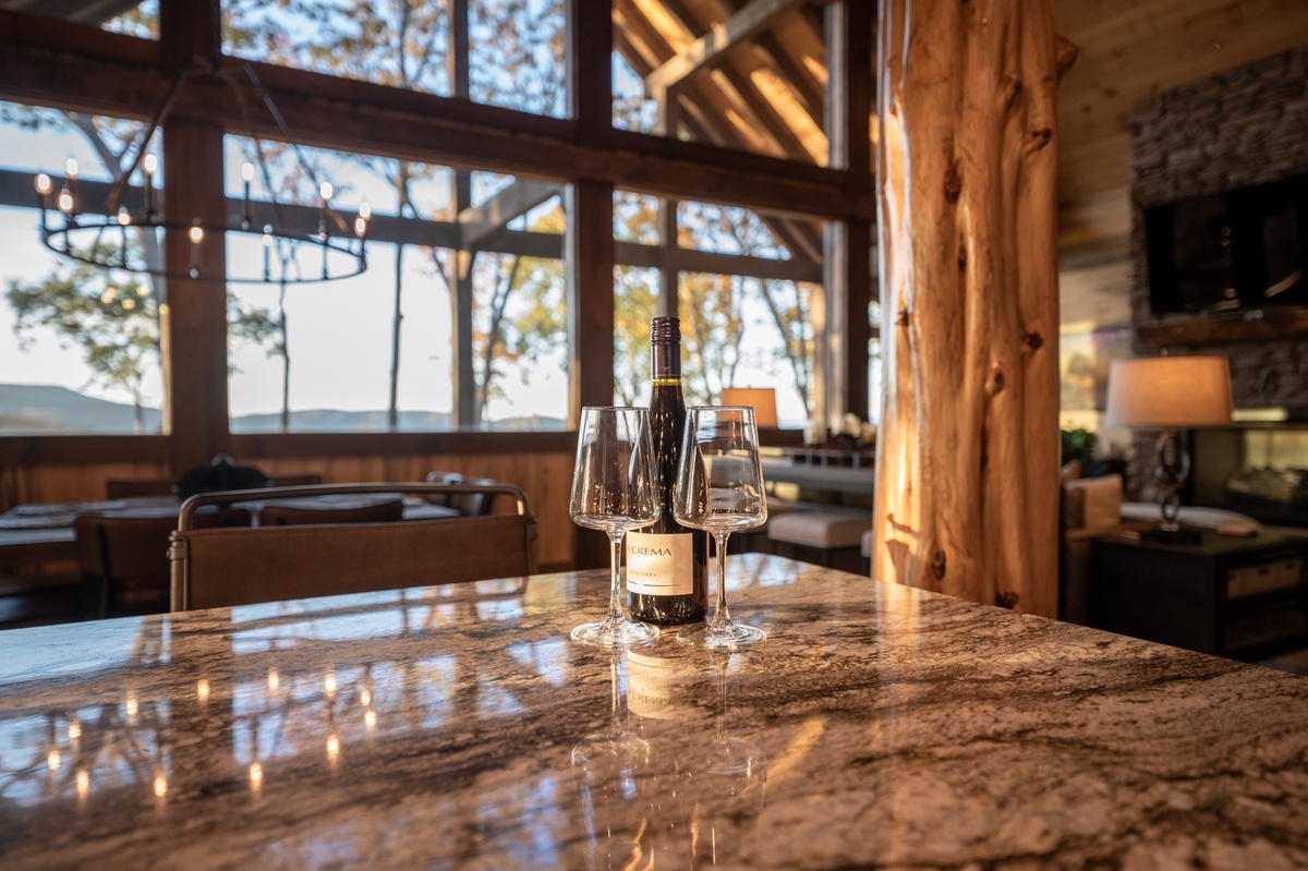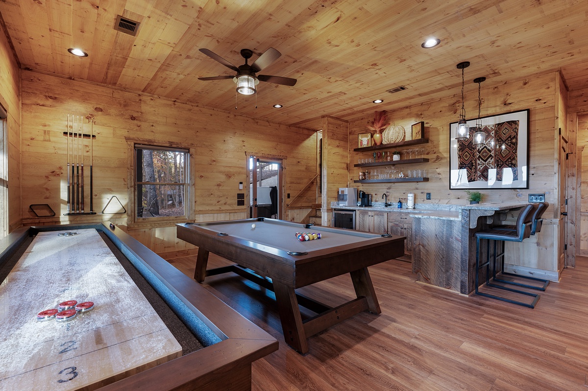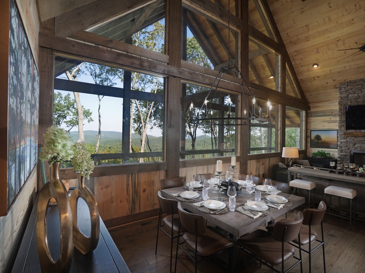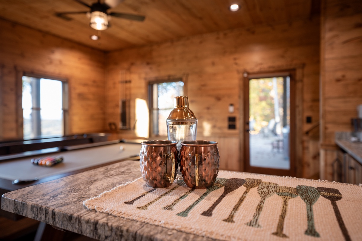 As you set foot upon Eagle Ridge, you are greeted by uninterrupted mountain vista views of the Aska Adventure Area and longer views as far as North Carolina. Indoors, the main living room provides multiple seating areas to unwind near a stone laid gas fireplace including a 65” TV above. Our fully-equipped kitchen accommodates large family feasts with the main dining table seating 8, the kitchen island seating 4 and extra bar stool seating 3, all with mountain views. These same views can be found downstairs which includes a wet bar with a beverage/wine cooler, a pellet ice maker, a Keurig coffee maker, and plenty of barware. You will also find a pool table, shuffleboard table, board games, puzzles and a 65” TV above another stone laid gas fireplace.
