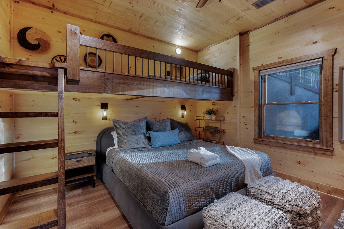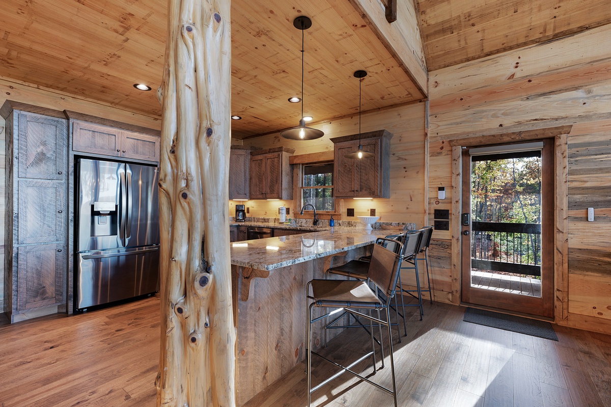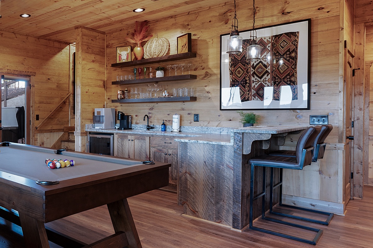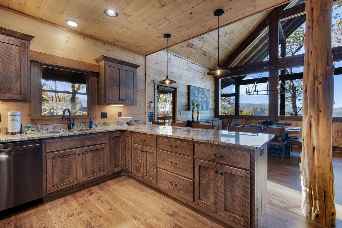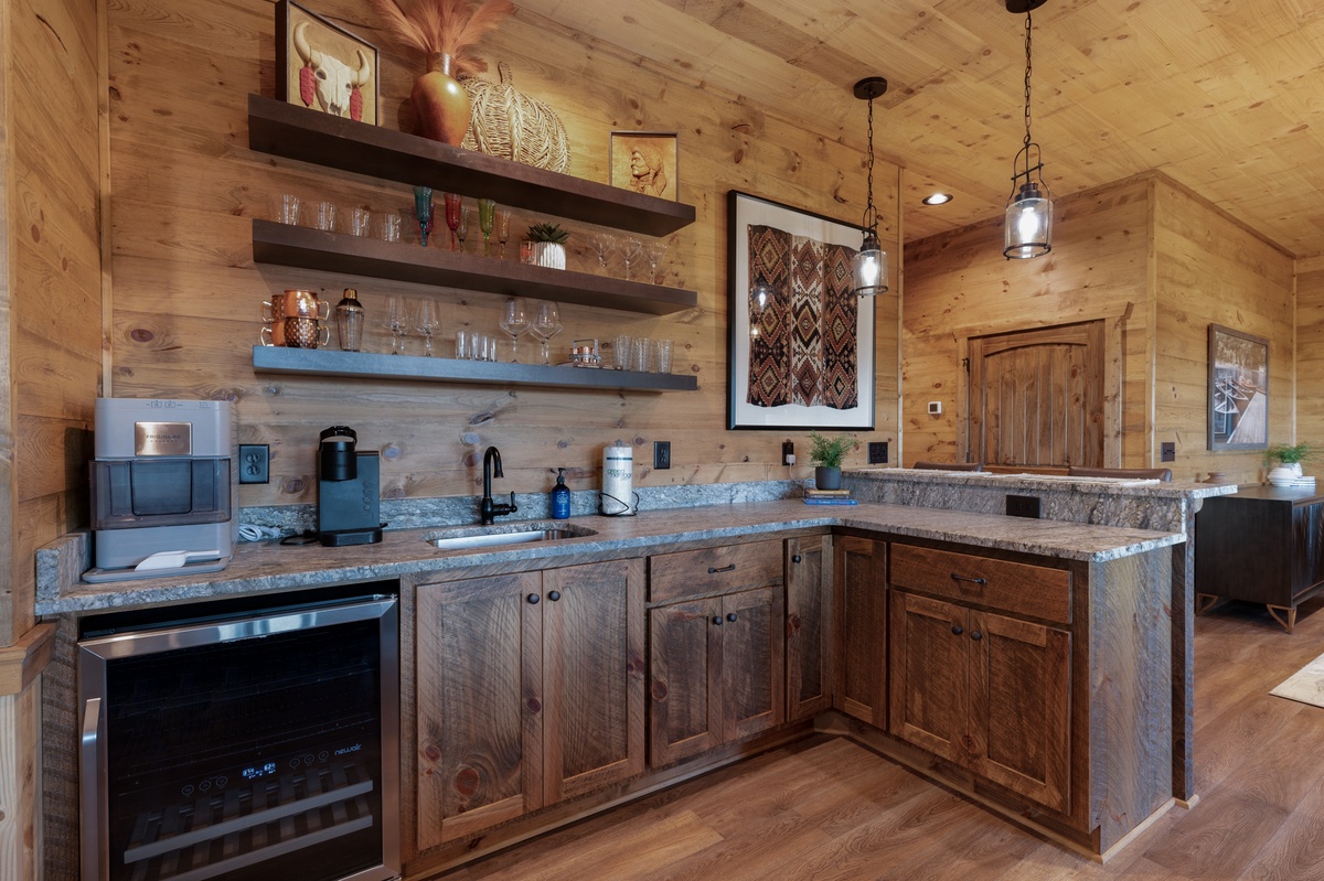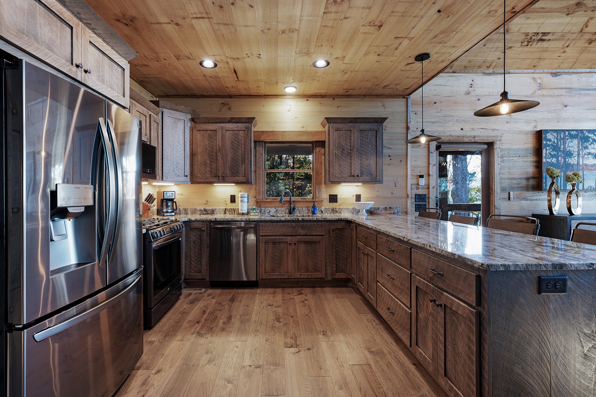 As you set foot upon Eagle Ridge, you are greeted by uninterrupted mountain vista views of the Aska Adventure Area and longer views as far as North Carolina. Indoors, the main living room provides multiple seating areas to unwind near a stone laid gas fireplace including a 65” TV above. Our fully-equipped kitchen accommodates large family feasts with the main dining table seating 8, the kitchen island seating 4 and extra bar stool seating 3, all with mountain views. These same views can be found downstairs which includes a wet bar with a beverage/wine cooler, a pellet ice maker, a Keurig coffee maker, and plenty of barware. You will also find a pool table, shuffleboard table, board games, puzzles and a 65” TV above another stone laid gas fireplace.