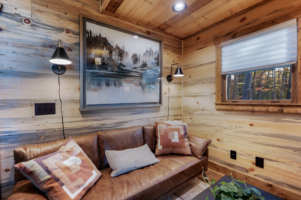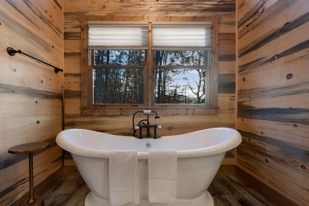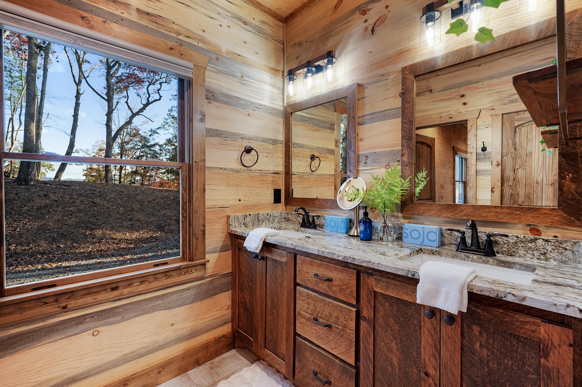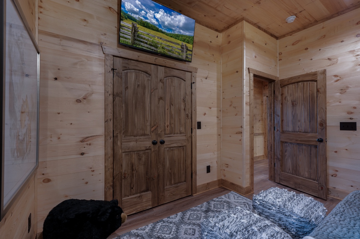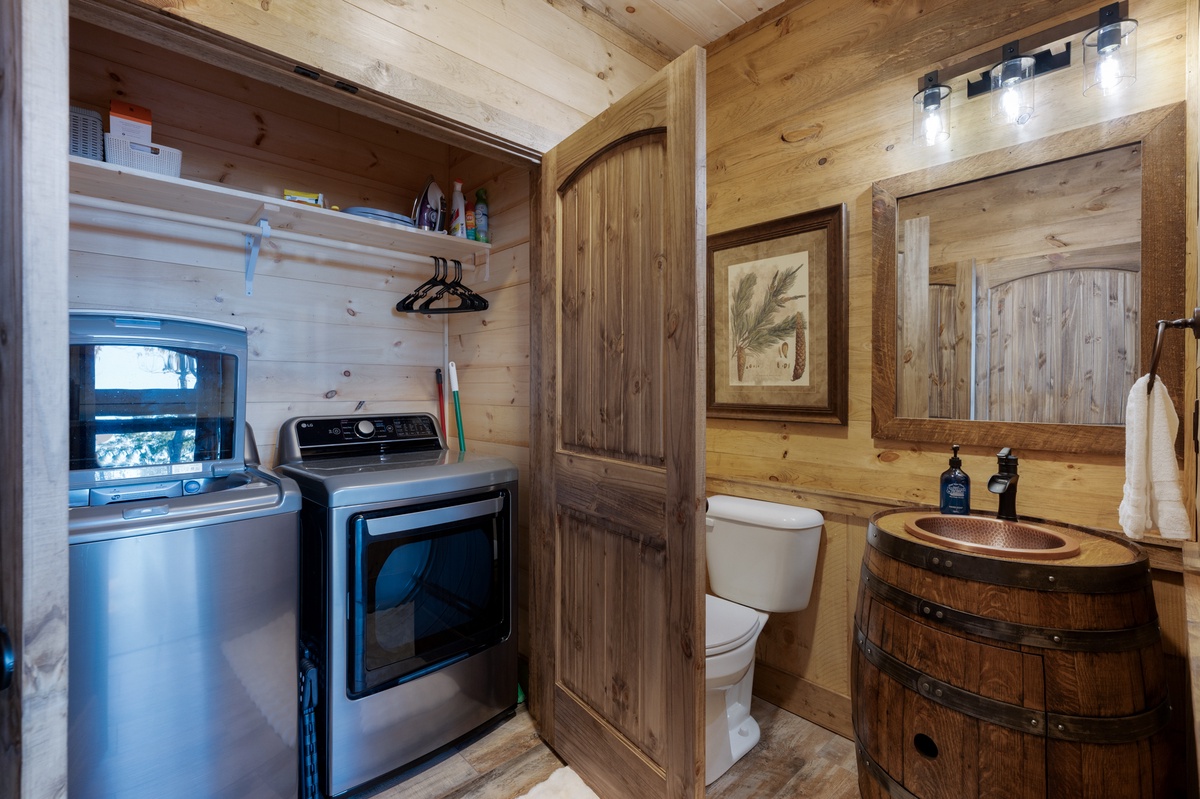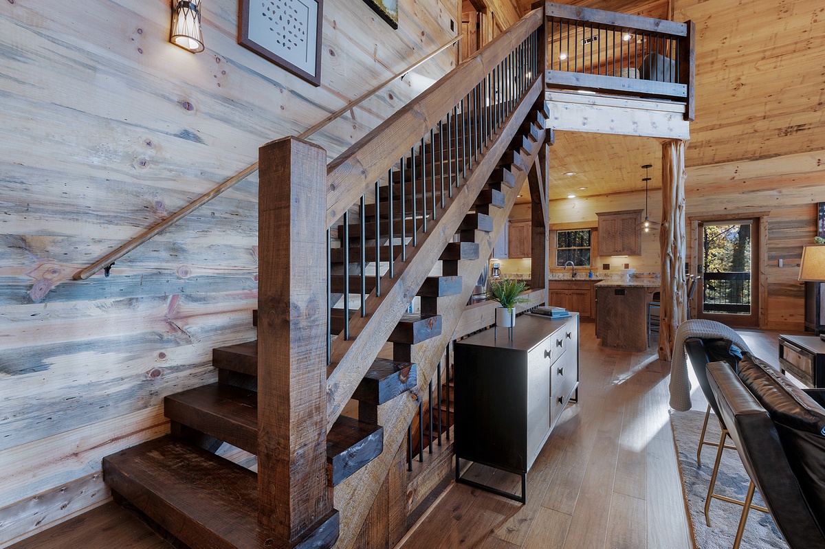 As you set foot upon Eagle Ridge, you are greeted by uninterrupted mountain vista views of the Aska Adventure Area and longer views as far as North Carolina. Indoors, the main living room provides multiple seating areas to unwind near a stone laid gas fireplace including a 65” TV above. Our fully-equipped kitchen accommodates large family feasts with the main dining table seating 8, the kitchen island seating 4 and extra bar stool seating 3, all with mountain views. These same views can be found downstairs which includes a wet bar with a beverage/wine cooler, a pellet ice maker, a Keurig coffee maker, and plenty of barware. You will also find a pool table, shuffleboard table, board games, puzzles and a 65” TV above another stone laid gas fireplace.