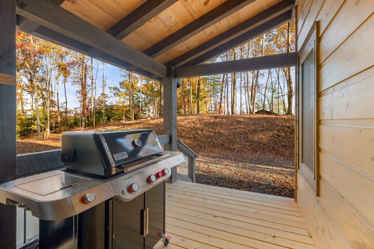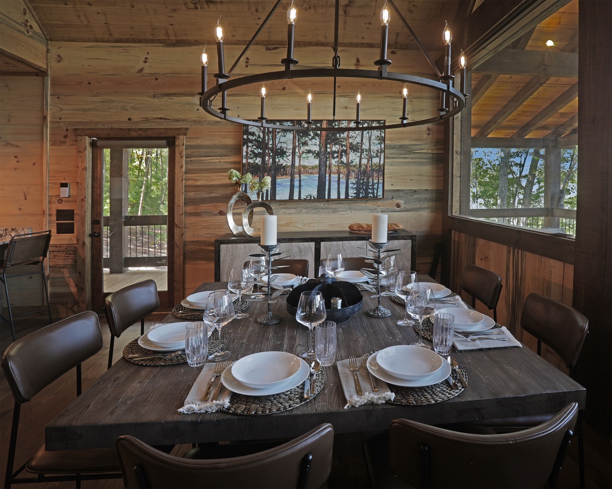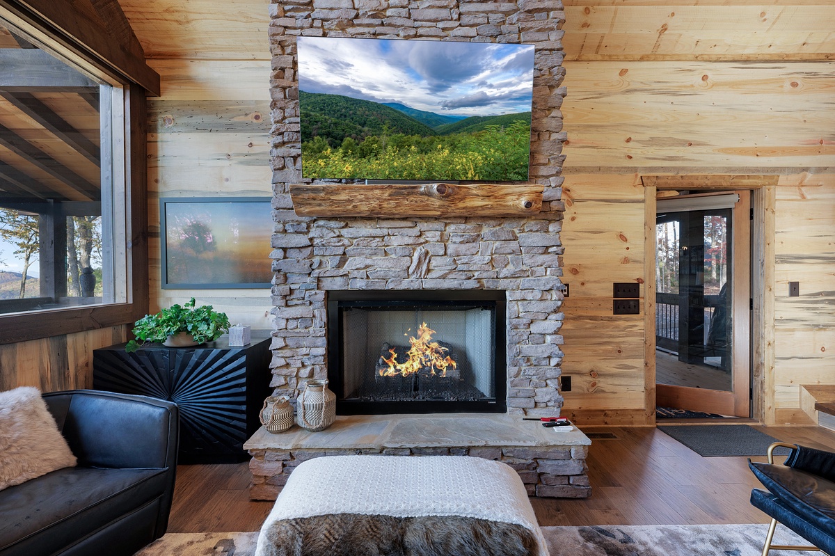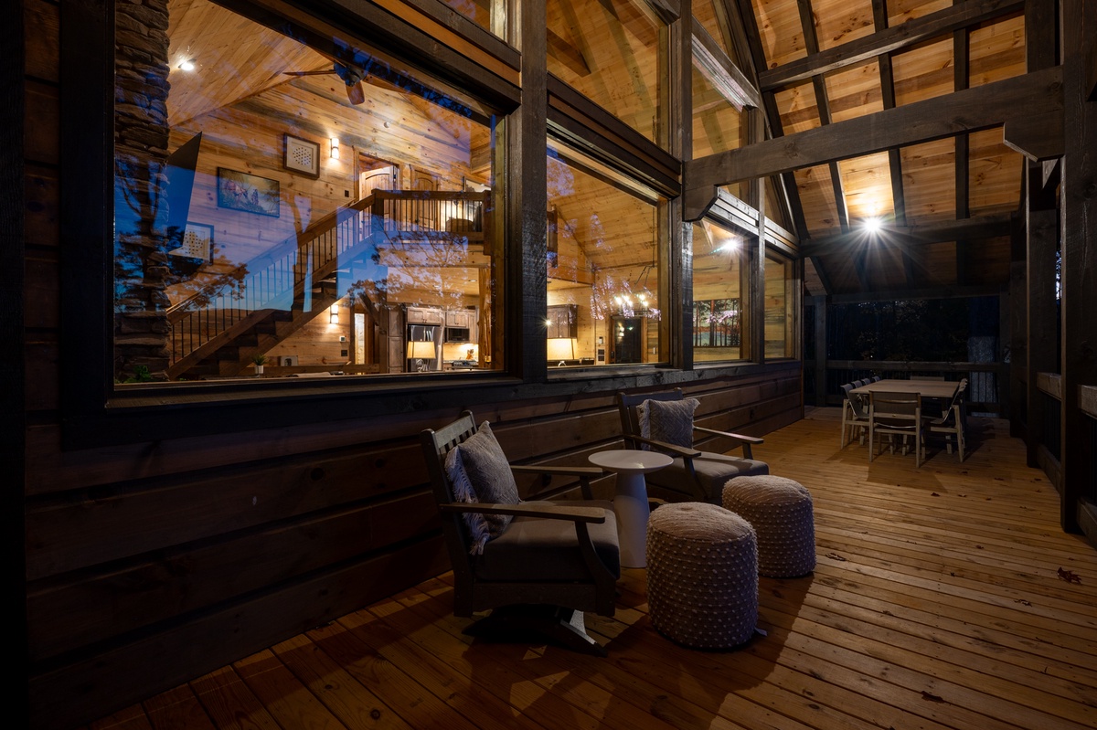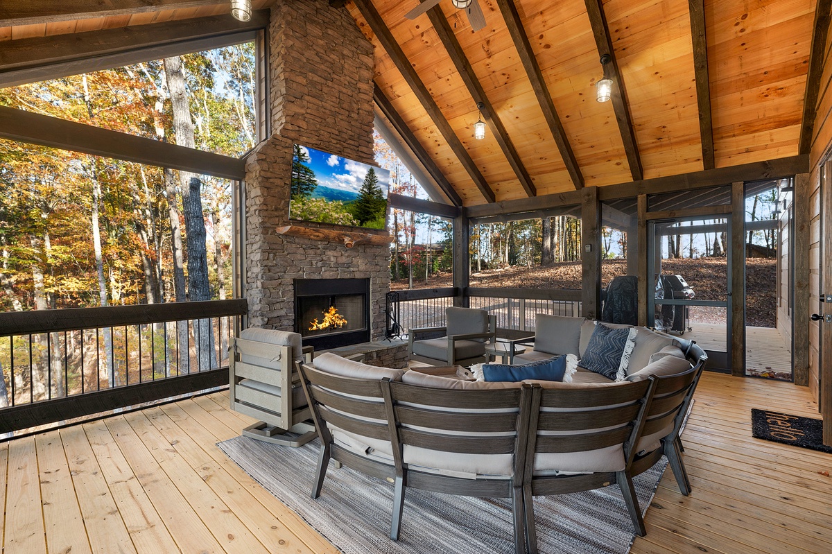 The entry-level wrap around deck is a picturesque setting for sharing meals and time in the raw outdoors. The front portion of the deck includes a dining table for 10 and a couple cozy chairs with ottomans to sip on your favorite beverage soaking in the views. Or you can just chill by the wood burning fireplace in the screen porch section of the deck also with a 65” TV and plenty of comfortable seating with views. For convenience there is a firewood rack and a gas grill just outside the screen porch.