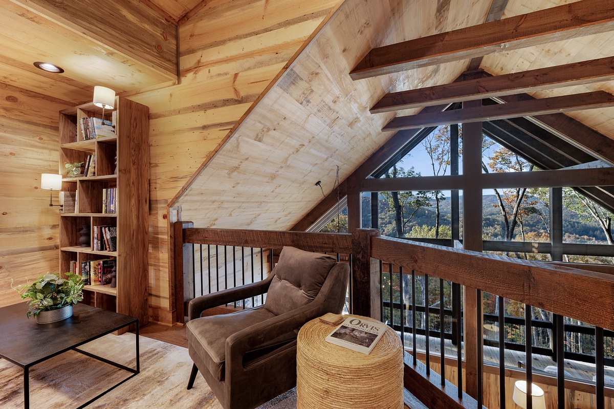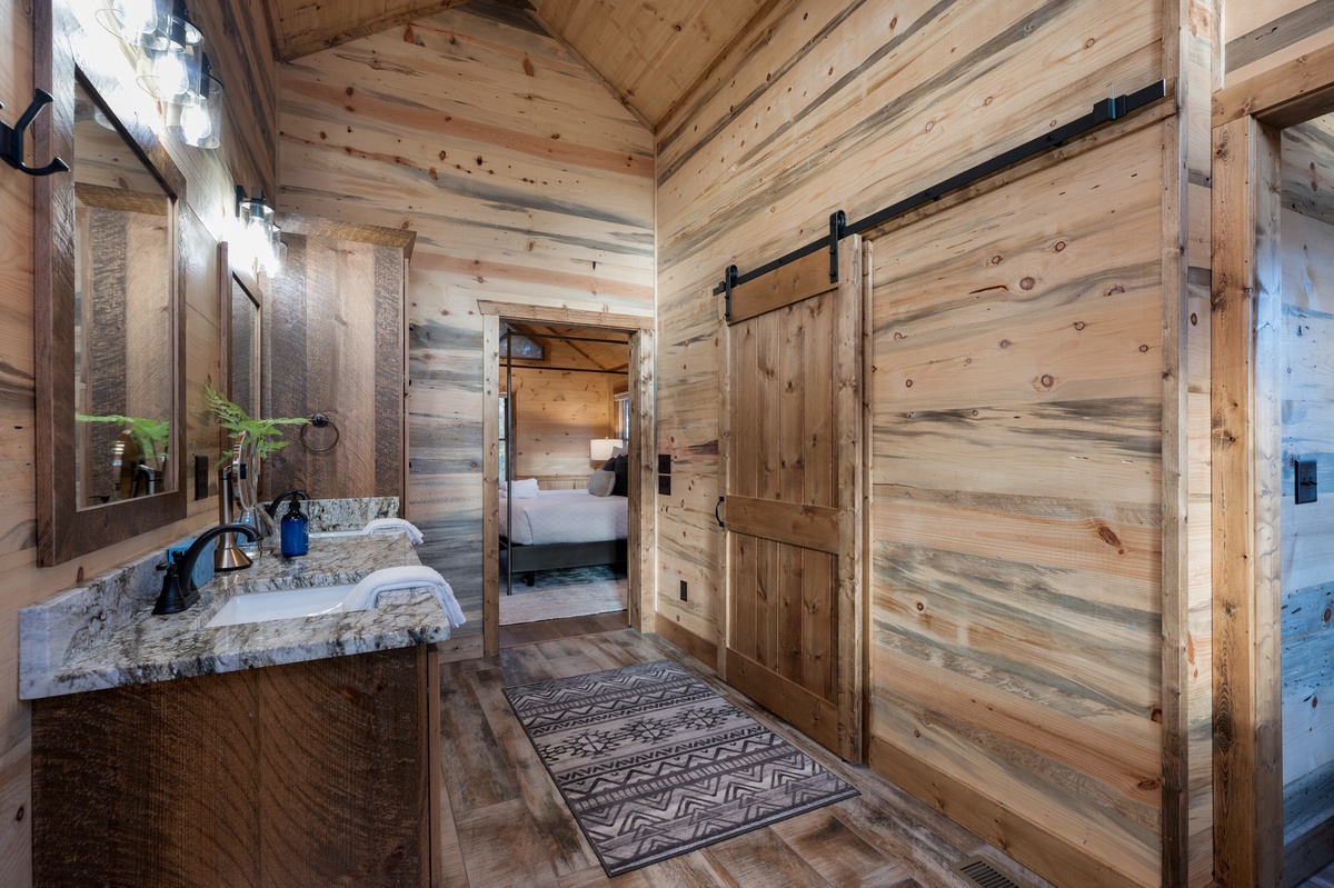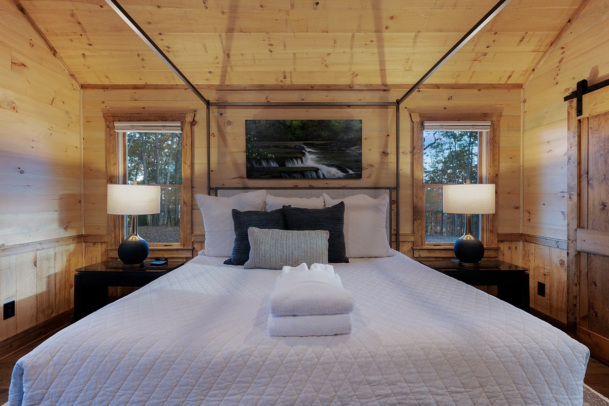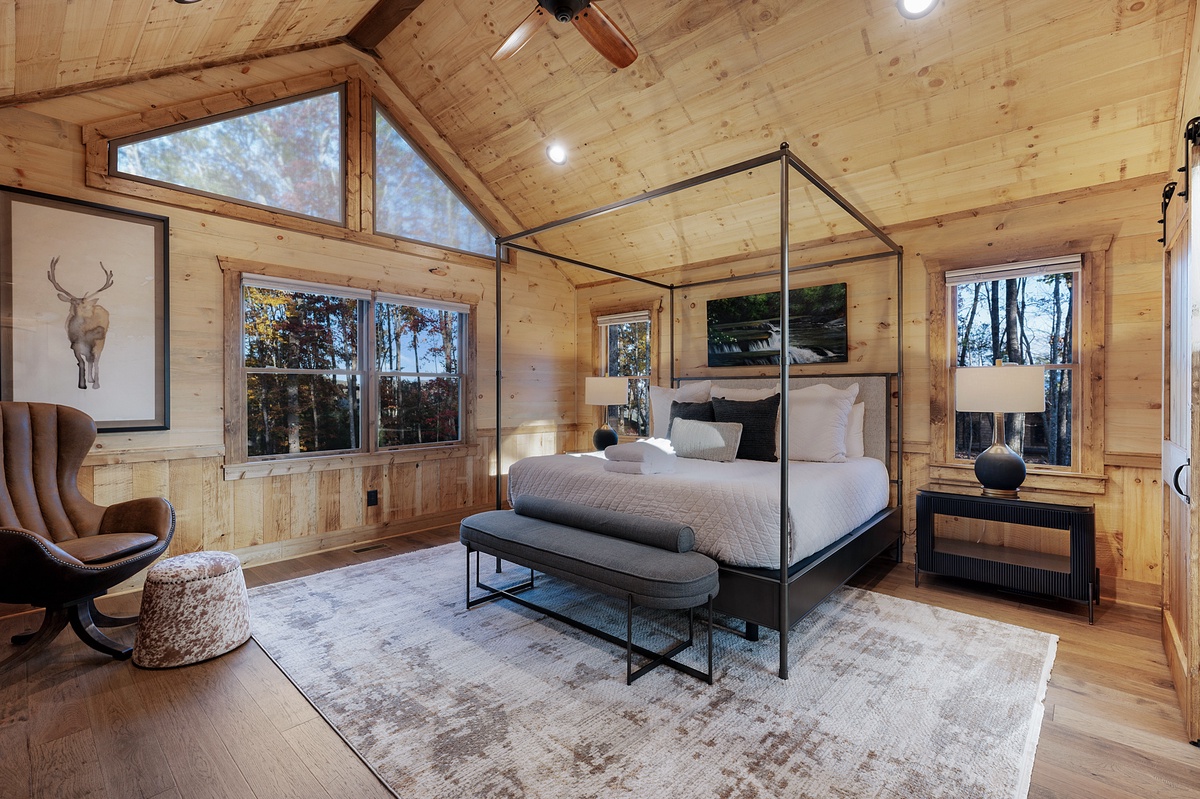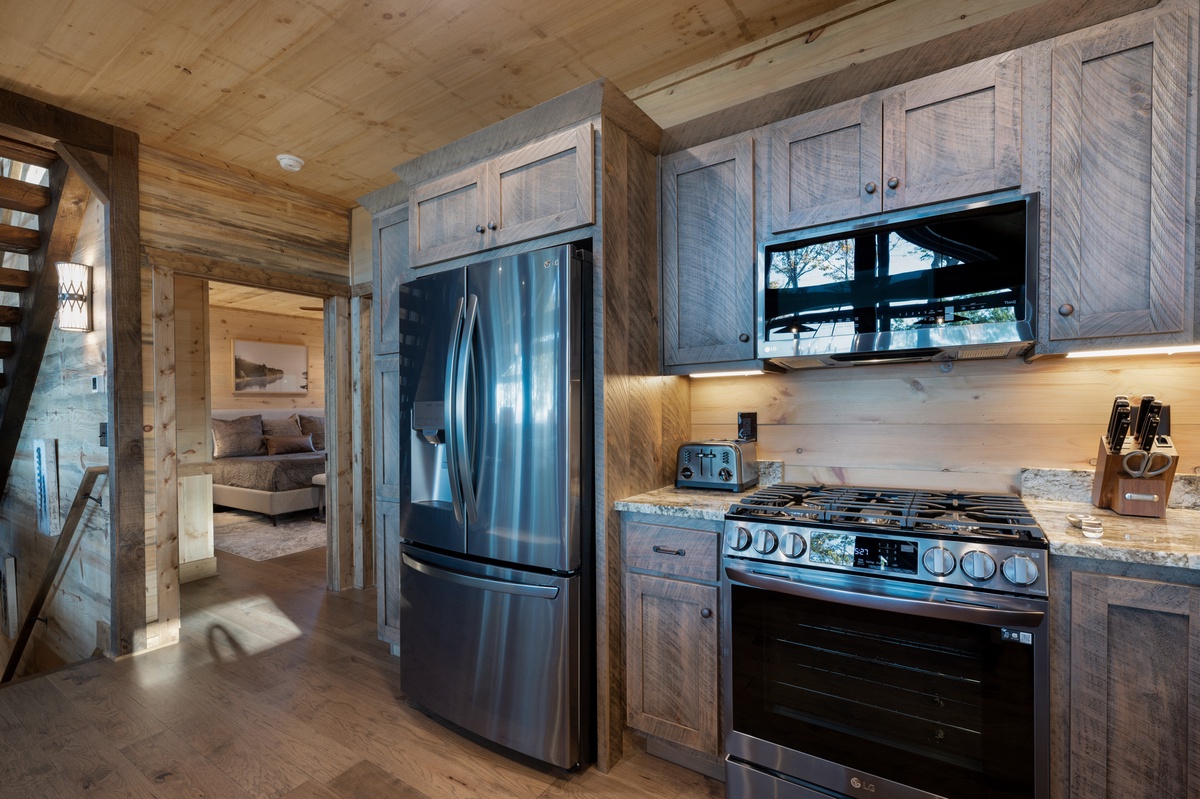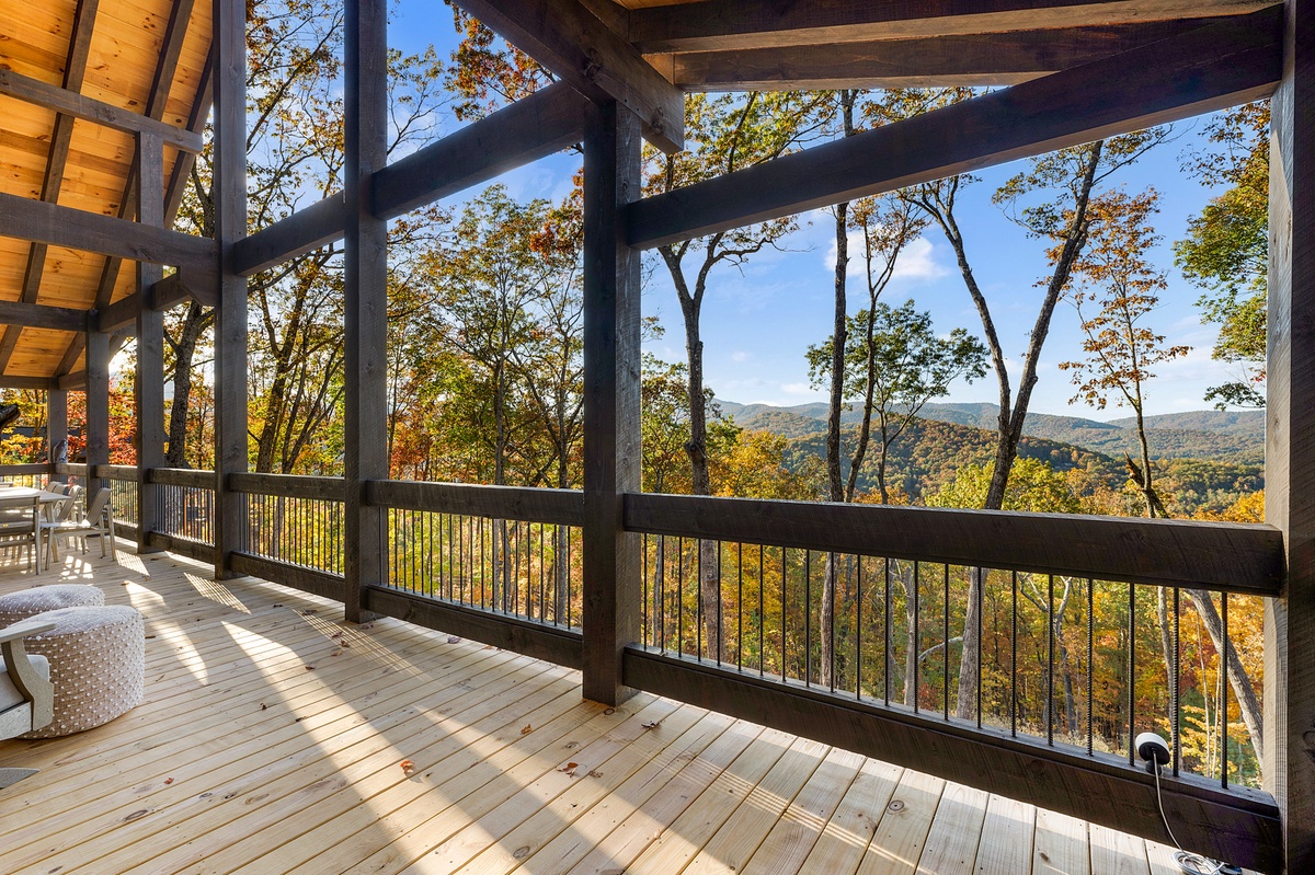 The entry-level wrap around deck is a picturesque setting for sharing meals and time in the raw outdoors. The front portion of the deck includes a dining table for 10 and a couple cozy chairs with ottomans to sip on your favorite beverage soaking in the views. Or you can just chill by the wood burning fireplace in the screen porch section of the deck also with a 65” TV and plenty of comfortable seating with views. For convenience there is a firewood rack and a gas grill just outside the screen porch.
