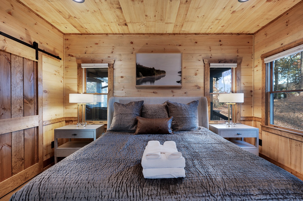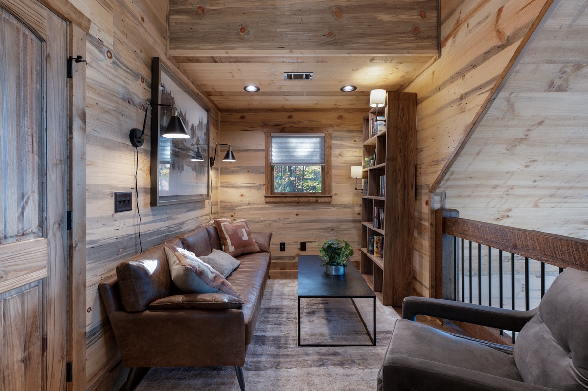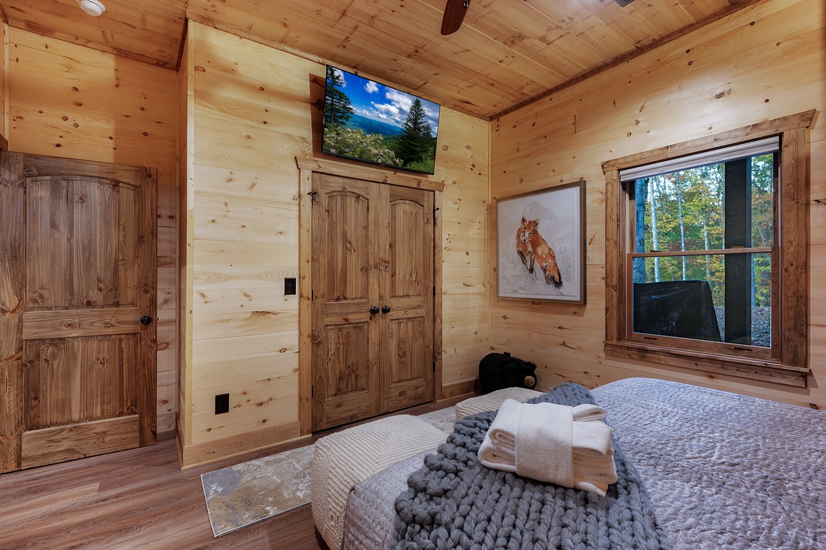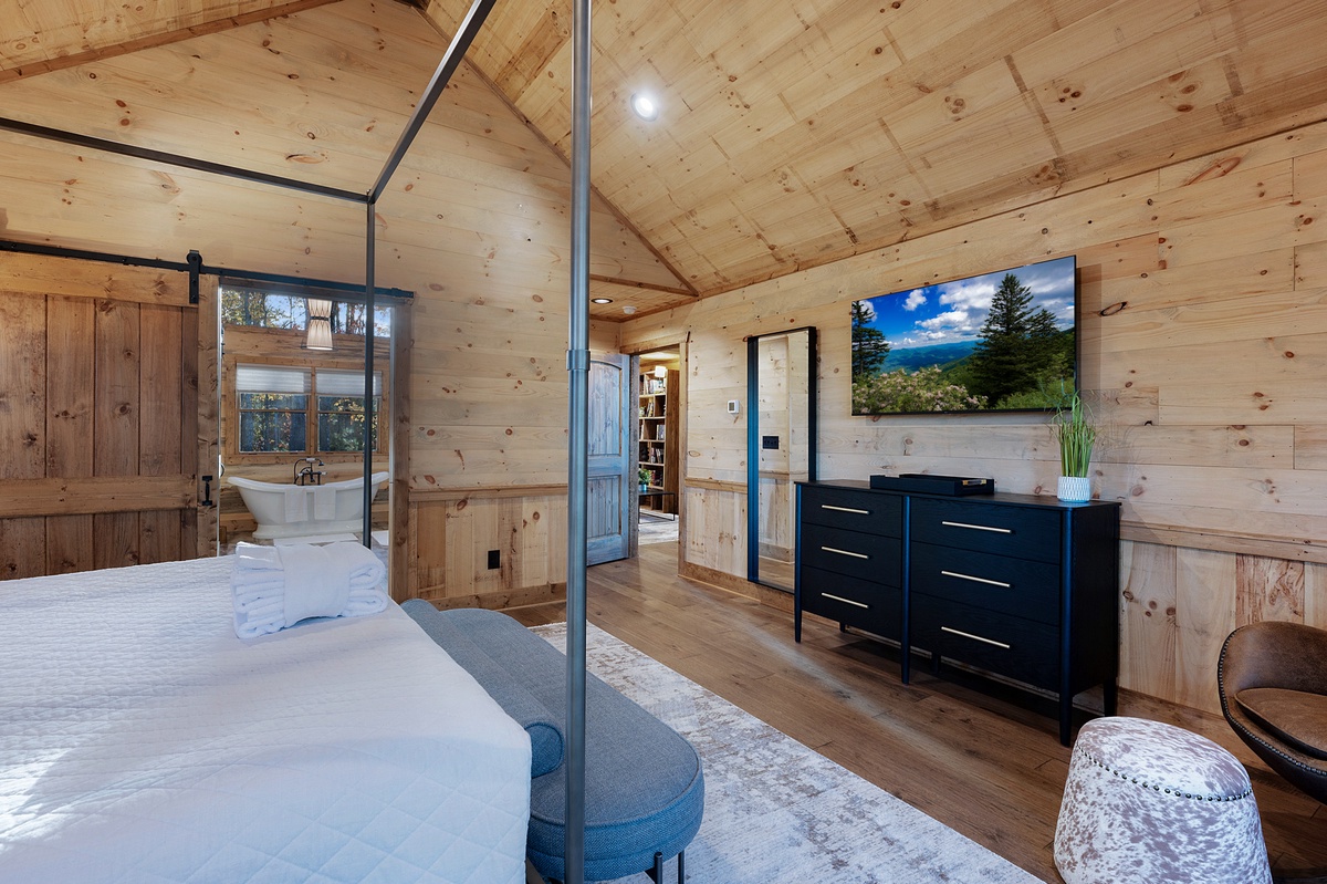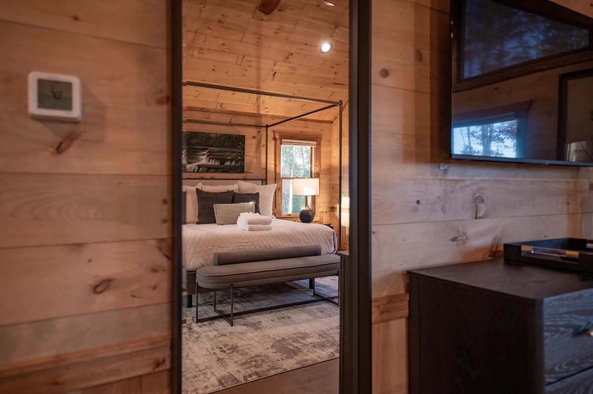 The entry-level wrap around deck is a picturesque setting for sharing meals and time in the raw outdoors. The front portion of the deck includes a dining table for 10 and a couple cozy chairs with ottomans to sip on your favorite beverage soaking in the views. Or you can just chill by the wood burning fireplace in the screen porch section of the deck also with a 65” TV and plenty of comfortable seating with views. For convenience there is a firewood rack and a gas grill just outside the screen porch.
