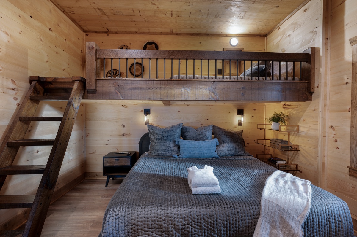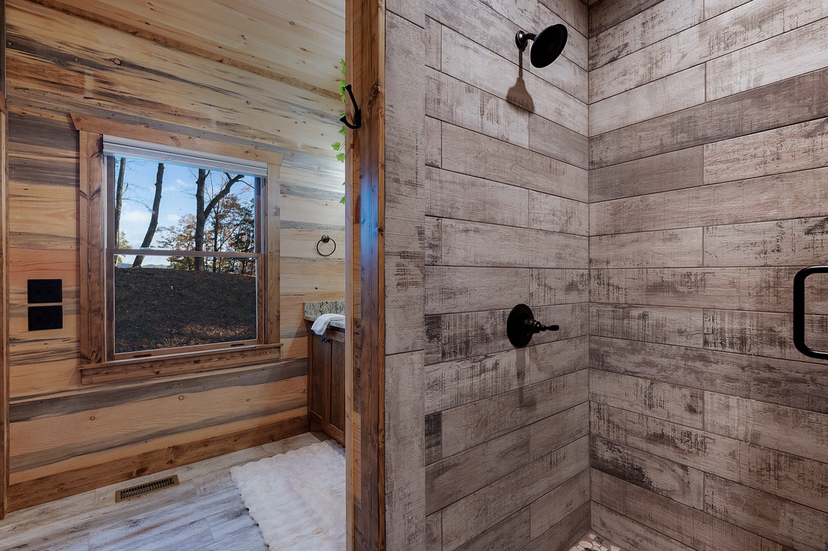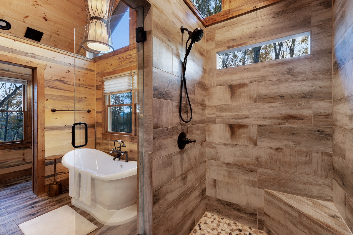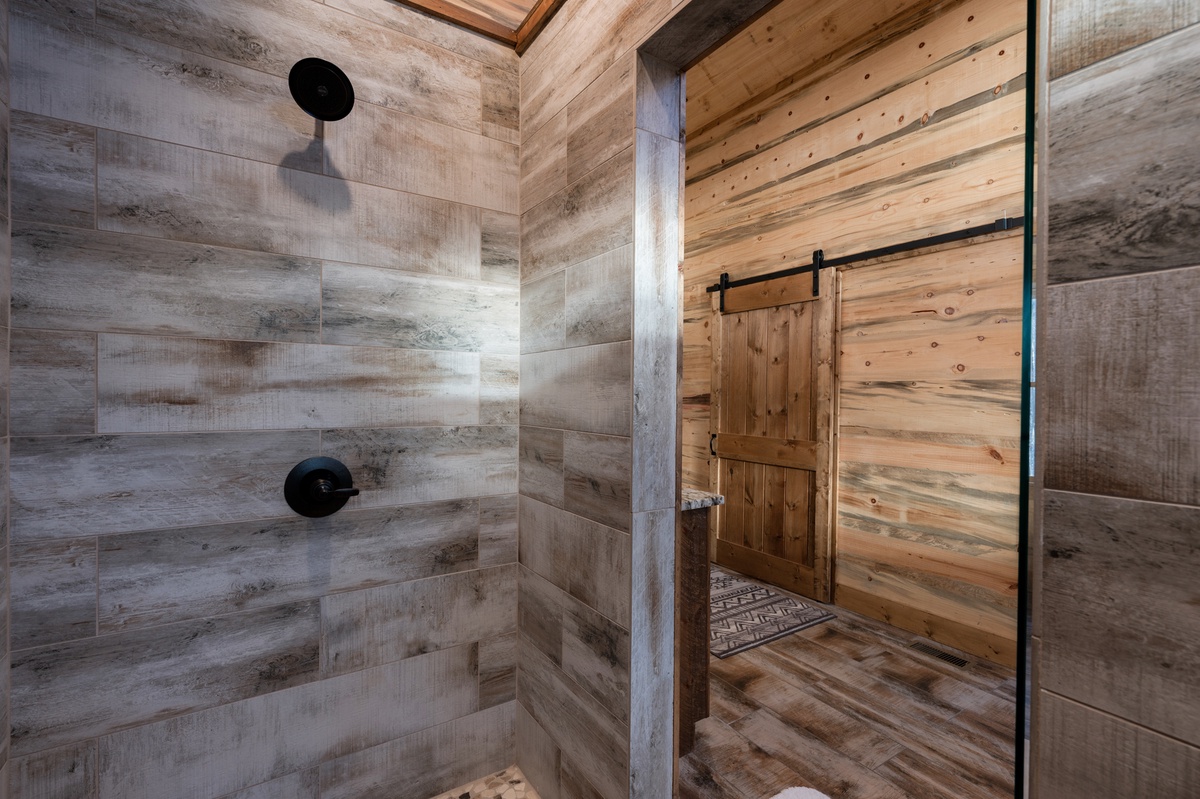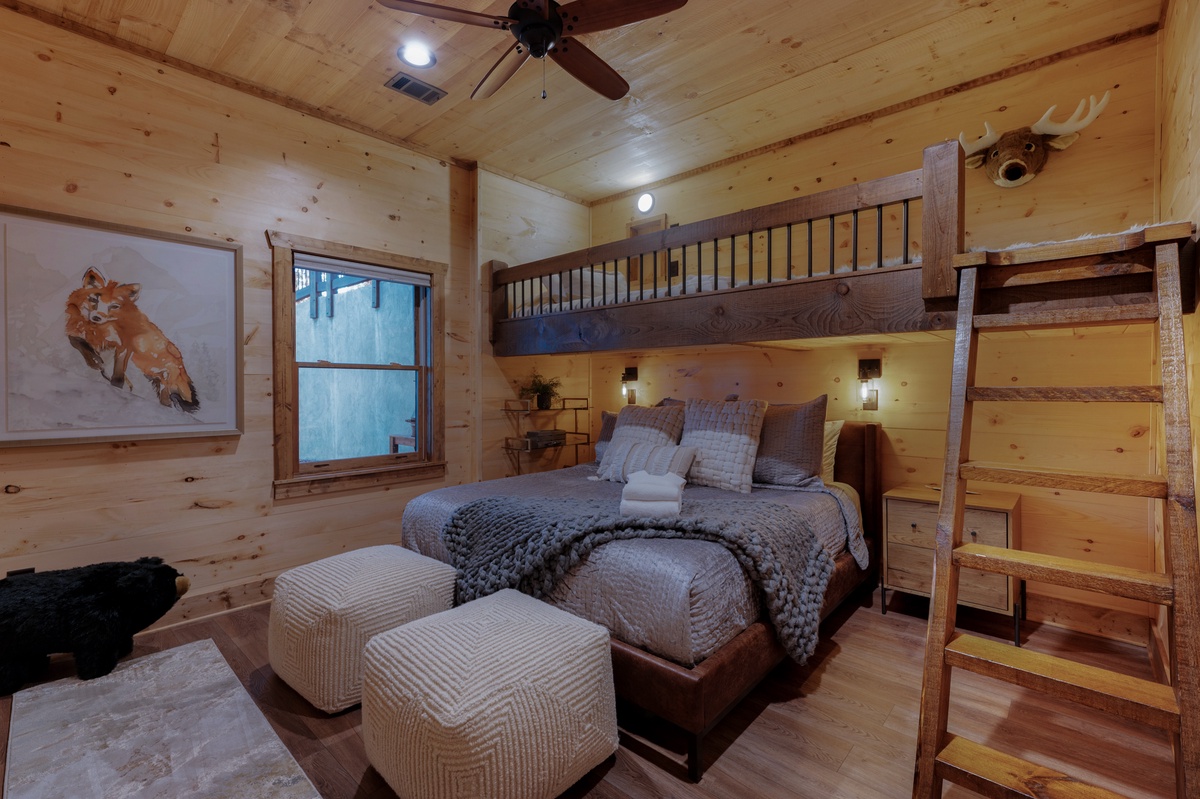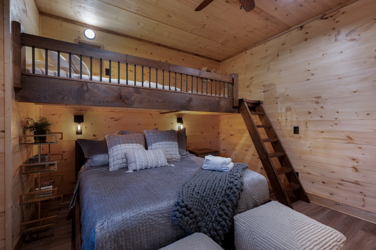 The entry-level wrap around deck is a picturesque setting for sharing meals and time in the raw outdoors. The front portion of the deck includes a dining table for 10 and a couple cozy chairs with ottomans to sip on your favorite beverage soaking in the views. Or you can just chill by the wood burning fireplace in the screen porch section of the deck also with a 65” TV and plenty of comfortable seating with views. For convenience there is a firewood rack and a gas grill just outside the screen porch.