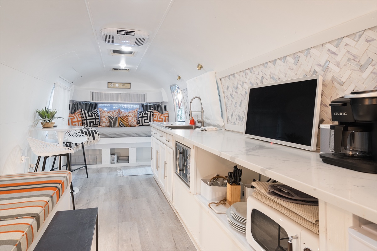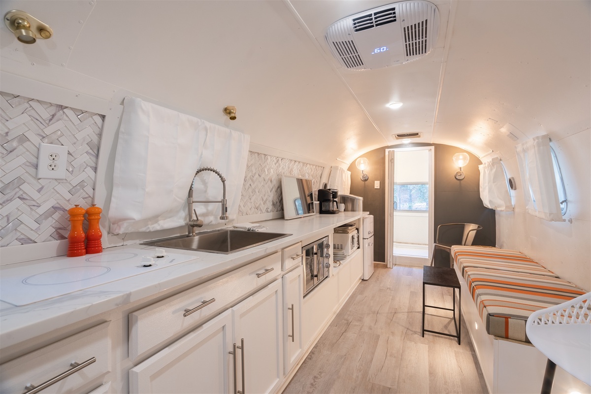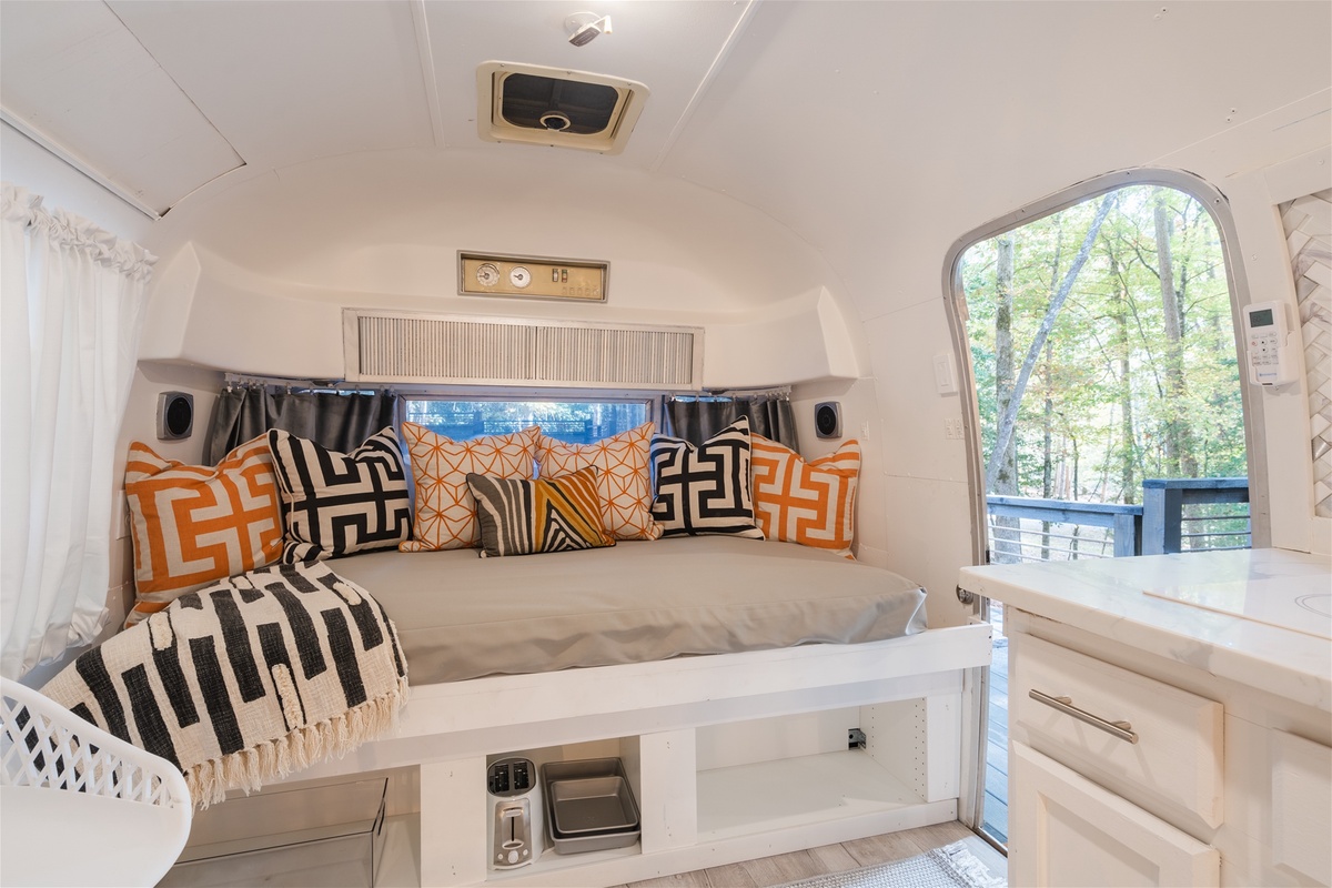 Just across the way, enjoy the essential kitchen amenities in the Airstream. Cook your favorite meals with effortless poise on the spanning countertop and retro designed appliances with full functionality. Then enjoy lounging on the daybed with an afternoon nap in mind. With a fully equipped heating and air system you will surely find comfort, surrounded by nature or cozied up indoors, looking out onto nature.