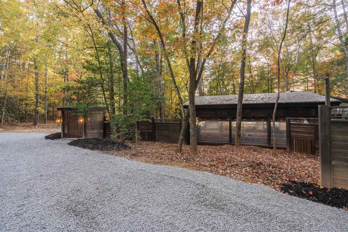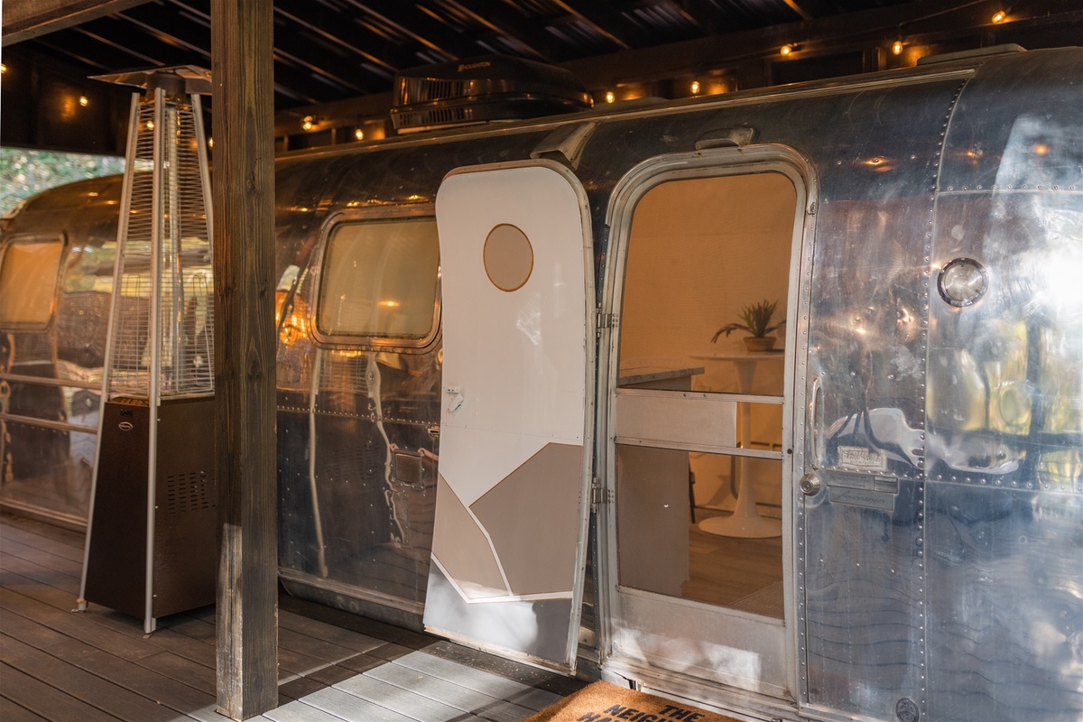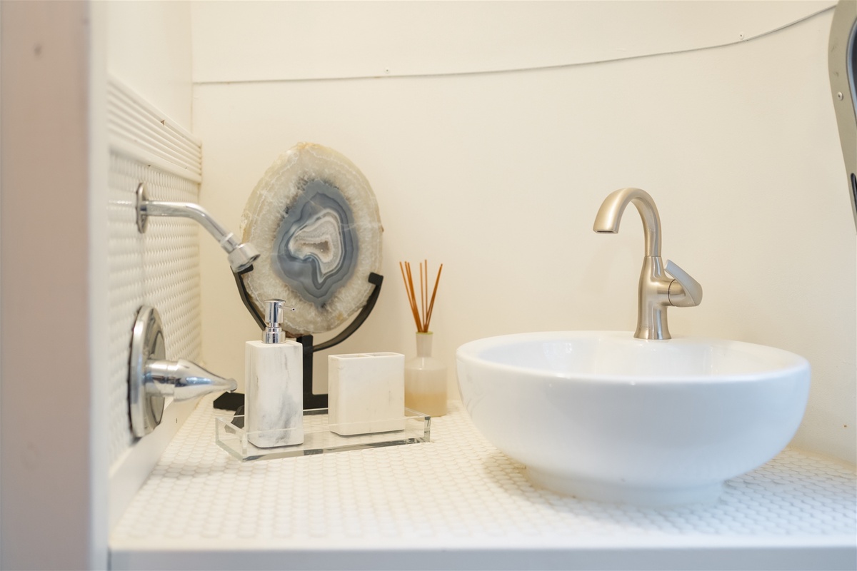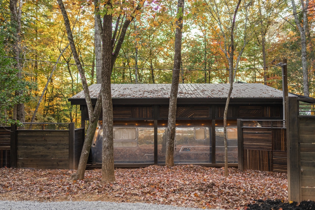 Just across the way, enjoy the essential kitchen amenities in the Airstream. Cook your favorite meals with effortless poise on the spanning countertop and retro designed appliances with full functionality. Then enjoy lounging on the daybed with an afternoon nap in mind. With a fully equipped heating and air system you will surely find comfort, surrounded by nature or cozied up indoors, looking out onto nature.