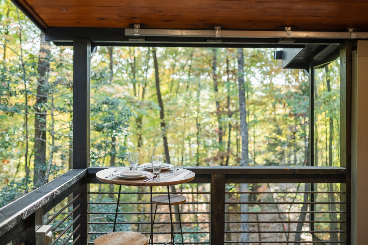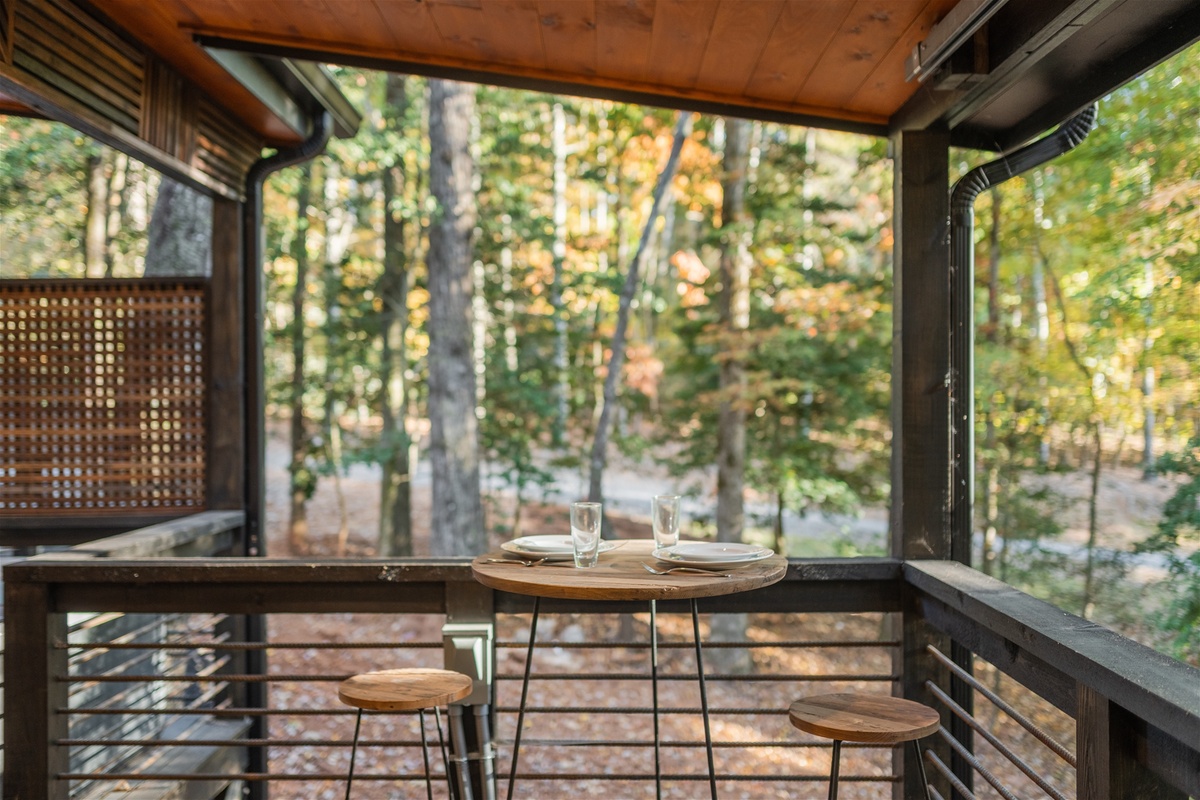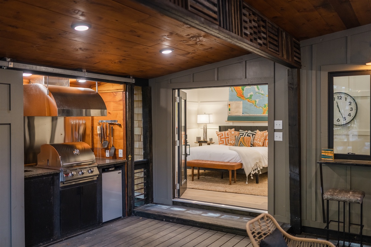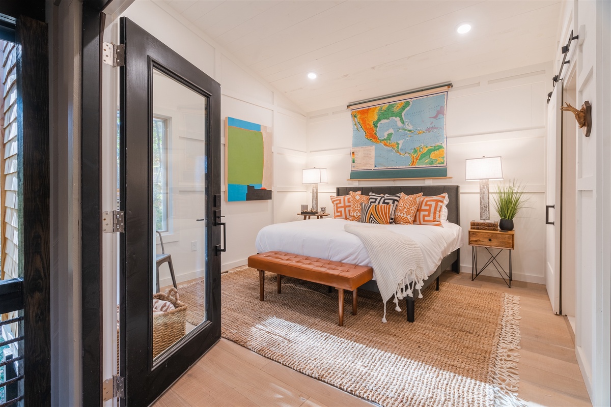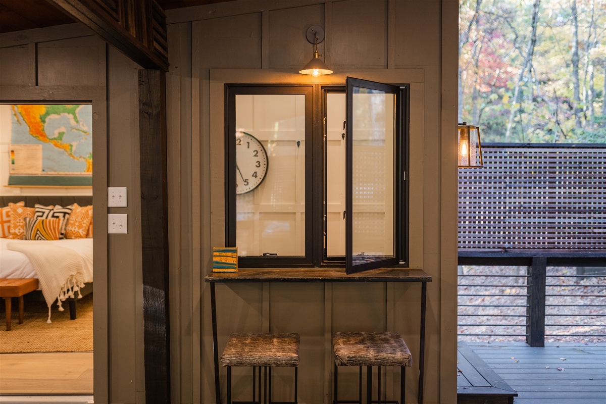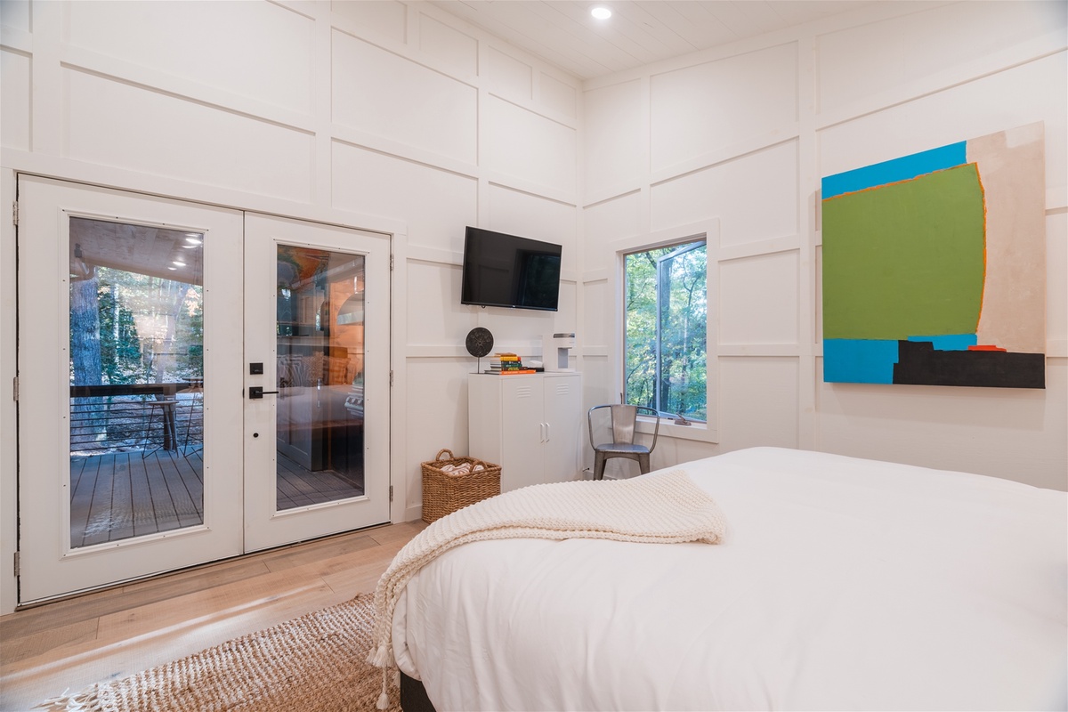 Swing open the french style doors and fall into the comfortable embrace of the modern king bedroom suite just steps from the outdoor living area. Sleep with the windows open to enjoy the fresh mountain air or close them up and enjoy the silence and private forest views that Easy Tiger provides. The suite has a full bathroom, and breakfast nook area, for those slow and easy mornings sipping coffee and engaging in easy conversation with your loved one.