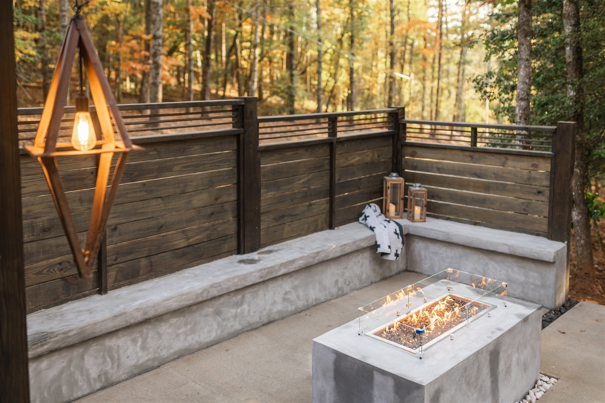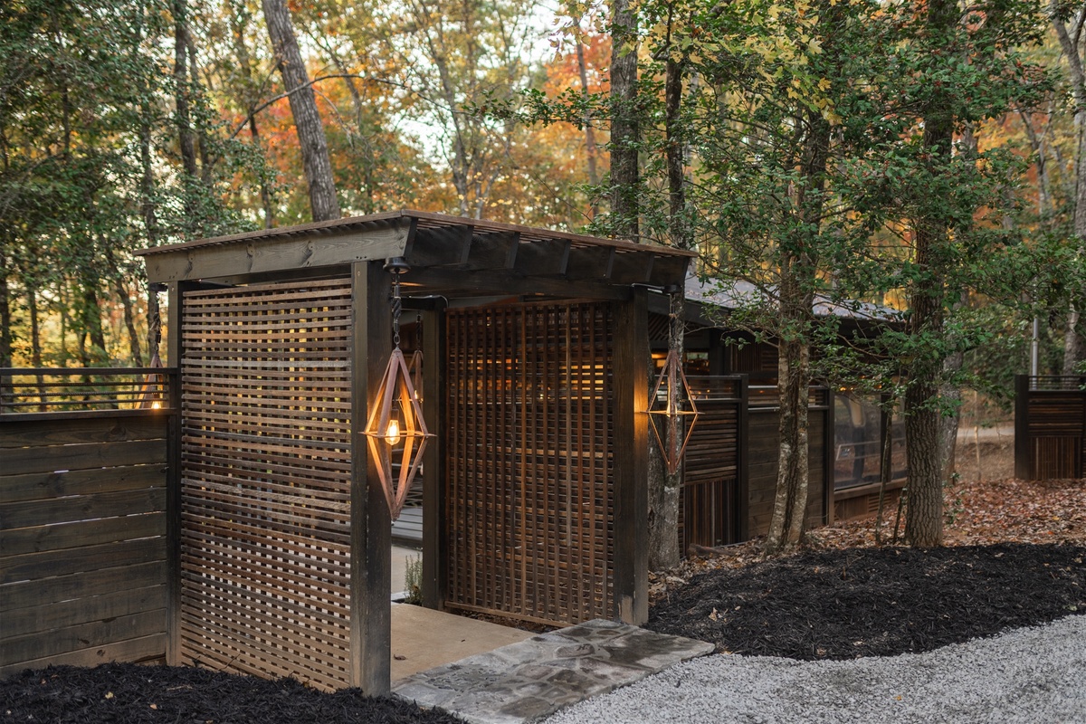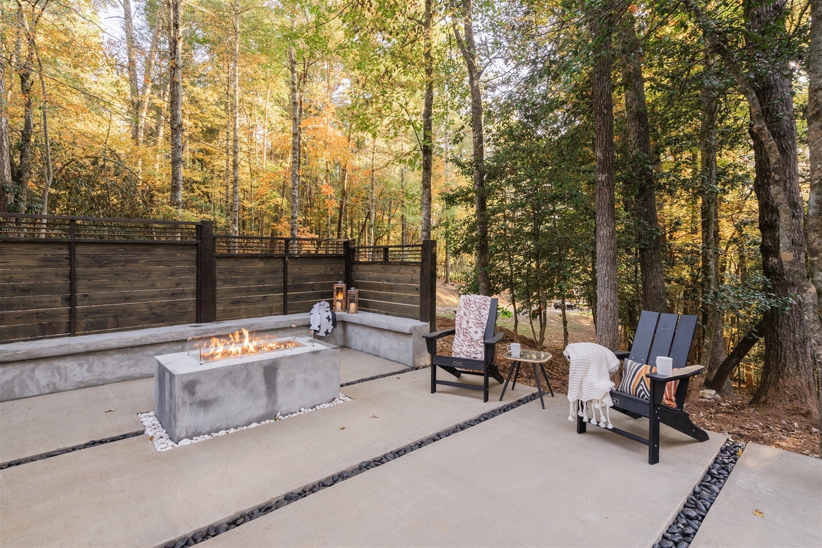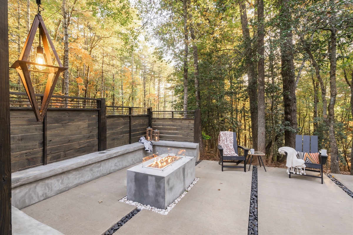 Stepping through the wooden weave archway you find yourself in a nature lover’s paradise. A concrete gas fire table surrounded by bench seating for a late night spent gazing at the stars and listening to the crickets' charming melodies. Wander onto the deck to find an outdoor living area outfitted with a hot tub to sooth your body and mind, lounge furniture, a TV, and built-in grill; all surrounded by the best outdoor heating units for those cooler mountain mornings. Spend your vacation in the enchantments of nature, as you lounge outdoors, watching your favorite movie, or catching up on the highly recommended books you had planned to indulge in.