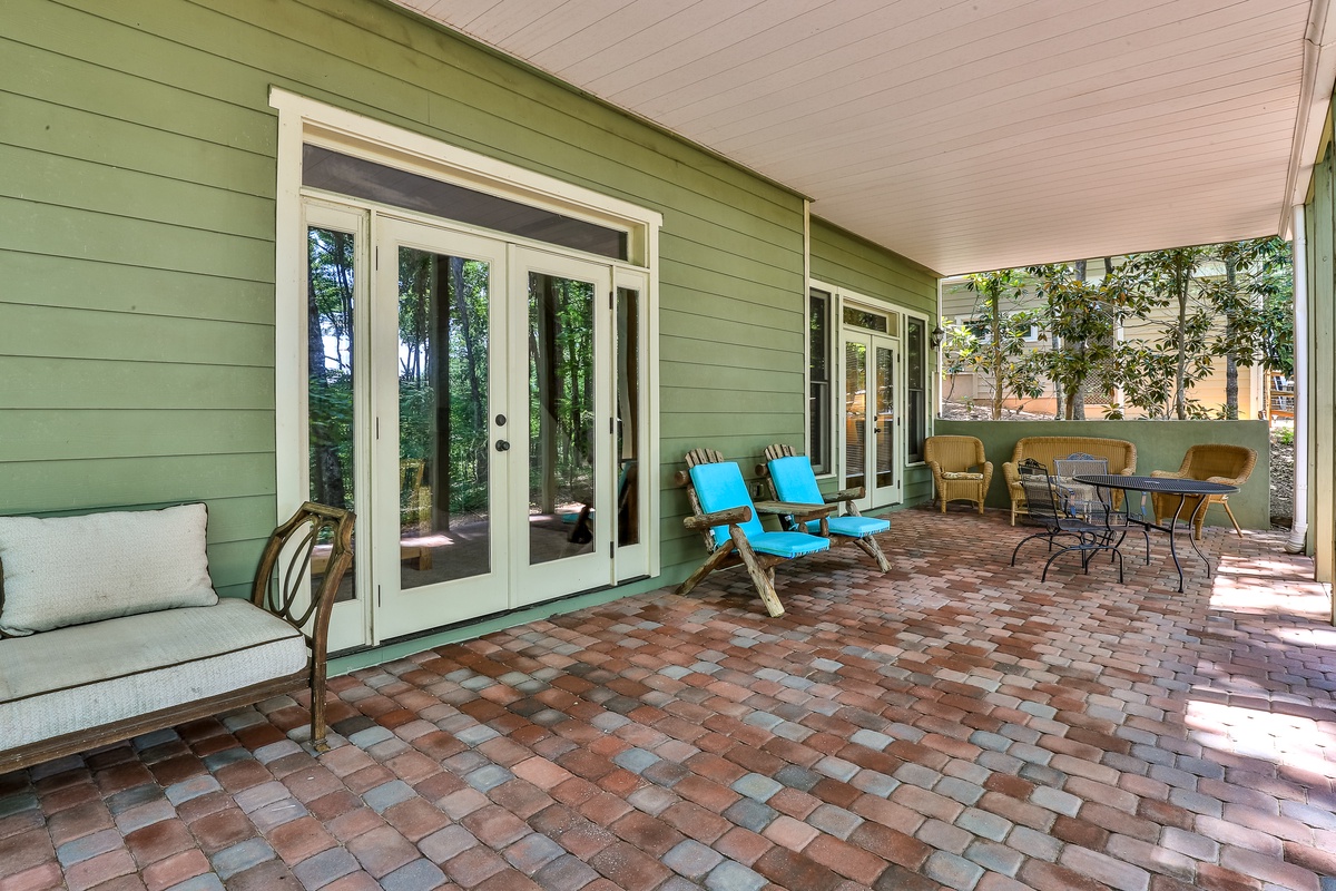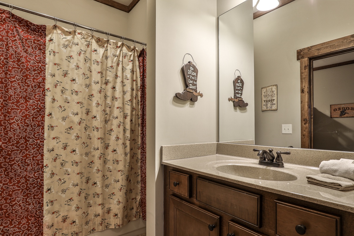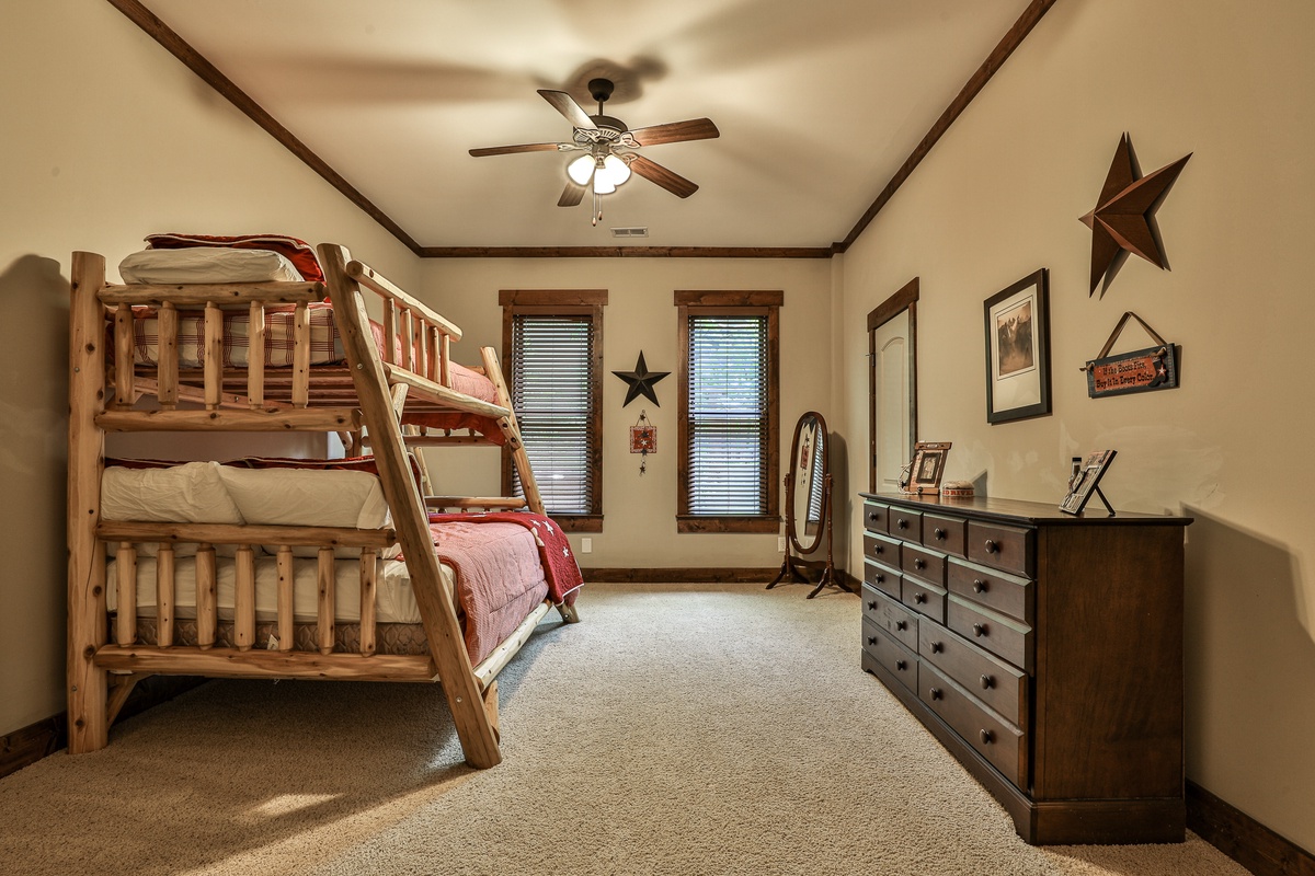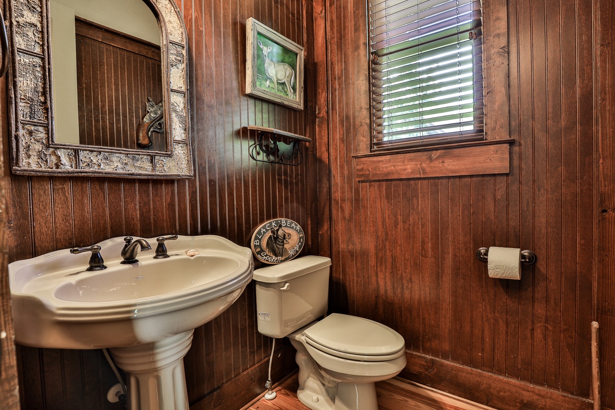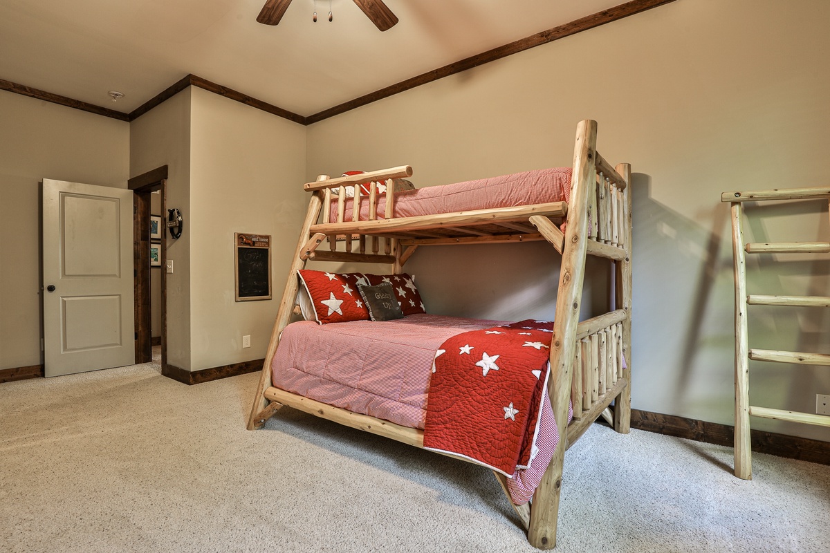 Upstairs, you'll find a king bedroom with a bathroom that includes a walk-in shower, as well as an office in the loft. This bedroom also offers a private balcony for complete private bliss. Downstairs, there is a queen bedroom and a bunk bed bedroom (one twin and one double), each with its own bathroom. The rec room features a gas fireplace, an HD flat-screen TV, a microwave, a refrigerator, and a wine cooler. Wander out to the lower-level terrace with brick laid flooring, a separate seating area with classy Victorian style lounging daybed/sofa.