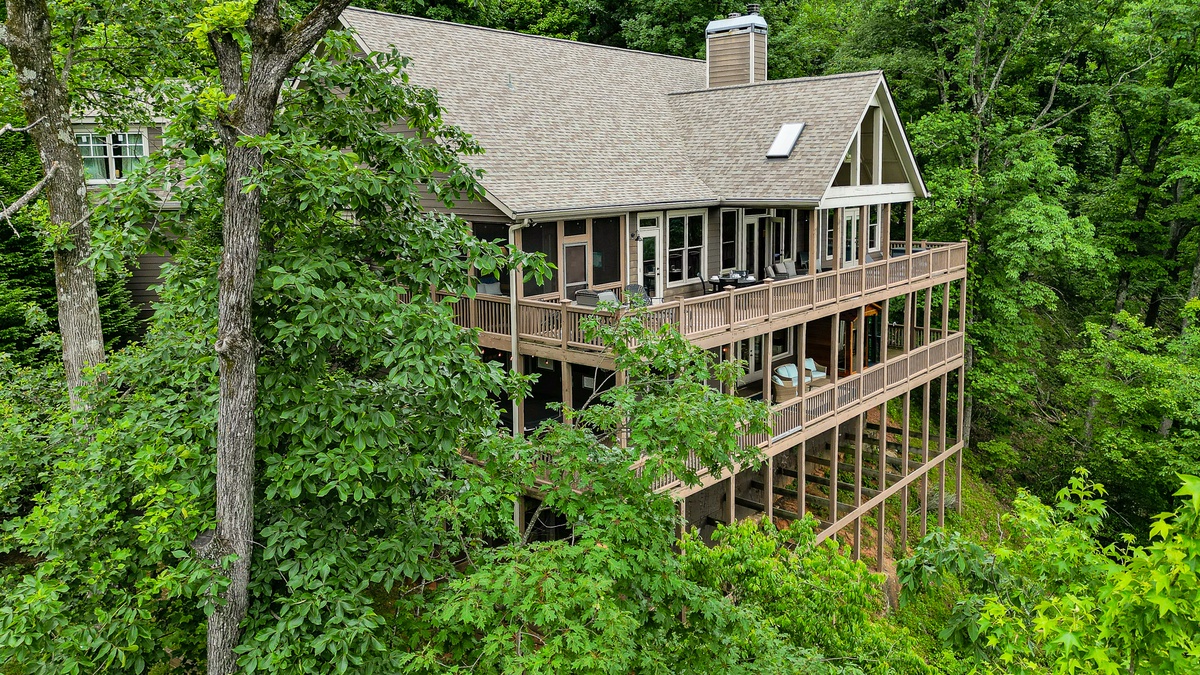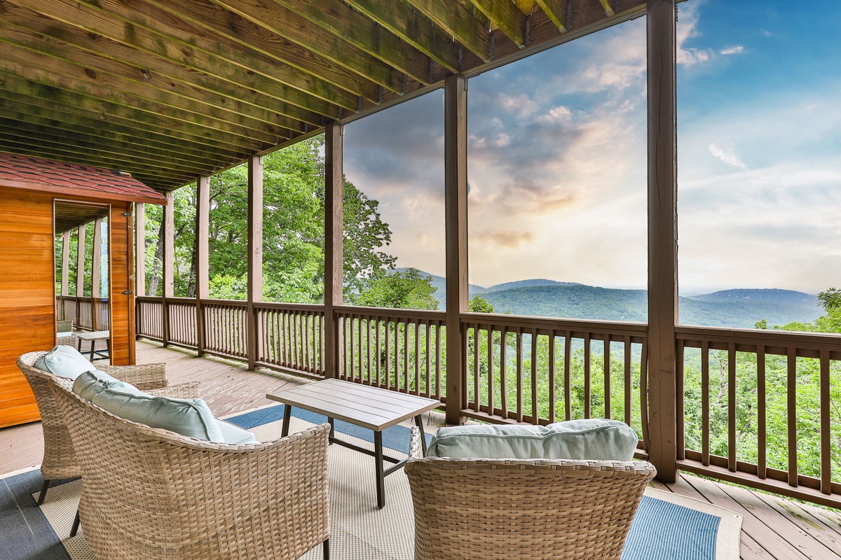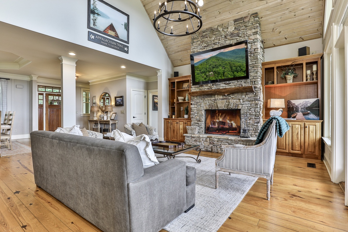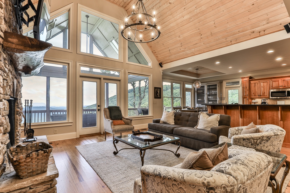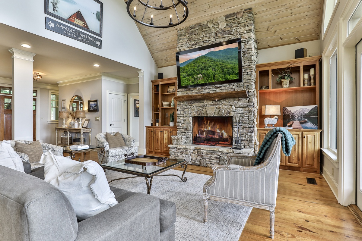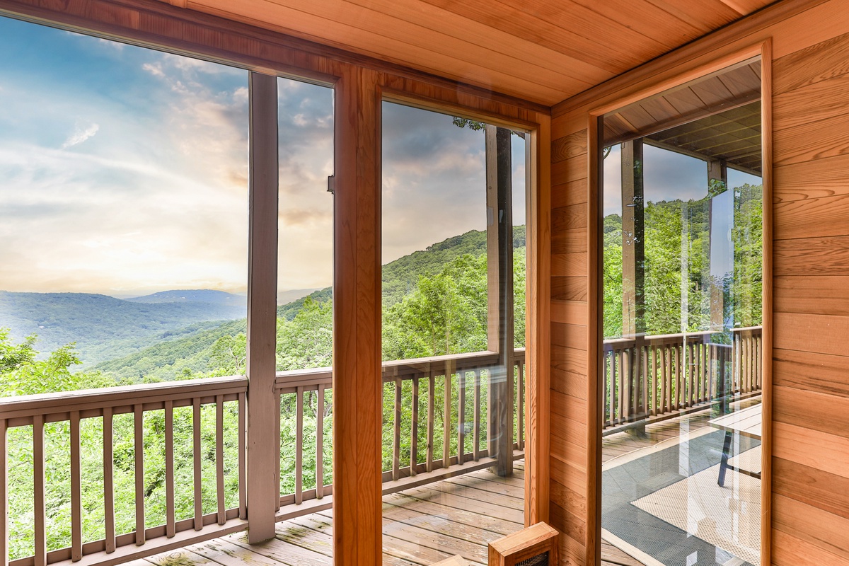 The living area is open-plan, with living, dining, and kitchen areas opening to a wall of windows showcasing mountain and wooded views. A cozy stacked stone wood-burning fireplace, comfortable seating, and a TV make it perfect for game nights or gatherings. The outdoor decks offer gorgeous mountain views, relaxation chairs, a dining table, and a large gas grill. A beautiful screened porch with a swinging bench invites you to read a book. Additional outdoor living spaces provide quiet spots for relaxation, enjoying the view, and access to the sauna and hot tub.