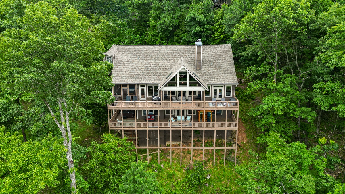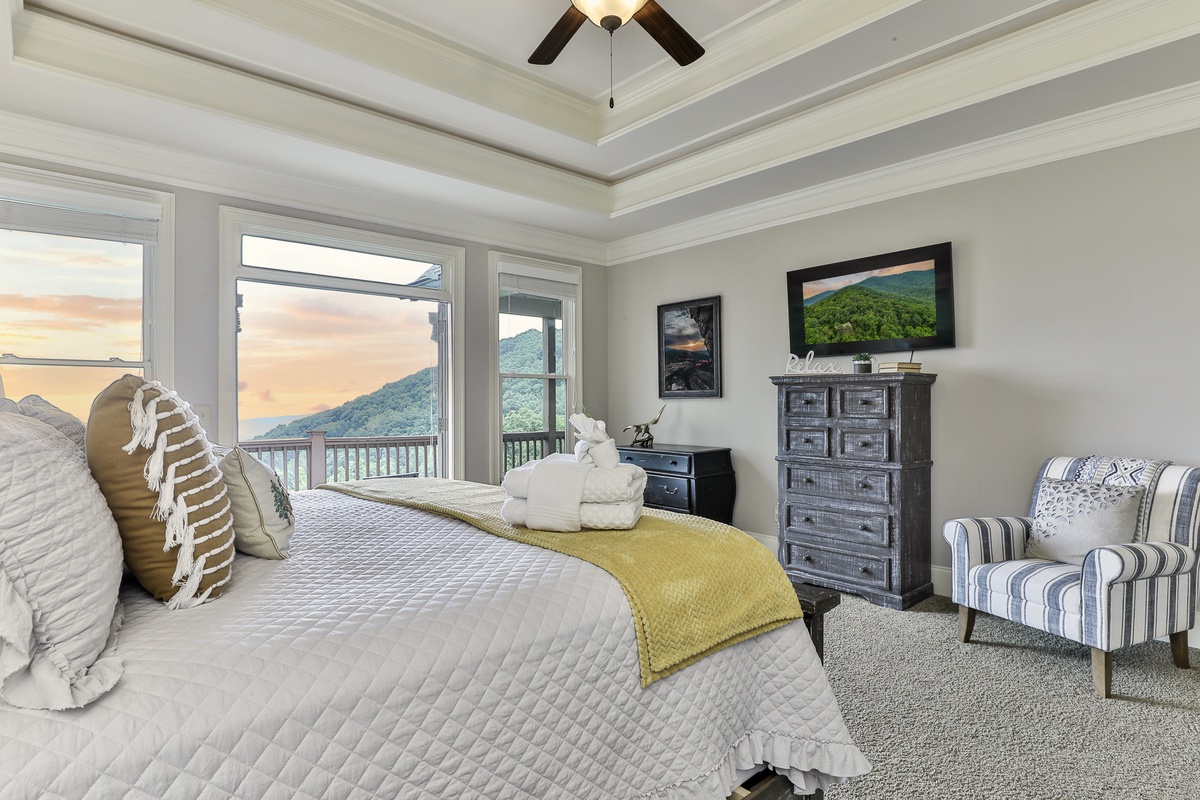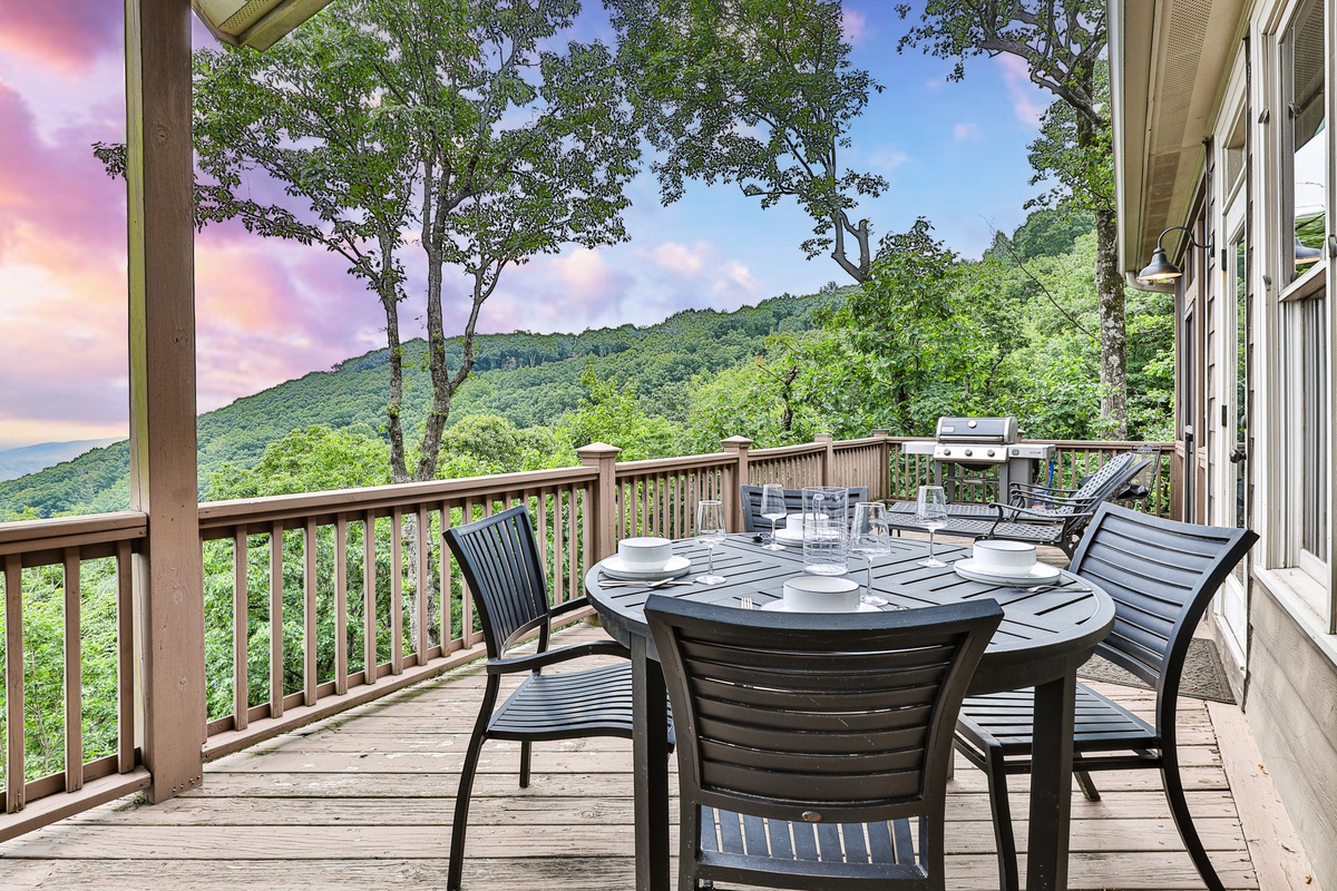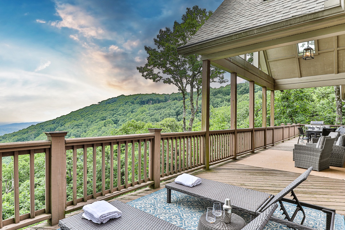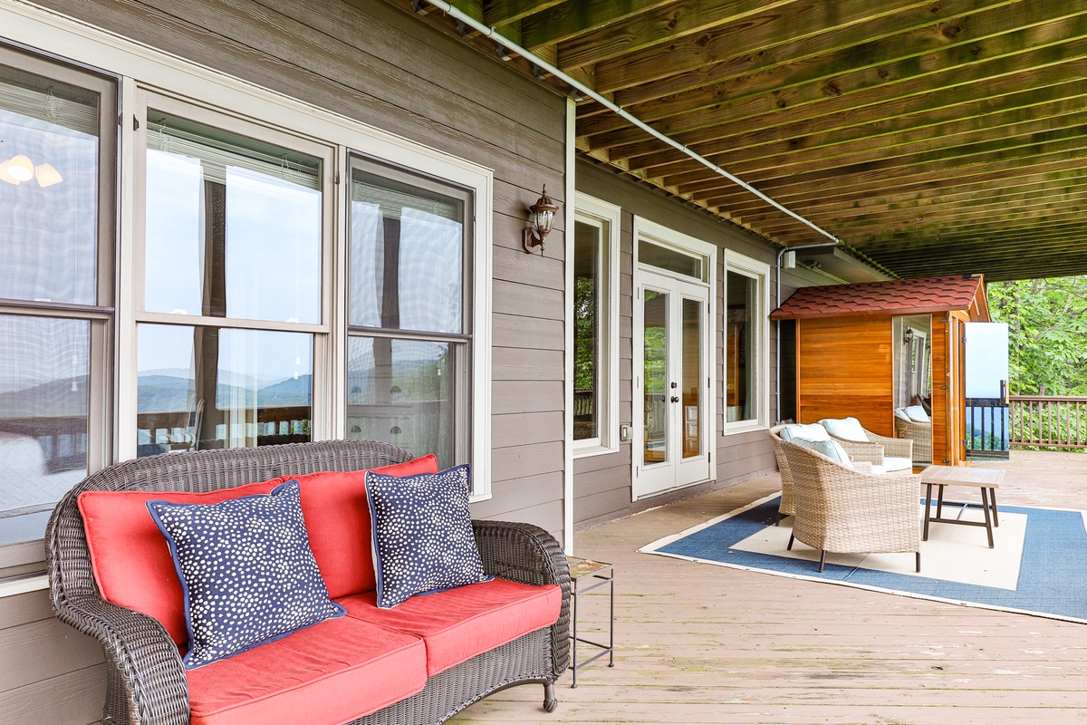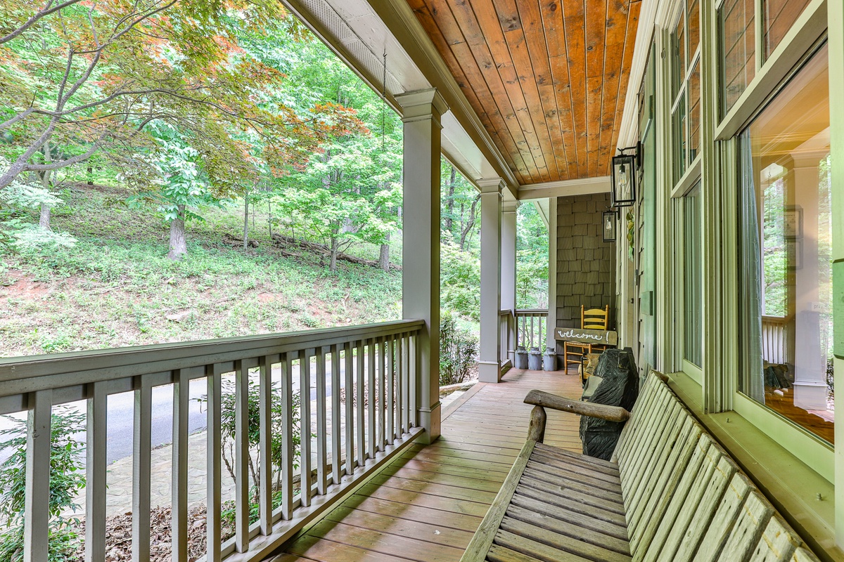 The living area is open-plan, with living, dining, and kitchen areas opening to a wall of windows showcasing mountain and wooded views. A cozy stacked stone wood-burning fireplace, comfortable seating, and a TV make it perfect for game nights or gatherings. The outdoor decks offer gorgeous mountain views, relaxation chairs, a dining table, and a large gas grill. A beautiful screened porch with a swinging bench invites you to read a book. Additional outdoor living spaces provide quiet spots for relaxation, enjoying the view, and access to the sauna and hot tub.