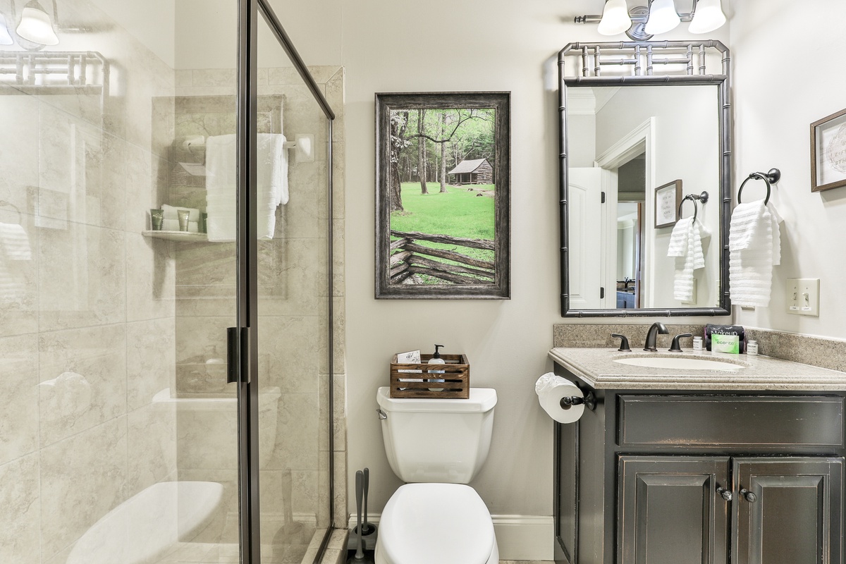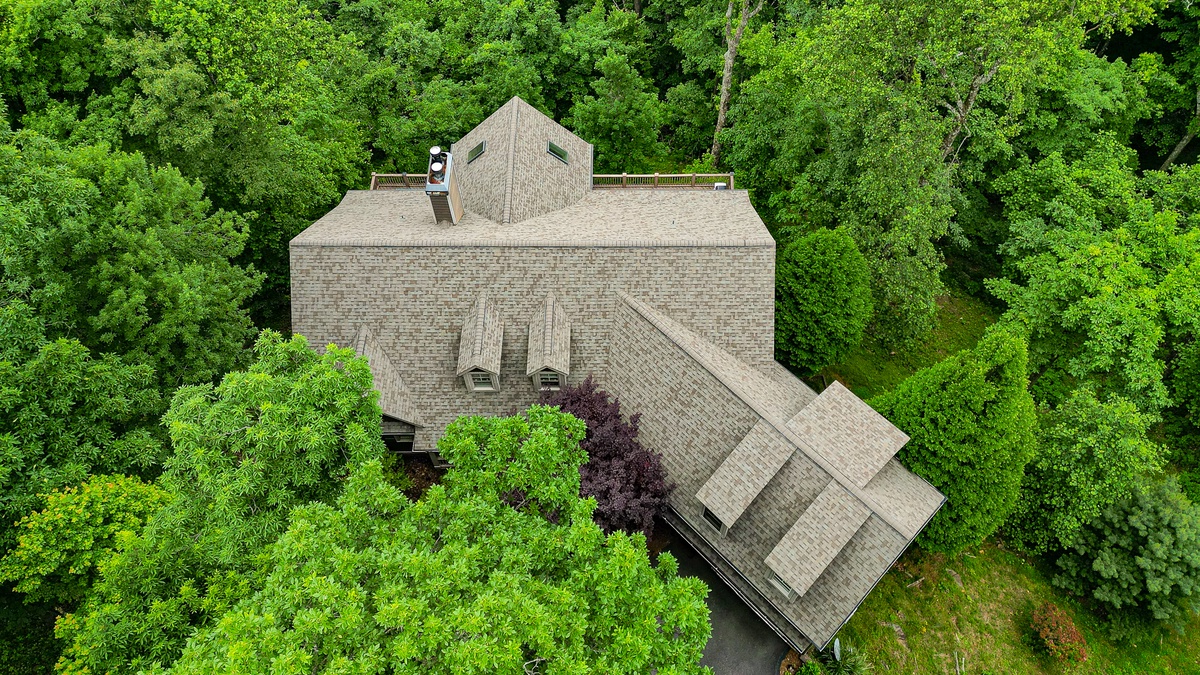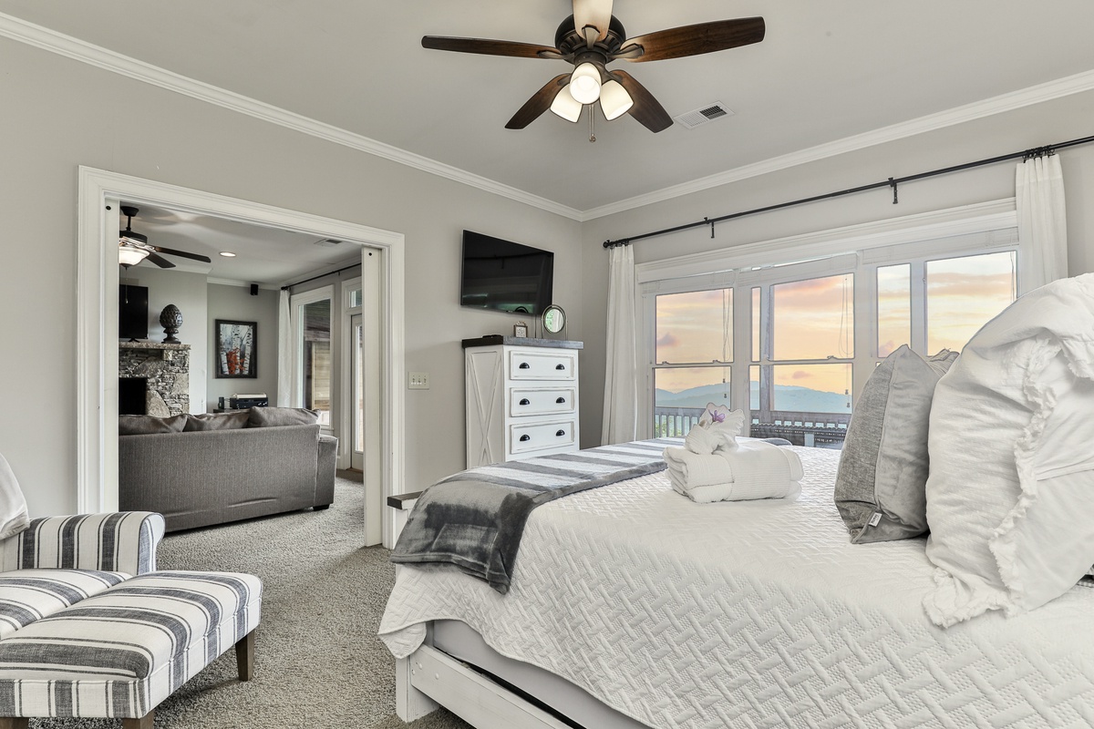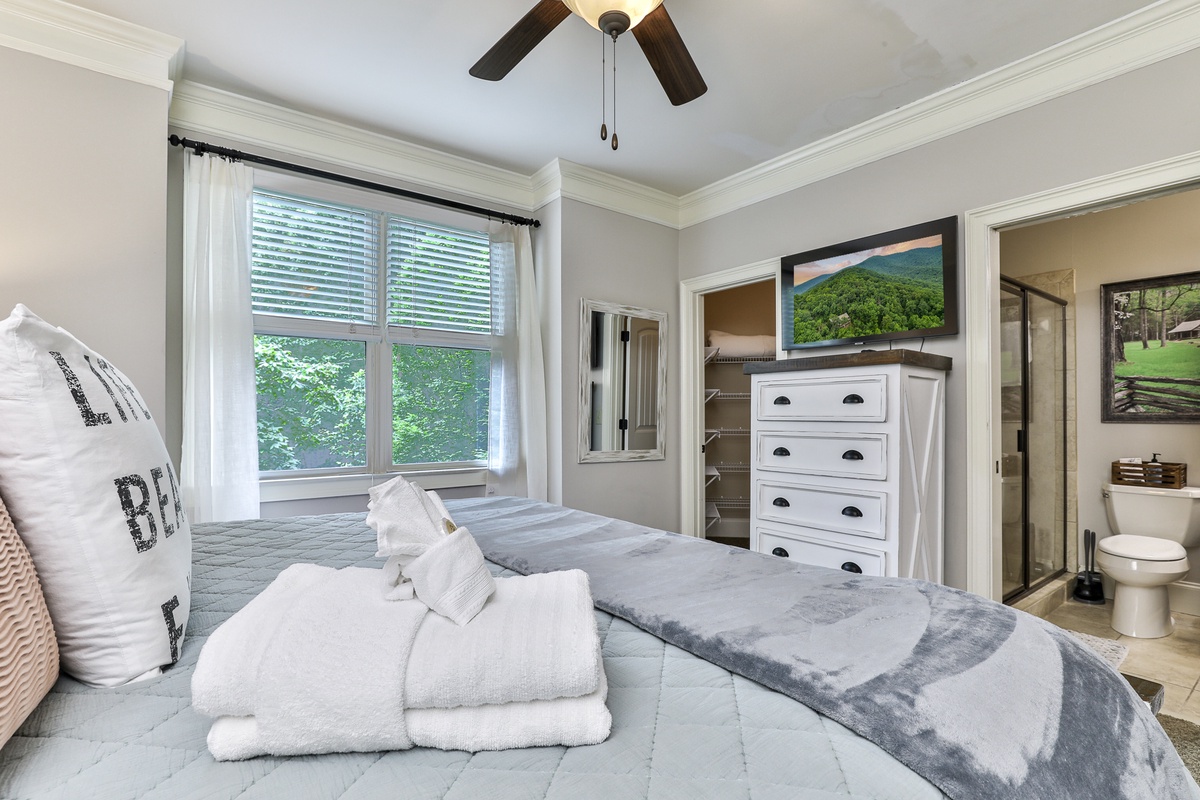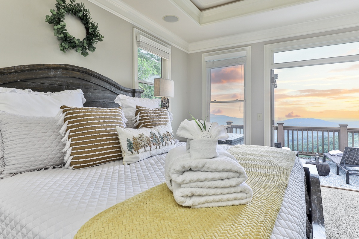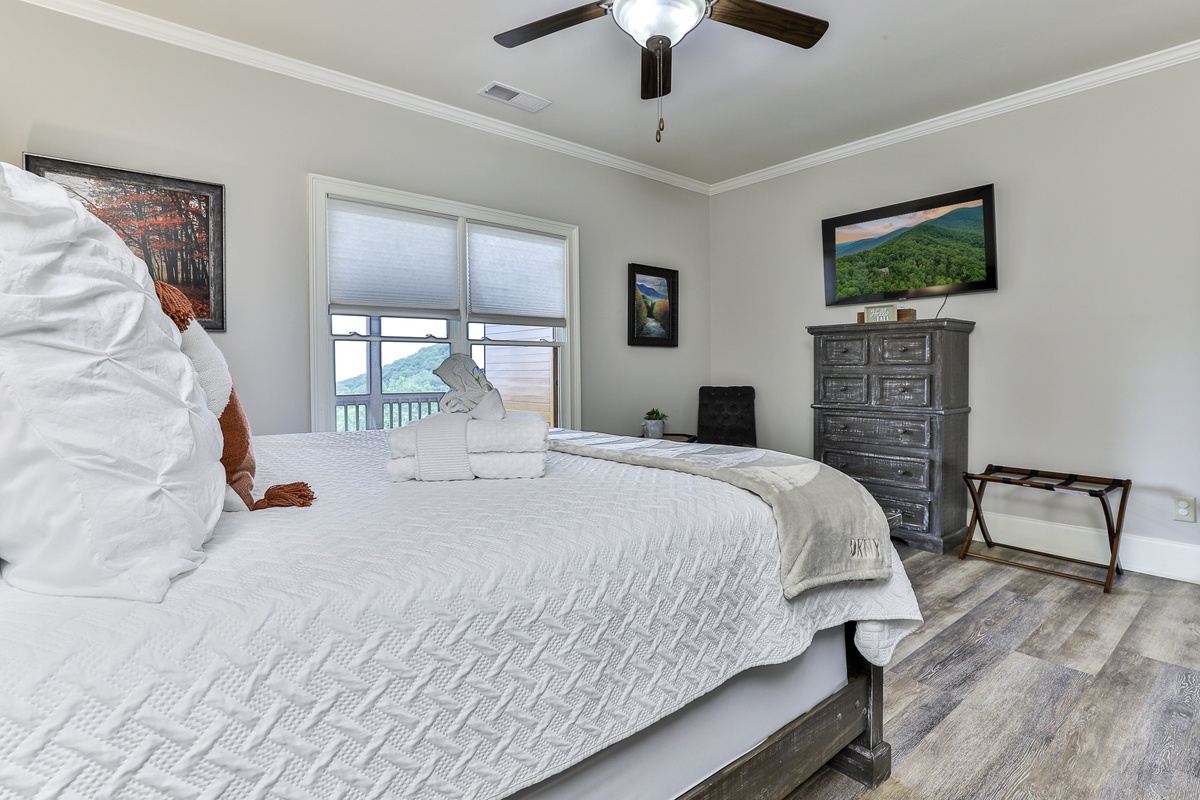 The living area is open-plan, with living, dining, and kitchen areas opening to a wall of windows showcasing mountain and wooded views. A cozy stacked stone wood-burning fireplace, comfortable seating, and a TV make it perfect for game nights or gatherings. The outdoor decks offer gorgeous mountain views, relaxation chairs, a dining table, and a large gas grill. A beautiful screened porch with a swinging bench invites you to read a book. Additional outdoor living spaces provide quiet spots for relaxation, enjoying the view, and access to the sauna and hot tub.