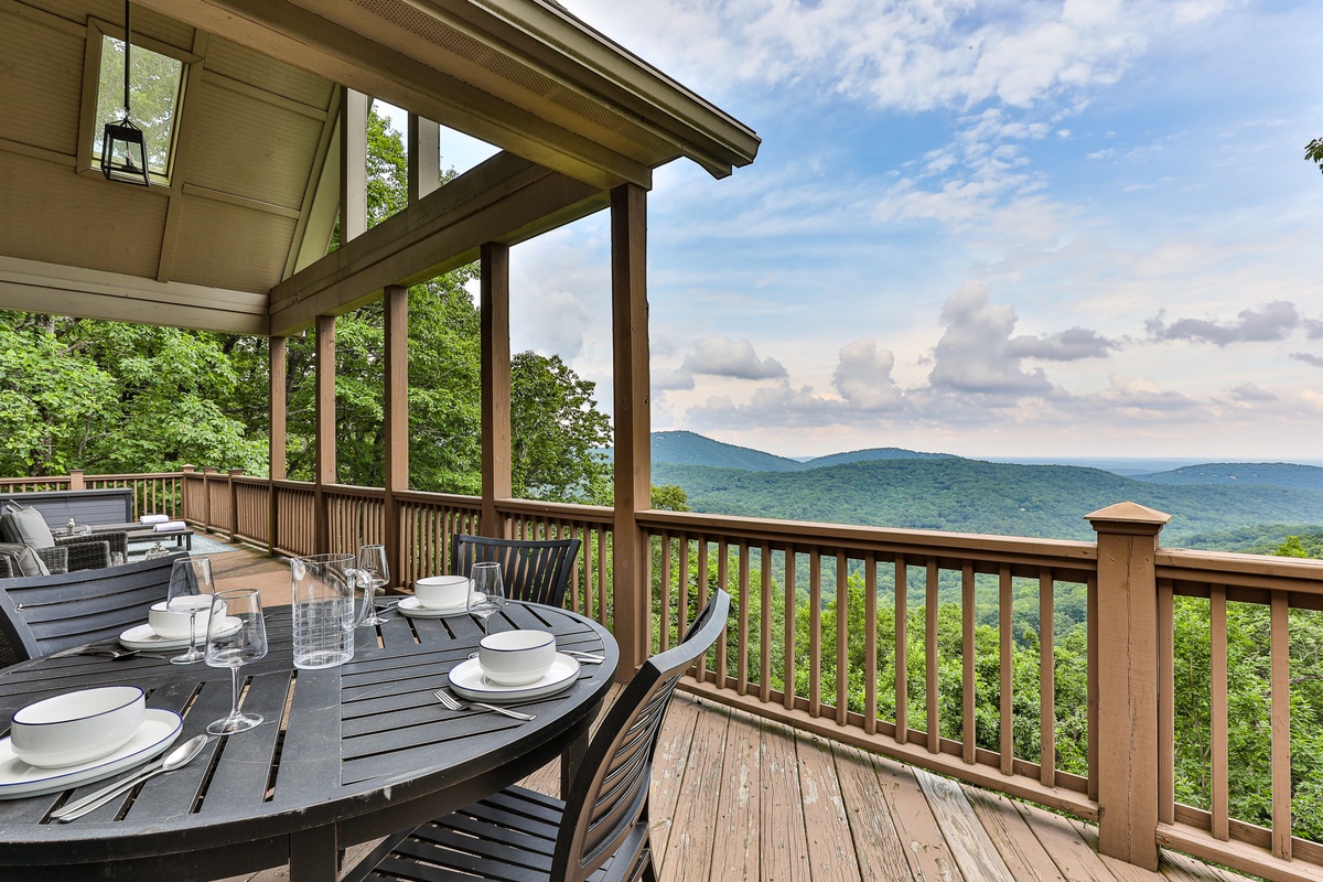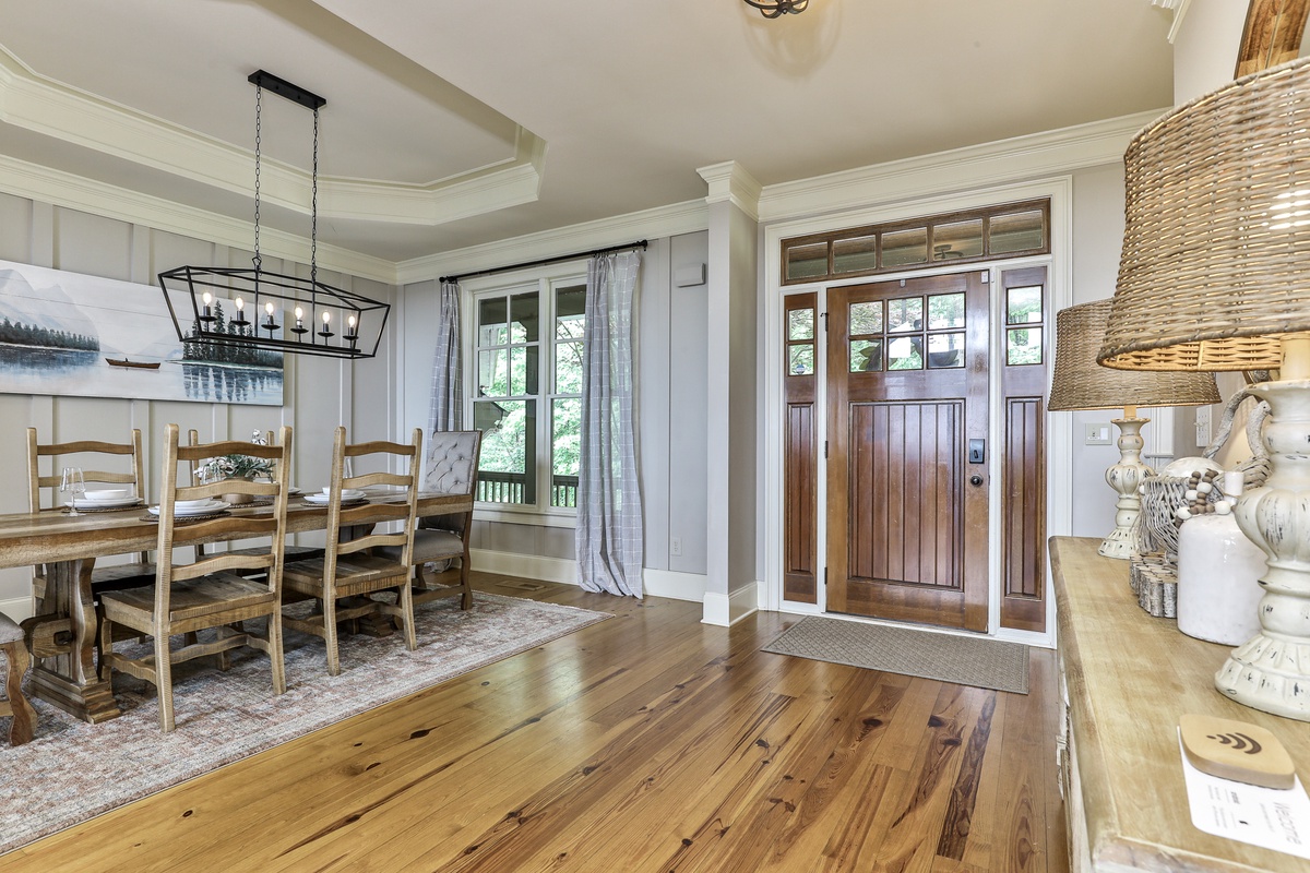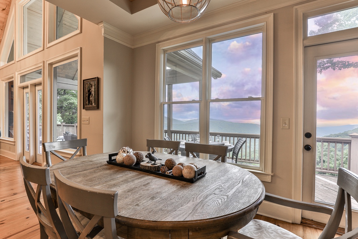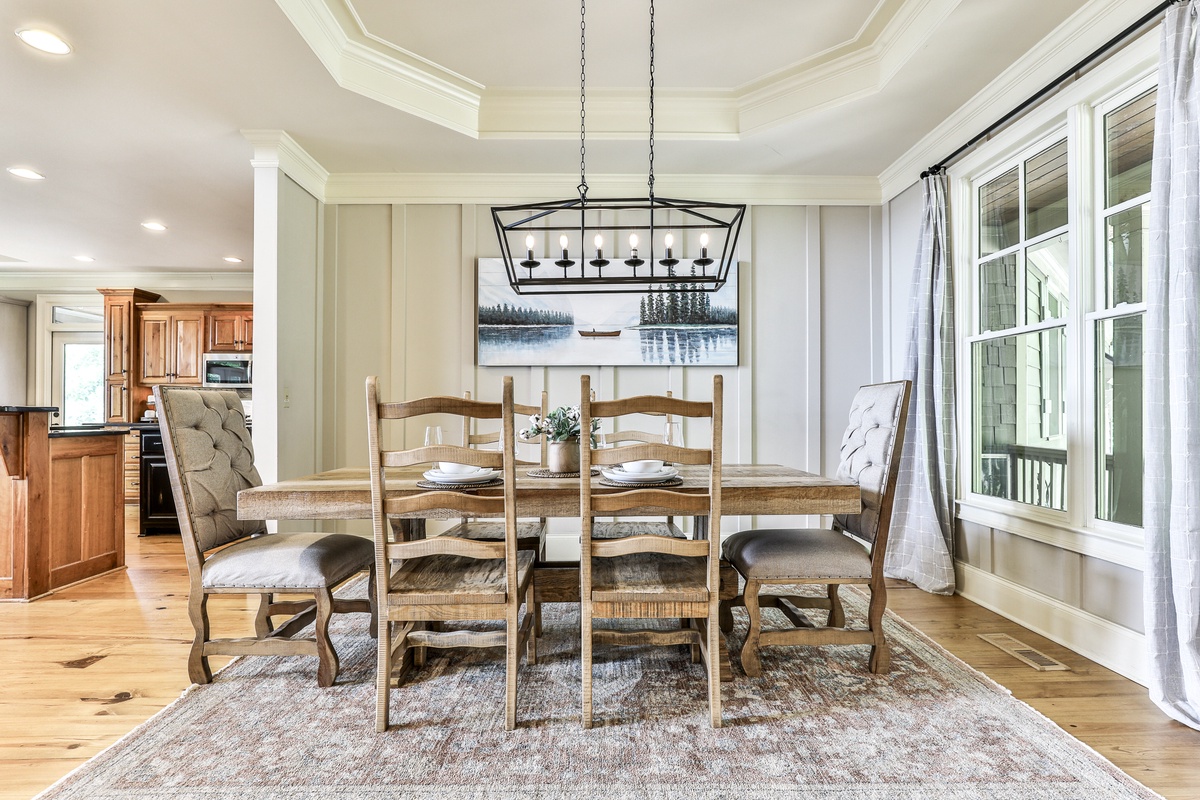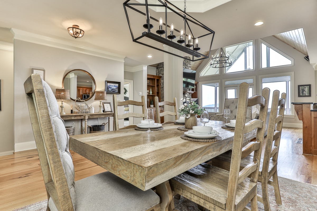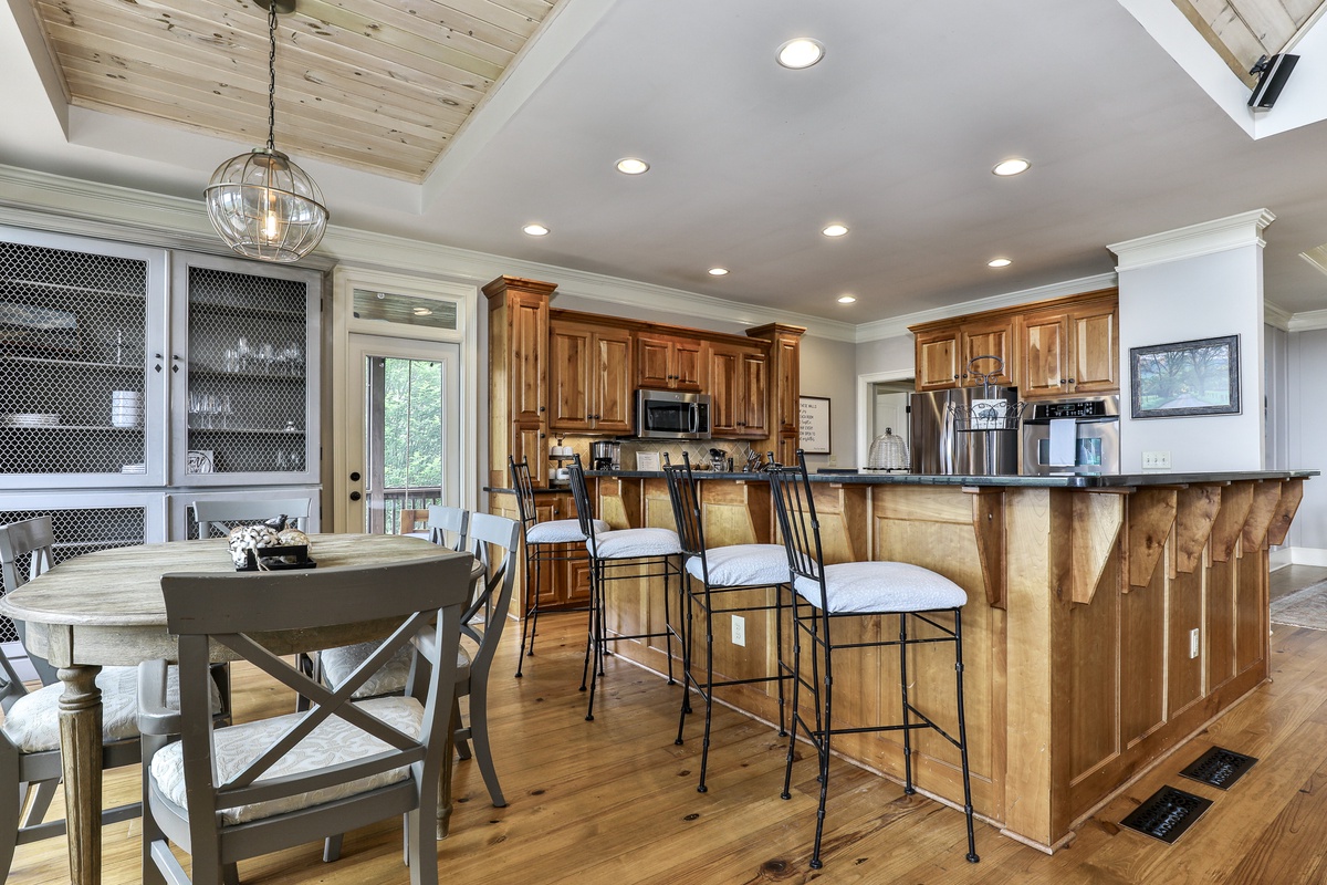 This beautiful open-plan lodge features a well-appointed kitchen, ideal for preparing meals, coffee, or snacks. The kitchen includes Keurig and drip coffee makers and opens to the living space, allowing chefs to be part of the fun while enjoying nature views. The dining room seats six, with additional seating for ten, offering stunning mealtime views. Outside, the deck provides more seating for dining or drinks.
