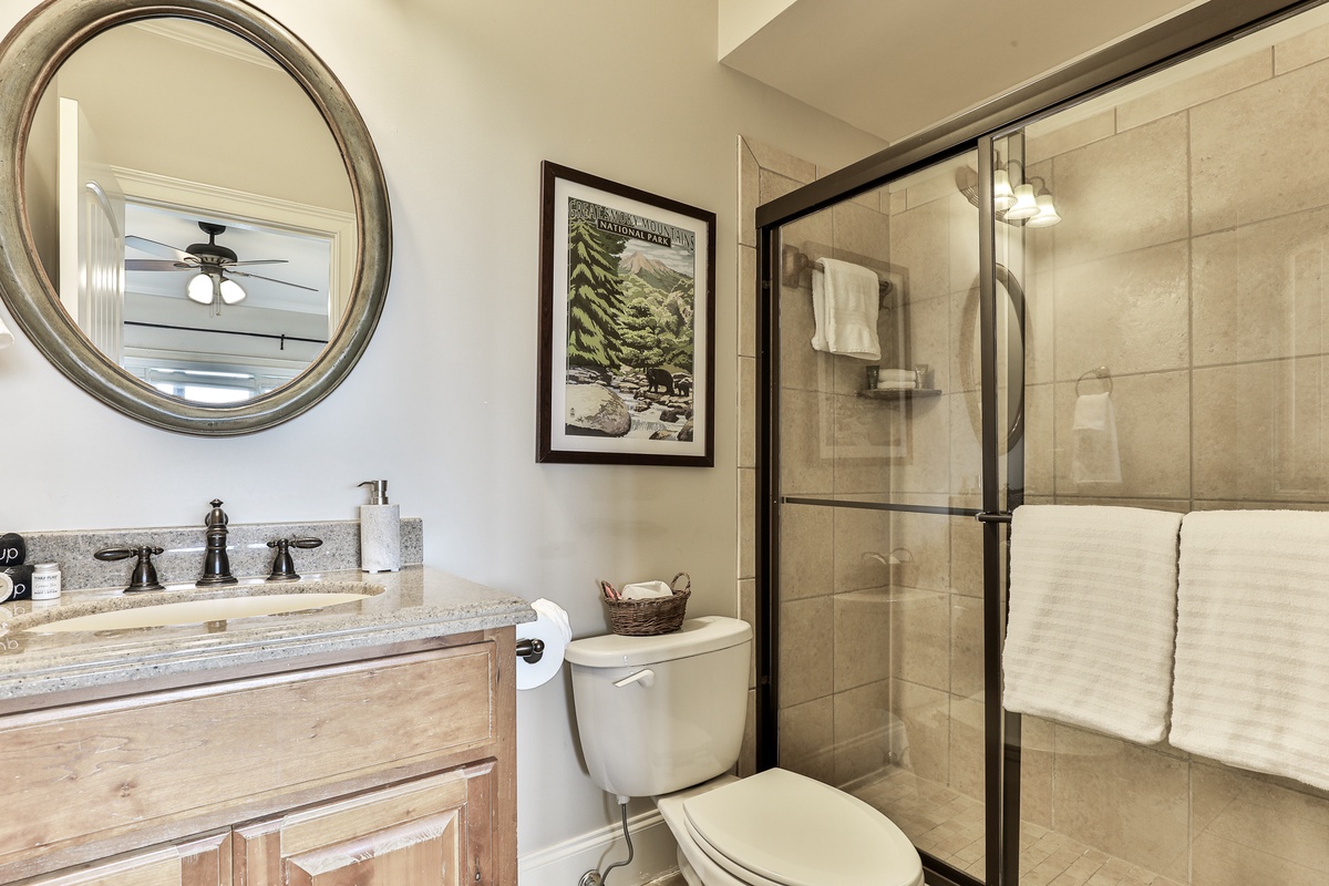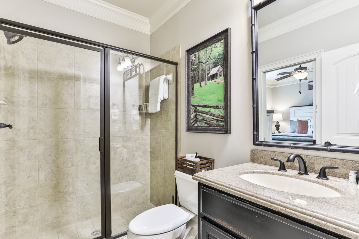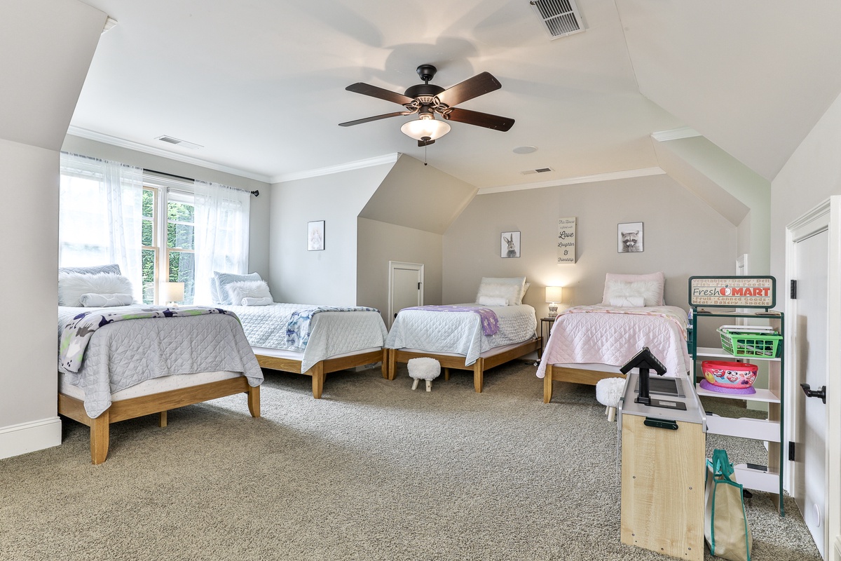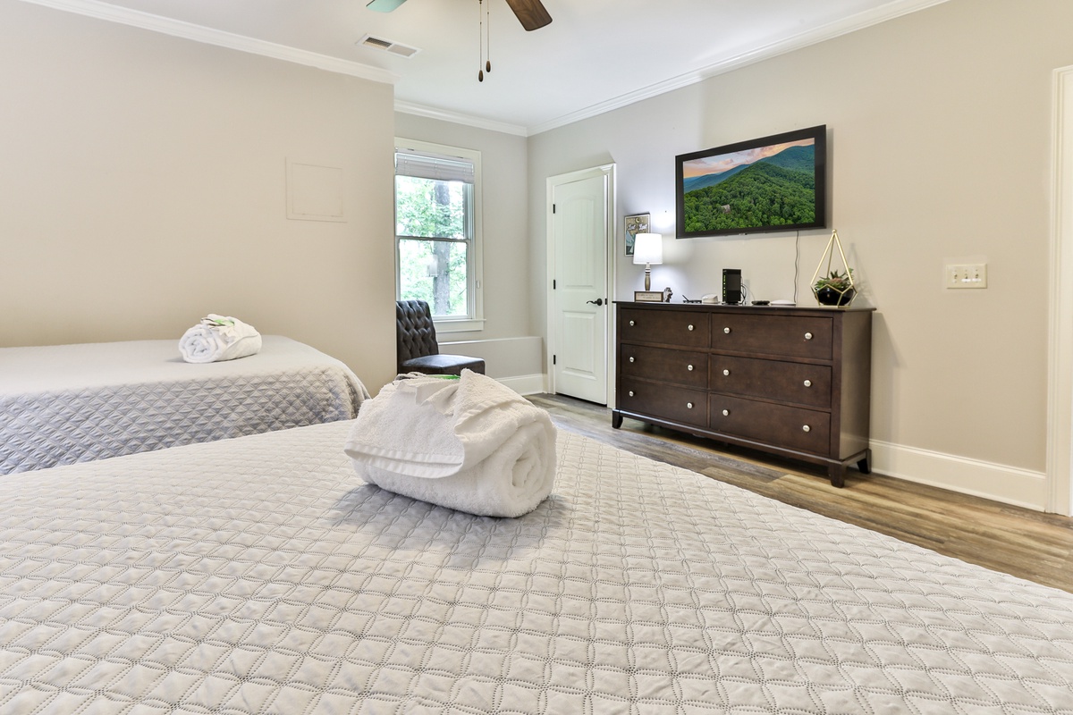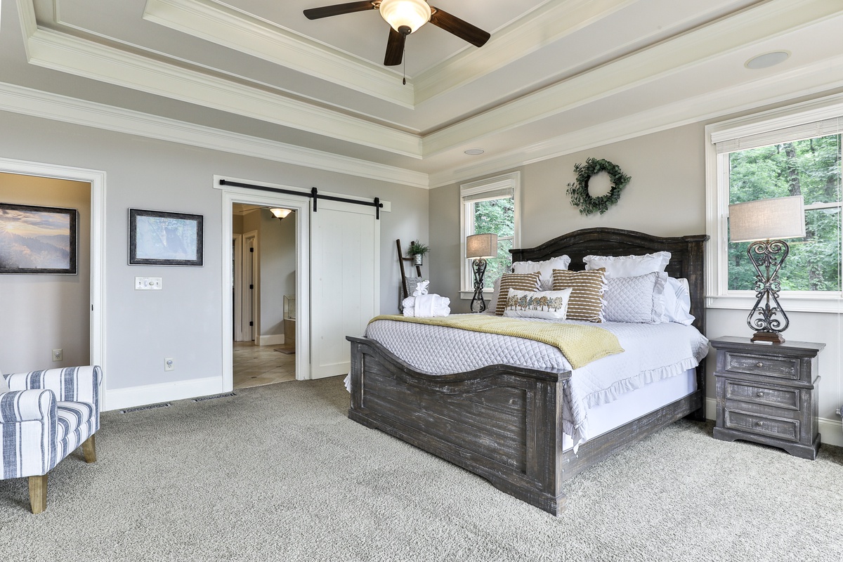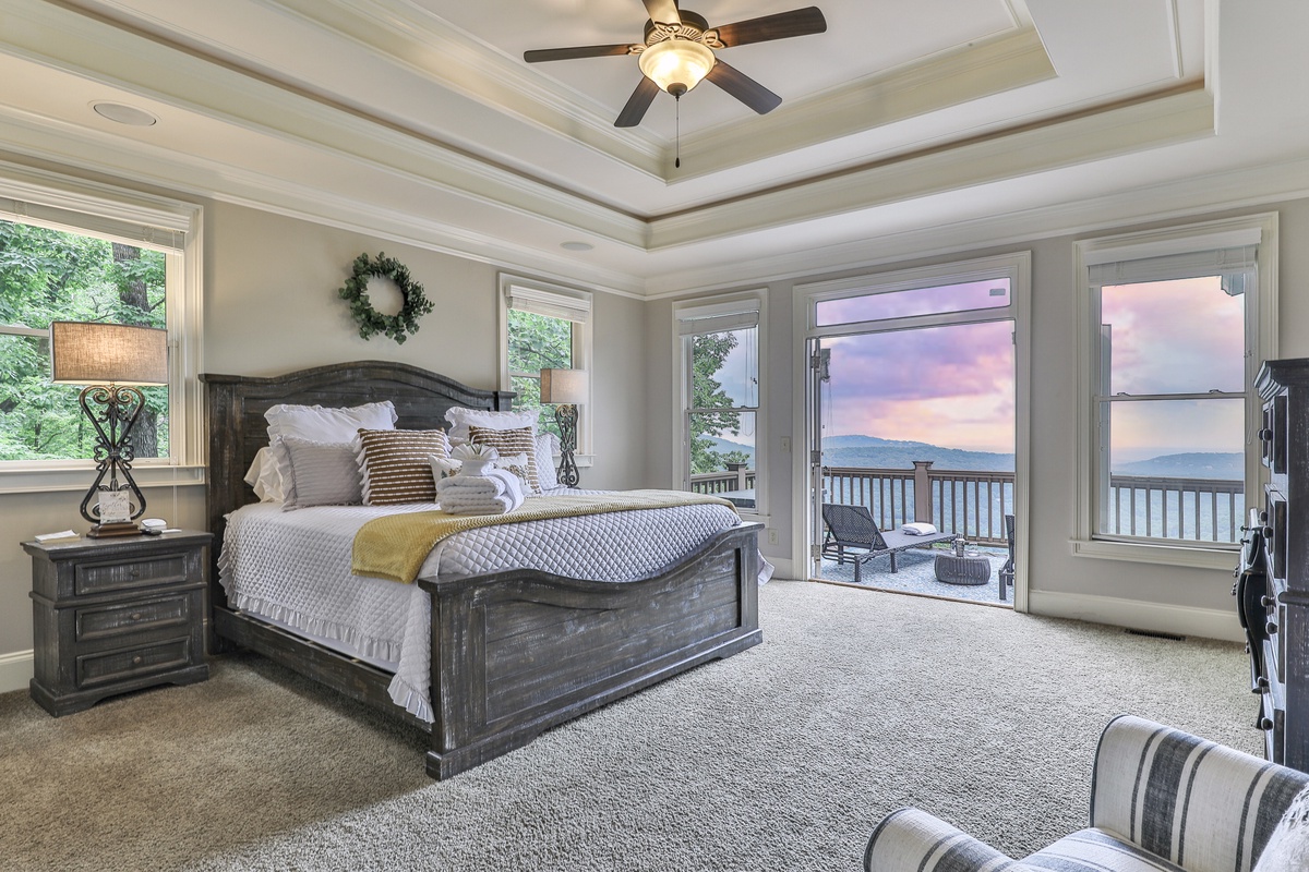 The primary suite on the main level features a queen bed and an attached bathroom with a jetted tub. A second main-level guest room with a king bed also has an attached bathroom. Upstairs, a lounge with four twin beds is perfect for friends and children. The beautiful terrace level includes three bedrooms (two with queen beds, two with king beds) and two full bathrooms. This level also has a billiards area, a kitchenette, and a sauna.