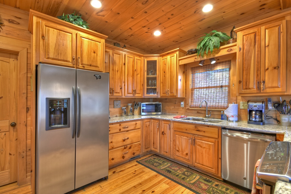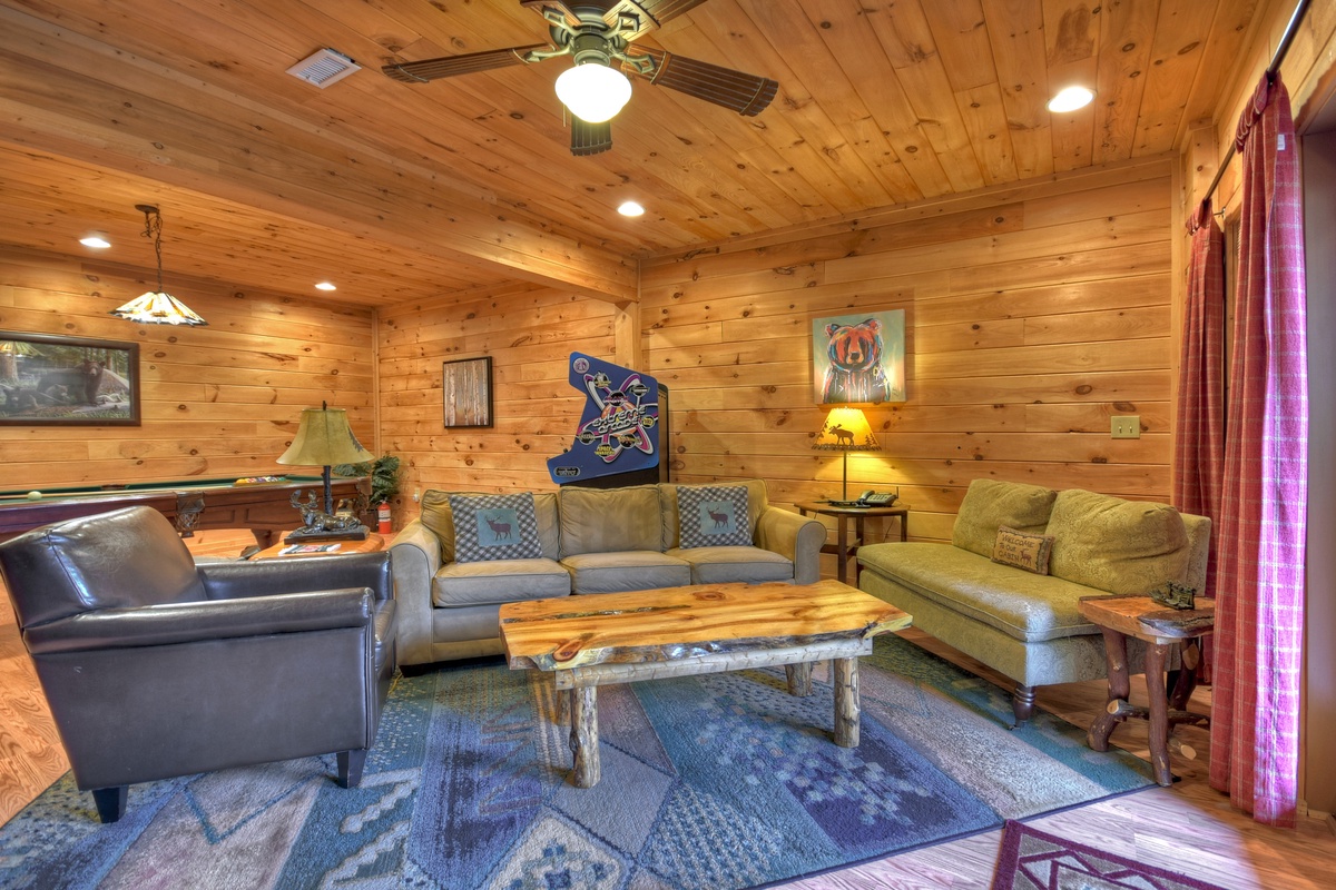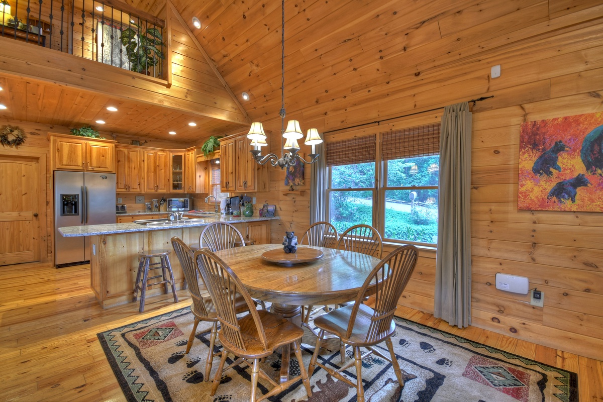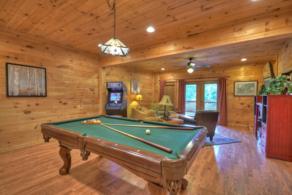 Put your bags down and give yourself a moment to take in the beauty and warmth that this cabin presents you with. On the entry level, you will find a living area with flat panel TV and stacked stone wood-burning fireplace, a dining area and an open kitchen that is fully equipped and perfect for cooking a hearty meal for your guests. Rest up for an adventurous day out in North Georgia in one of the three king size beds found on each level of this Blue Ridge vacation home, or enjoy a fun-filled evening in the recreation room, where you can play a game of pool or entertain yourself for hours in front of the arcade console.