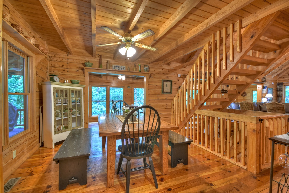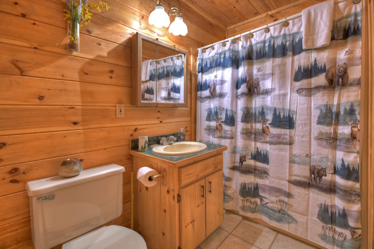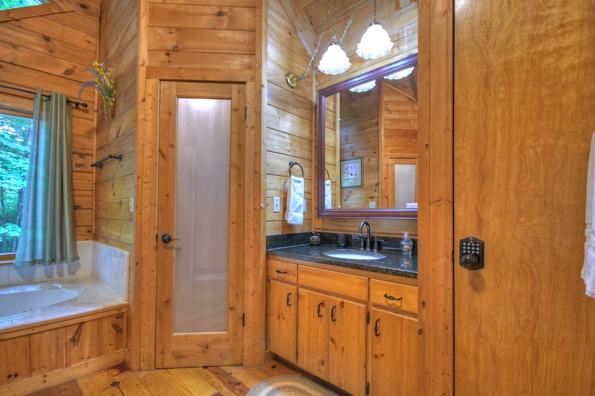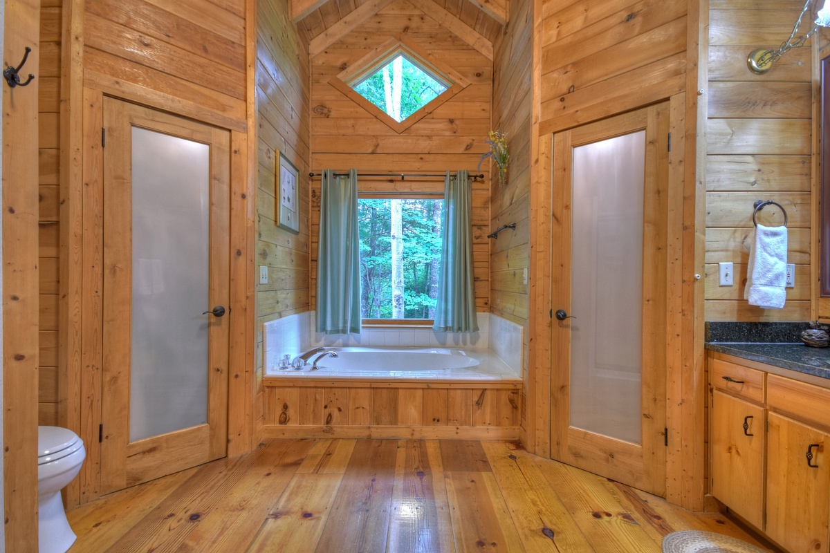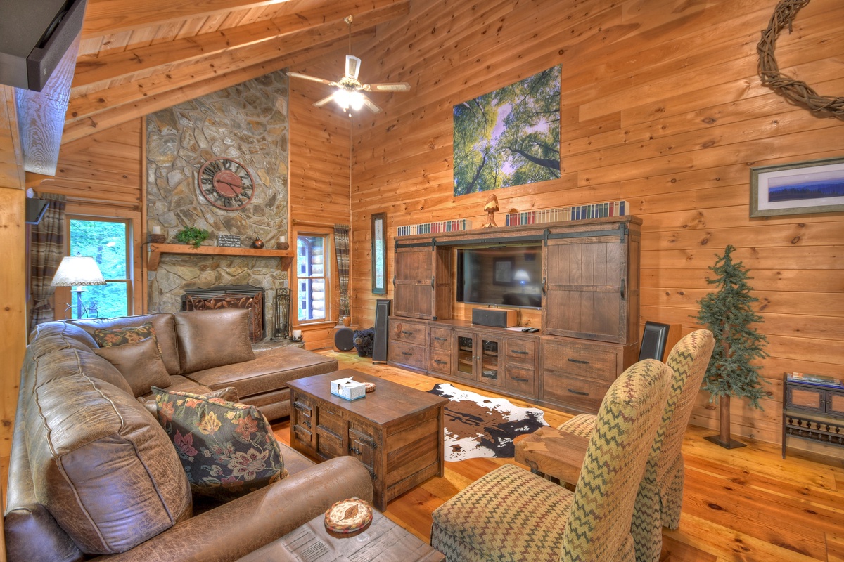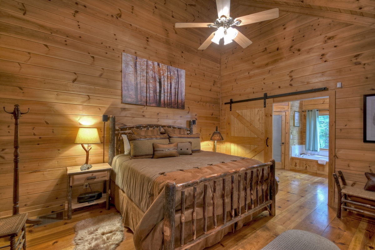 "Falling Leaf" is a beautiful log cabin in the Mountain Tops development just a few short minutes from Blue Ridge. If you are looking for a cabin in close proximity to all the happenings, but still would enjoy some privacy, this is your cabin! Unlike most cabins, the layout of this property allows for the kitchen, living and dining area, along with the recreation room to be all together on one level without sacrificing any space! Once in the cabin, the main level king master suite will be to your right with a 48" cable TV and an attached private bathroom with a jetted tub and walk-in shower. To your left, you will find the shared half bath for the common areas and the washer and dryer.