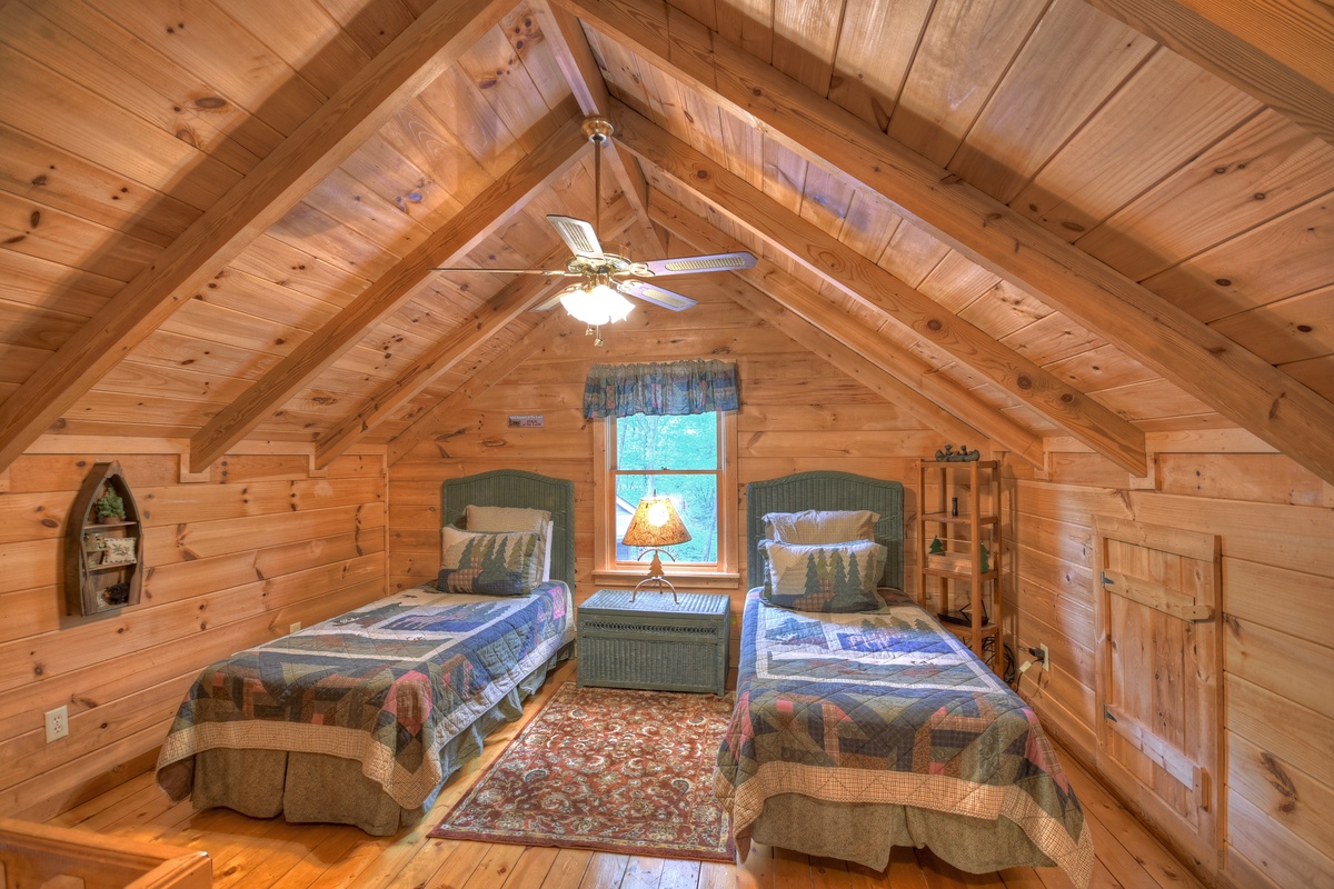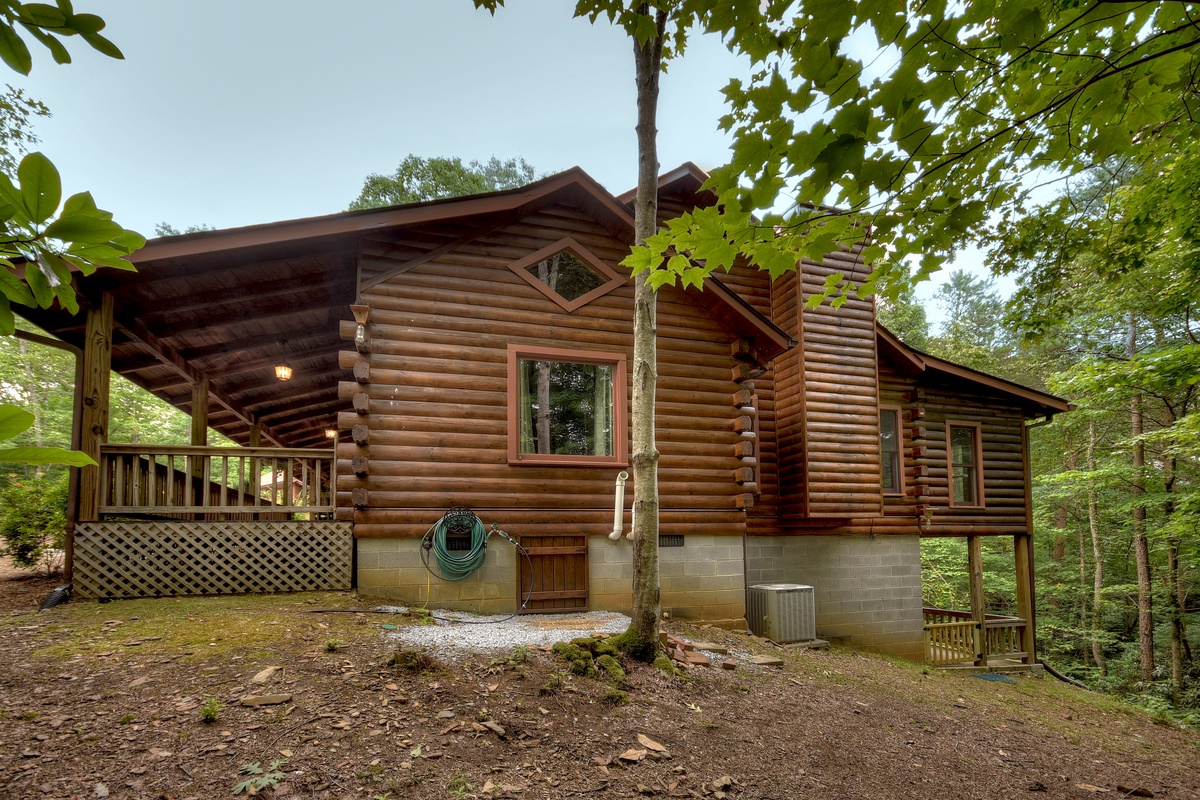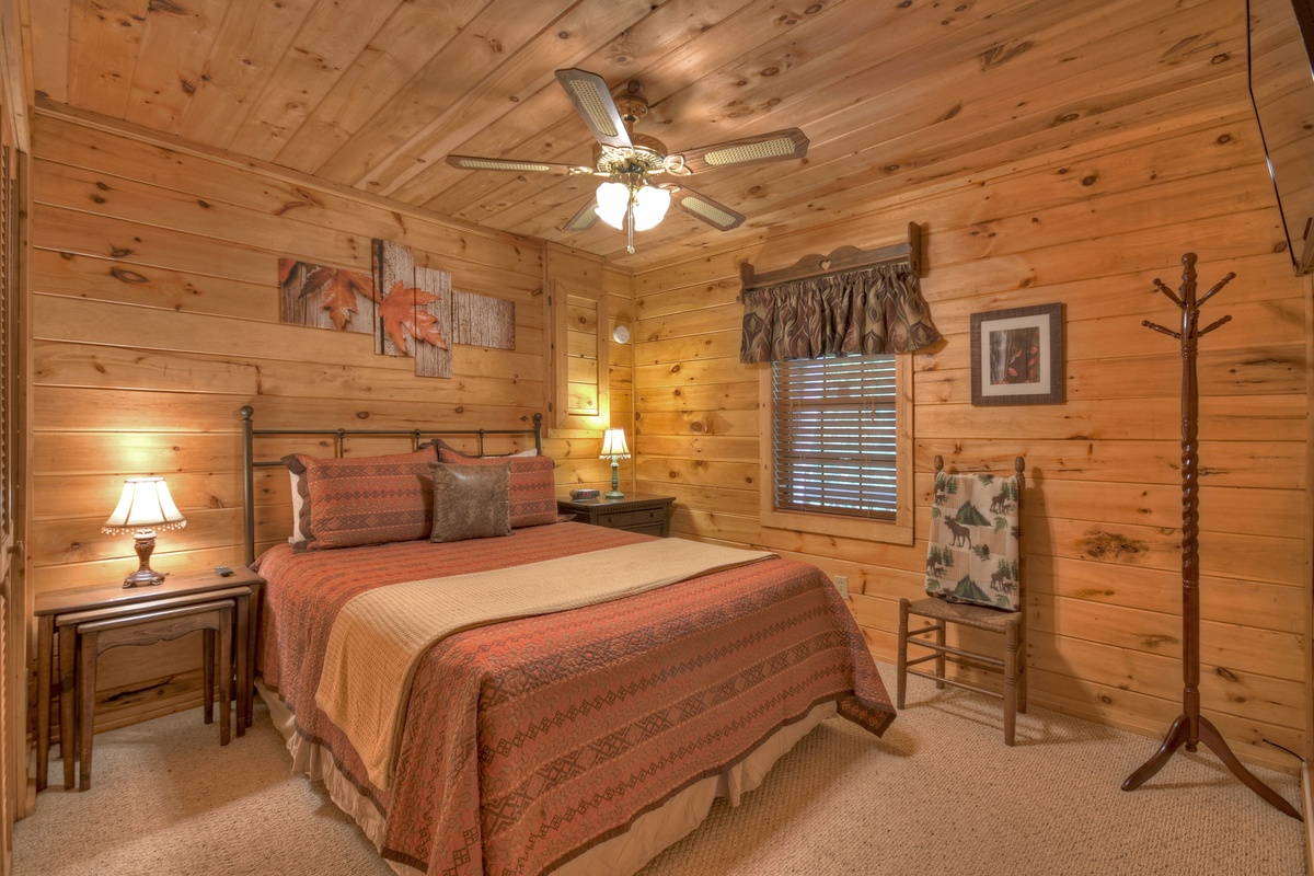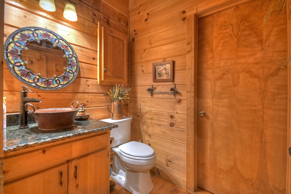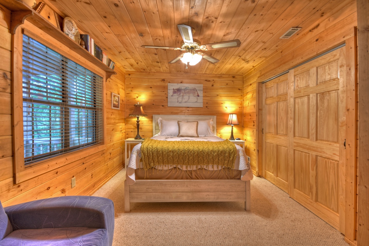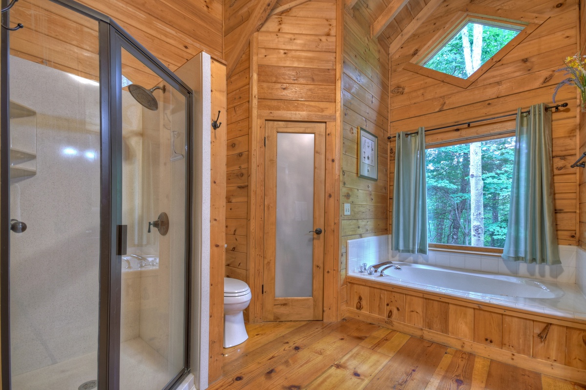 "Falling Leaf" is a beautiful log cabin in the Mountain Tops development just a few short minutes from Blue Ridge. If you are looking for a cabin in close proximity to all the happenings, but still would enjoy some privacy, this is your cabin! Unlike most cabins, the layout of this property allows for the kitchen, living and dining area, along with the recreation room to be all together on one level without sacrificing any space! Once in the cabin, the main level king master suite will be to your right with a 48" cable TV and an attached private bathroom with a jetted tub and walk-in shower. To your left, you will find the shared half bath for the common areas and the washer and dryer.