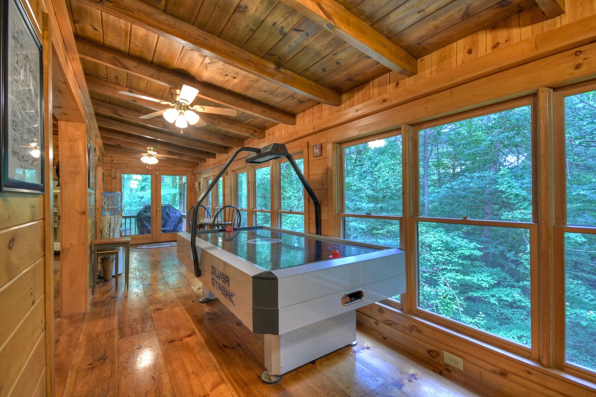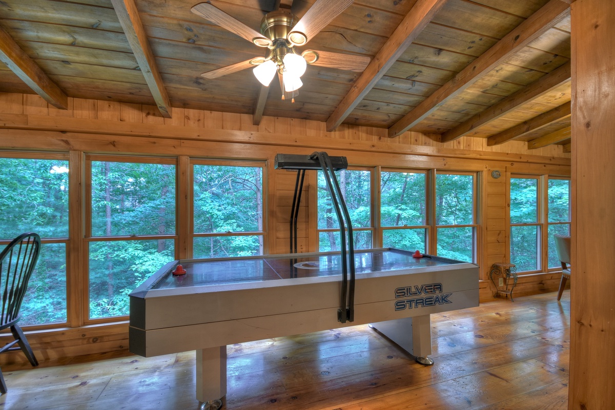The fully equipped kitchen is your oasis as you are free to make that special recipe you have been wanting to try. The dining table for 6 is just off of the kitchen, so the chef still gets to enjoy family time. The living room is perfect for a movie and popcorn with its 55" cable TV surround sound entertainment system. Kick back on the plush leather sectional and enjoy some laughs with friends and family while the gas burning fireplace sets the atmosphere. On the back side of the living room, keep the kids entertained (no matter what their age) with the included air hockey table, poker table, chess table, and a multitude of board games. They even have a guitar!