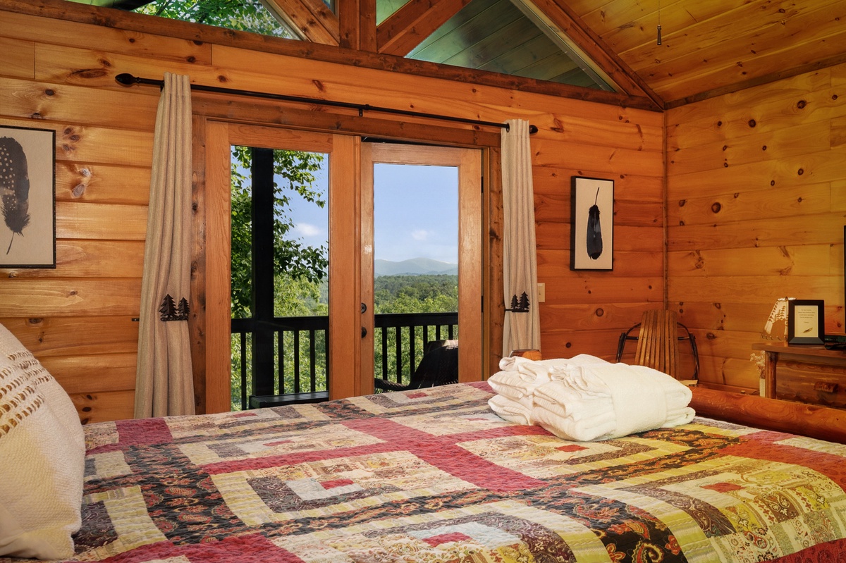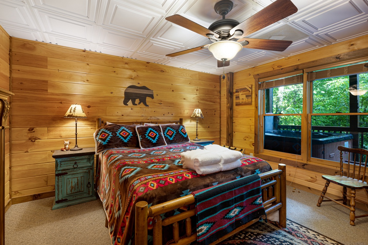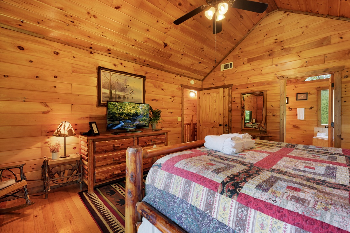 Head upstairs to the master suite with king bed, 42in TV, individual cooling control settings (May through Oct), high ceilings and lots of natural light. Start your morning off with a mug of hot coffee on this room’s private balcony. Or enjoy a soak with a good book in the large jetted tub in the attached master bathroom.