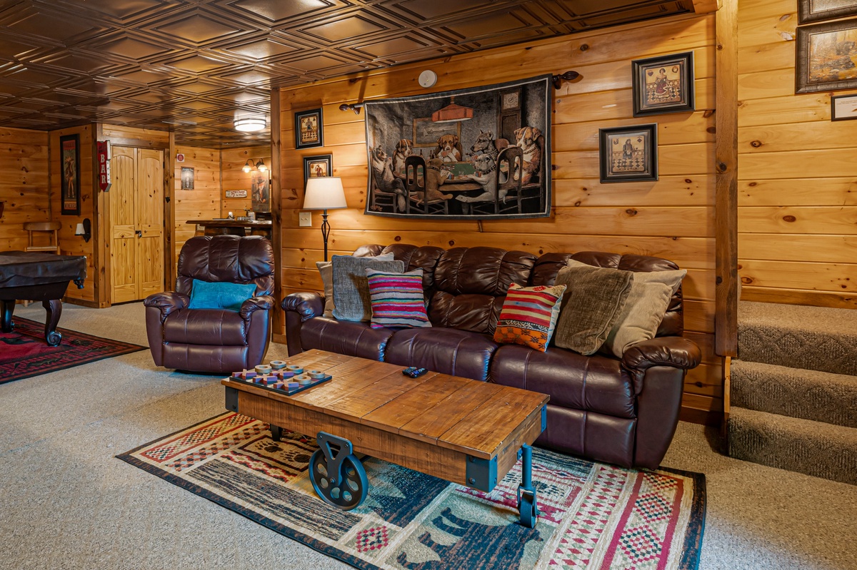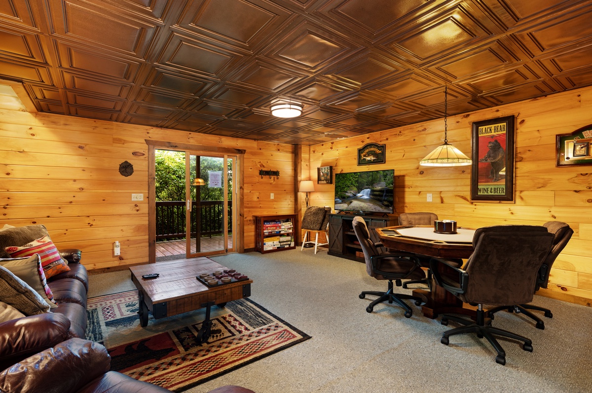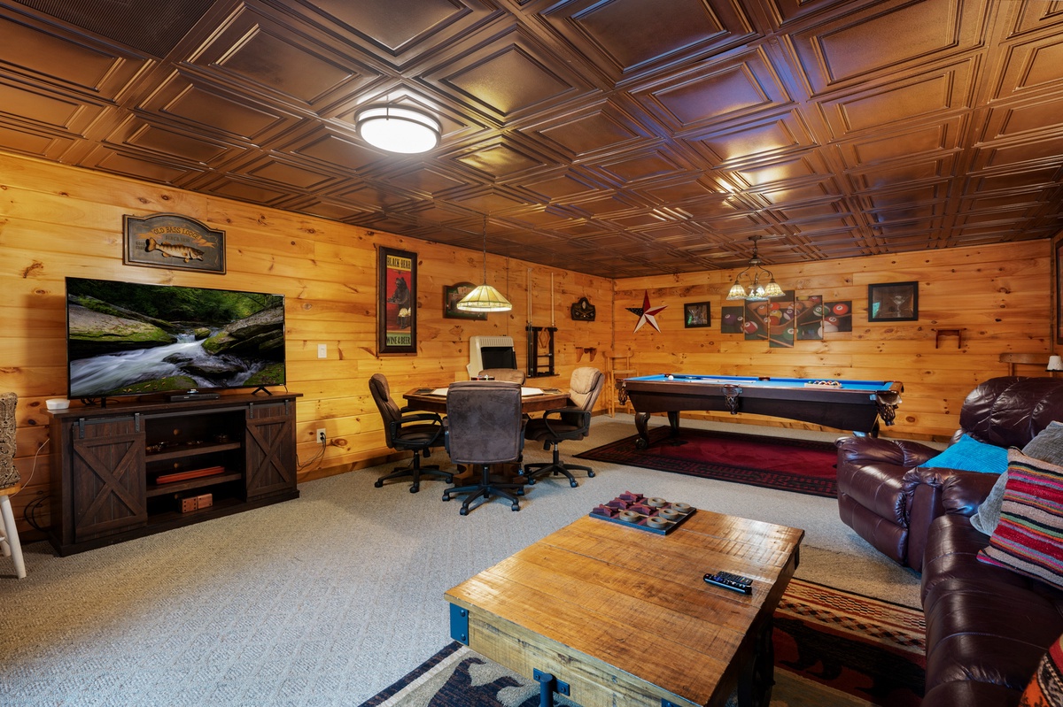 Downstairs, you will find the game room ready for a fun round of pool or hand of poker at the card table. The bar has everything you need, including a mini-fridge! There is also plush leather seating and a 55in TV for a nice movie. Beside the bar area is another full bathroom and final queen bedroom with 32in TV. Back through the game room and out onto the lower-level deck, enjoy a sunset from the 6-person hot tub.