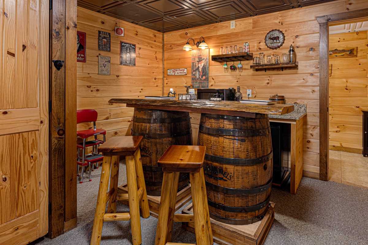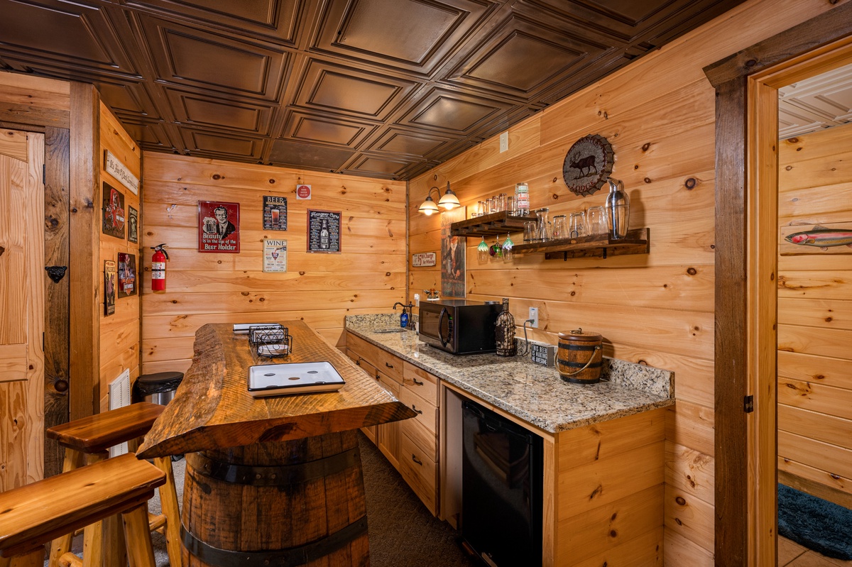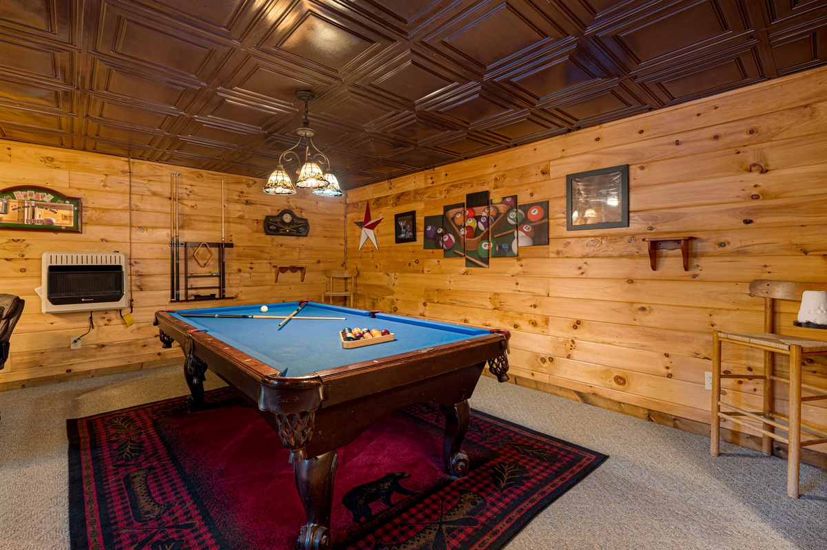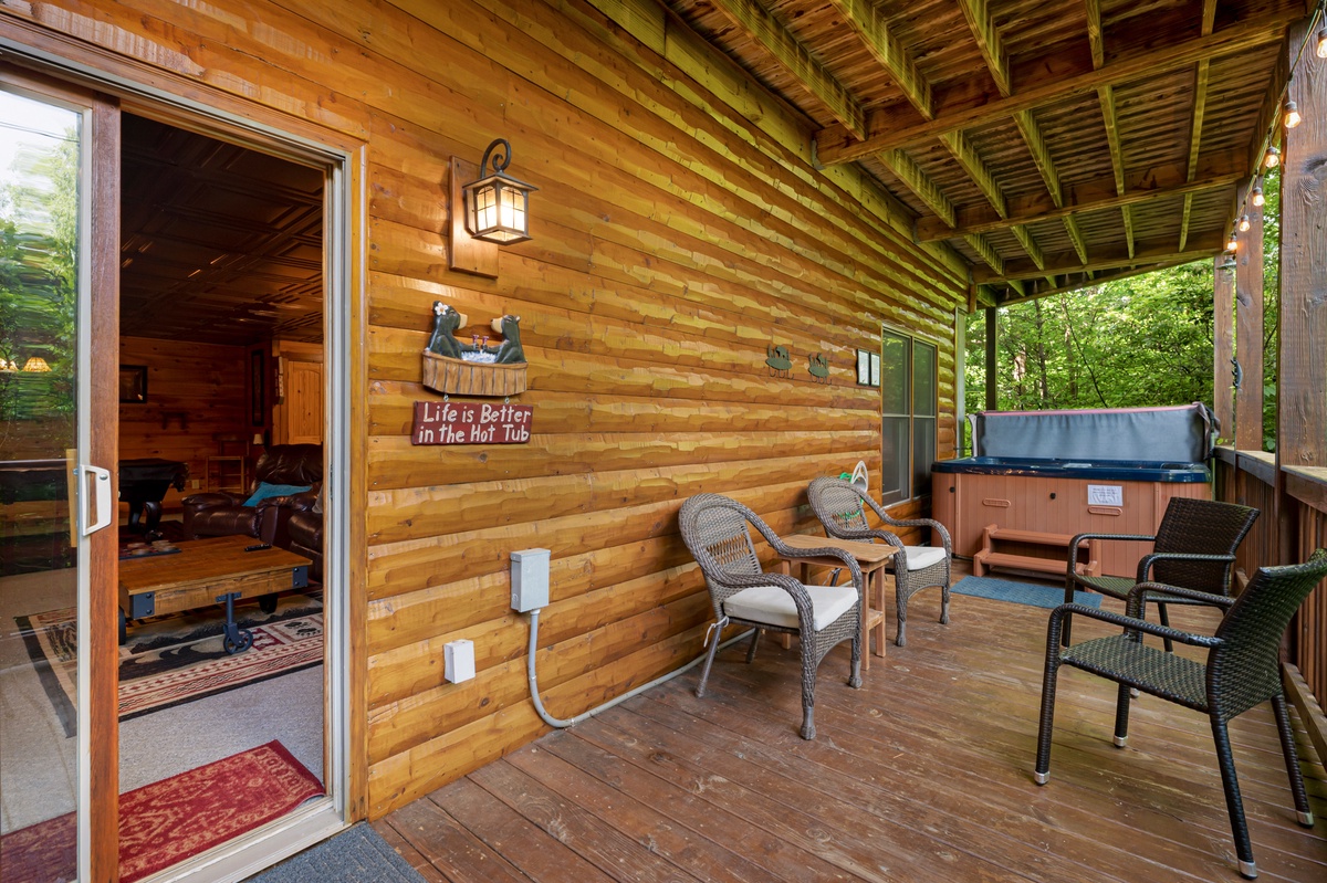 Downstairs, you will find the game room ready for a fun round of pool or hand of poker at the card table. The bar has everything you need, including a mini-fridge! There is also plush leather seating and a 55in TV for a nice movie. Beside the bar area is another full bathroom and final queen bedroom with 32in TV. Back through the game room and out onto the lower-level deck, enjoy a sunset from the 6-person hot tub.