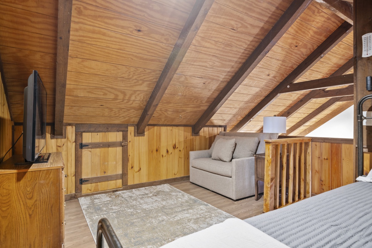 The main level features a restful queen bedroom and a queen sleeper sofa in the living room, while the upstairs loft provides additional sleeping options with a full bed and a twin sleeper chair, plus another TV, making it the perfect hideaway for kids or teens. Thoughtful touches like board games, coloring books, and cozy gathering spots create a homey, welcoming vibe that appeals to families, couples, or small groups looking to unwind.