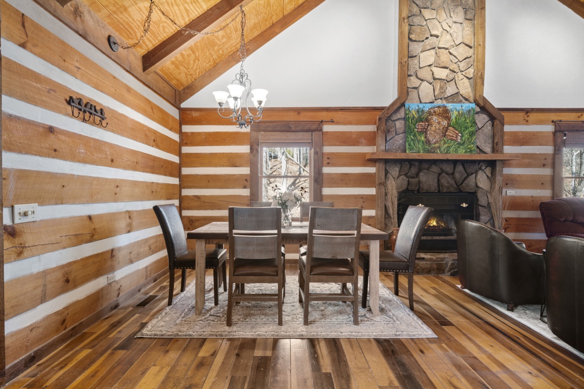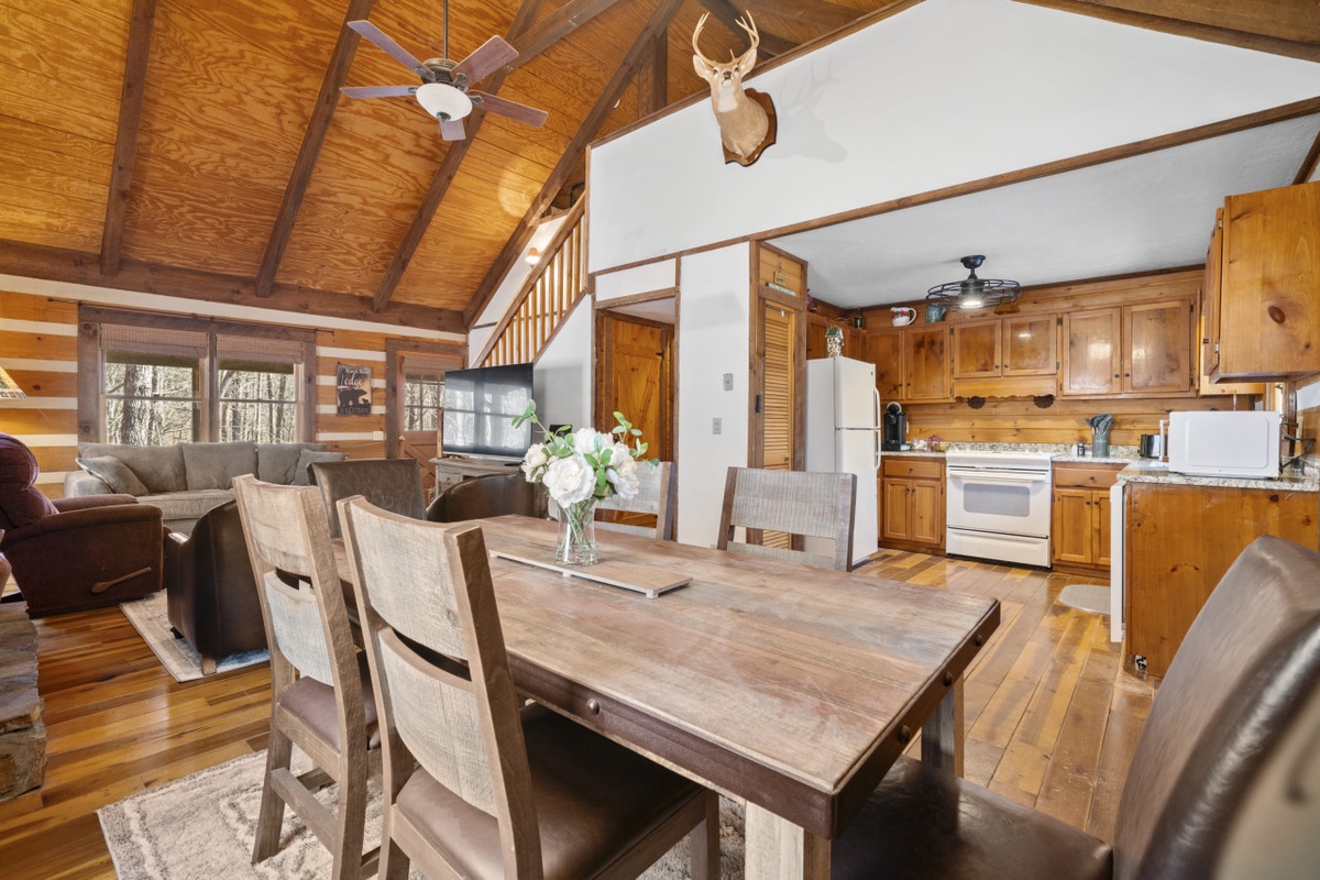 Forest Footprints is a charming, fully renovated 2024 cabin designed for cozy gatherings, peaceful retreats, and unforgettable mountain memories. From the moment you step inside, warm wood accents, and a stone fireplace set a welcoming tone, inviting guests to settle in, relax, and stay awhile. The open concept living and dining area offers plenty of comfortable seating, a large TV for movie nights, and direct access to the wraparound deck for seamless indoor-outdoor living.
