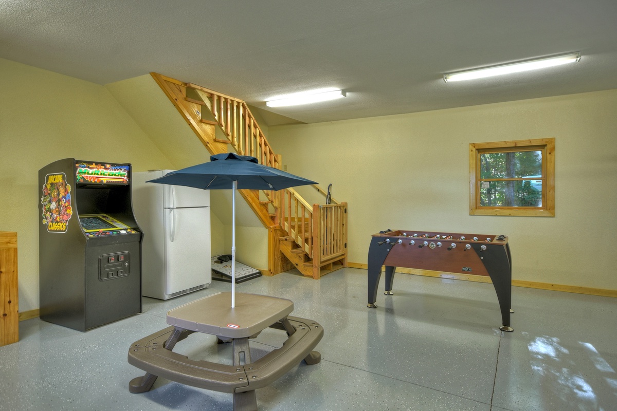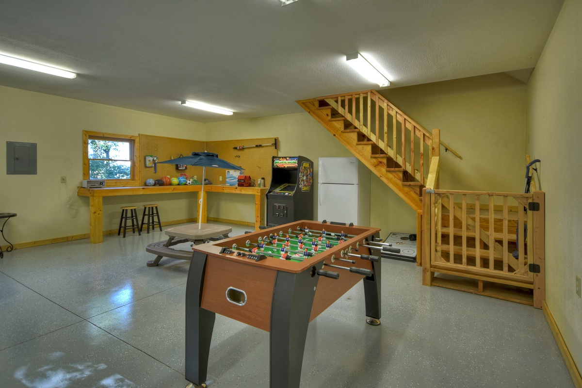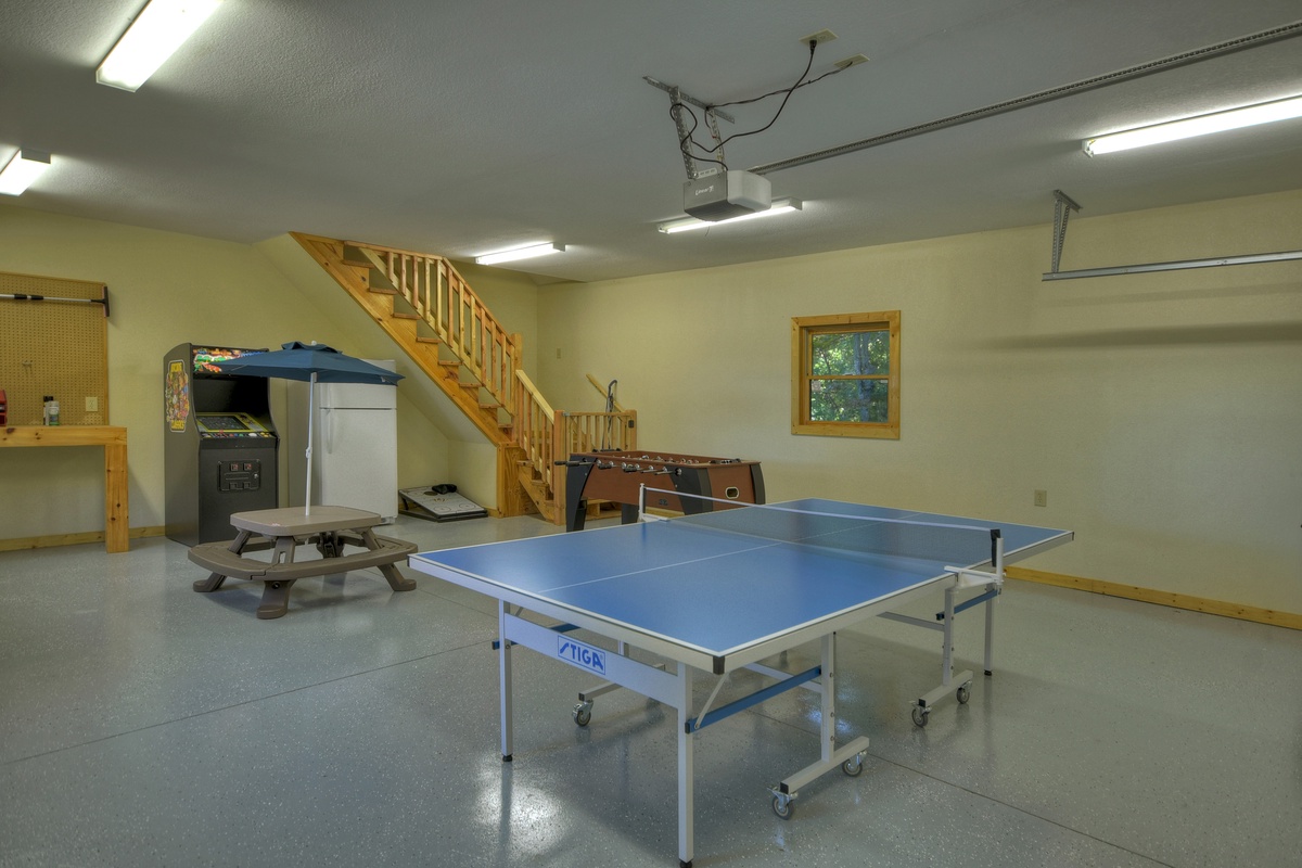 - Garage/game room with foosball, ping pong, and a 60 game loaded arcade machine