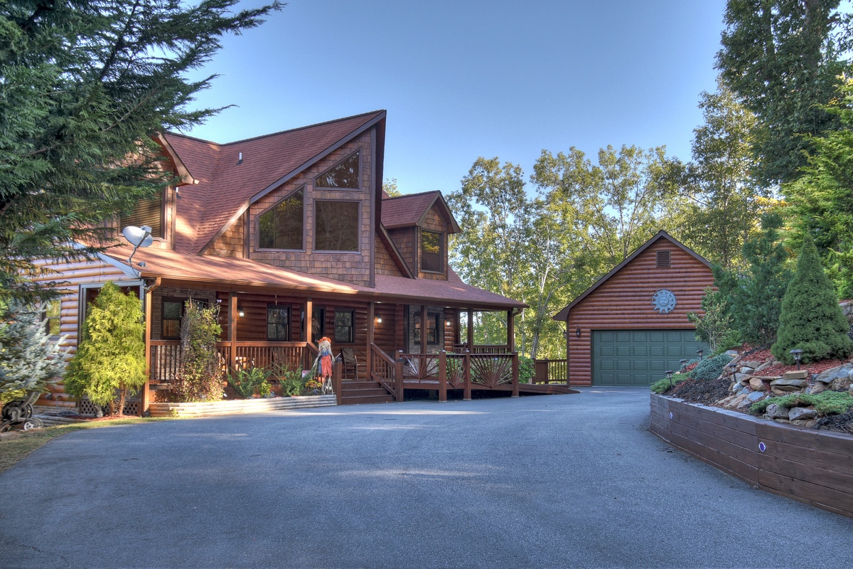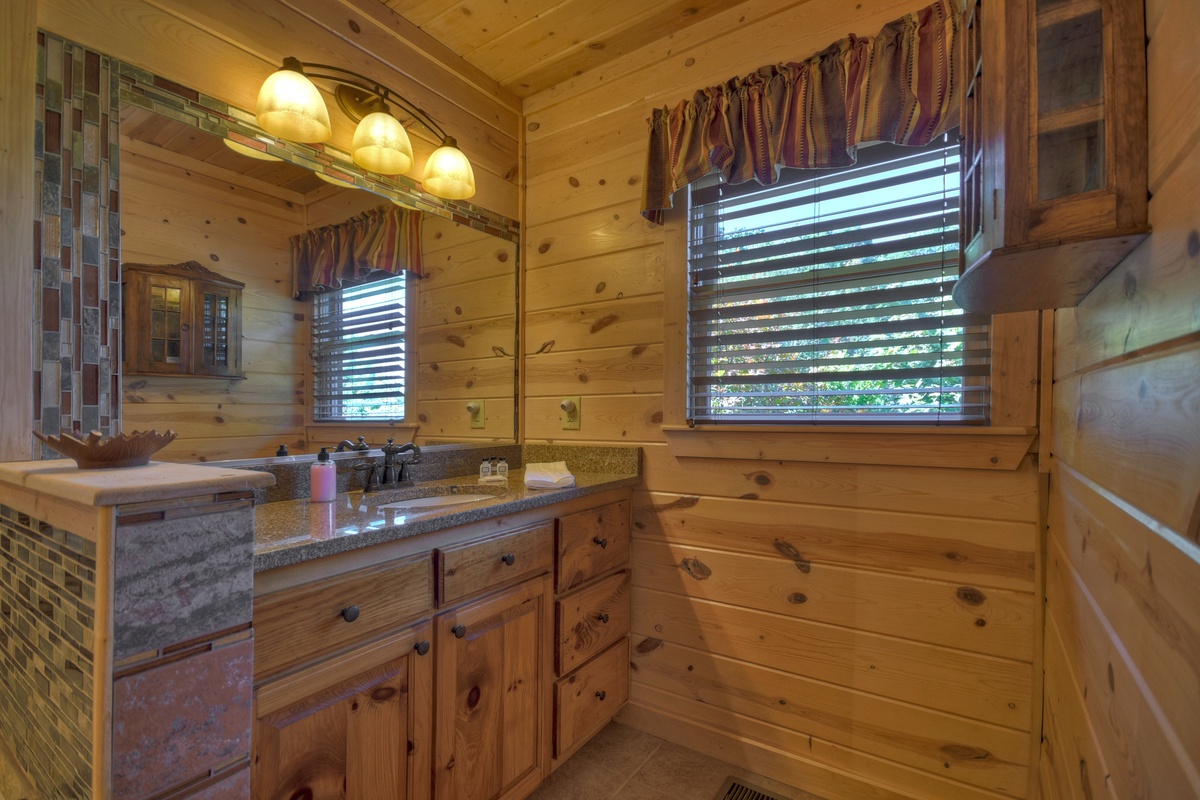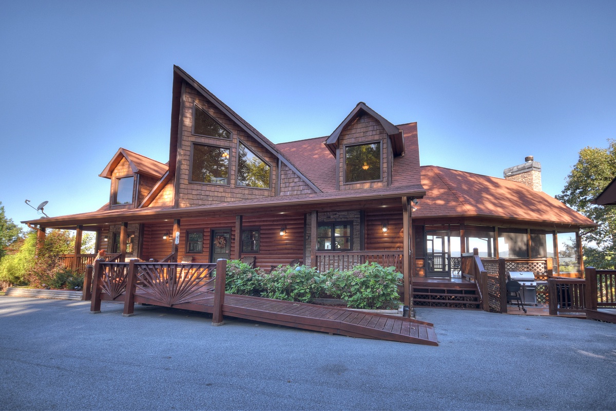 This majestic cabin set back in the North Georgia Mountains will take your breath away! Walking in the door, you will immediately be impressed by the lavish furnishings making you feel right at home. Kick back and relax on the finest brand new sectional set around the 55" TV and gas log fireplace for a perfect evening. There is also a half bathroom just off of the living area for your convenience. The first of the 5 bedrooms are on this level and would be suitable as a handicap accessible bedroom starting with a queen BeautyRest Black Series mattress that is adjustable and massages! The attached bathroom has a handicap accessible toilet with grip bar near the toilet and in the walk-in shower. Take advantage of the double sinks for convenience or even a relaxing soak in the jetted tub. The bedroom also has a large walk-in closet with private deck access and a 43" TV