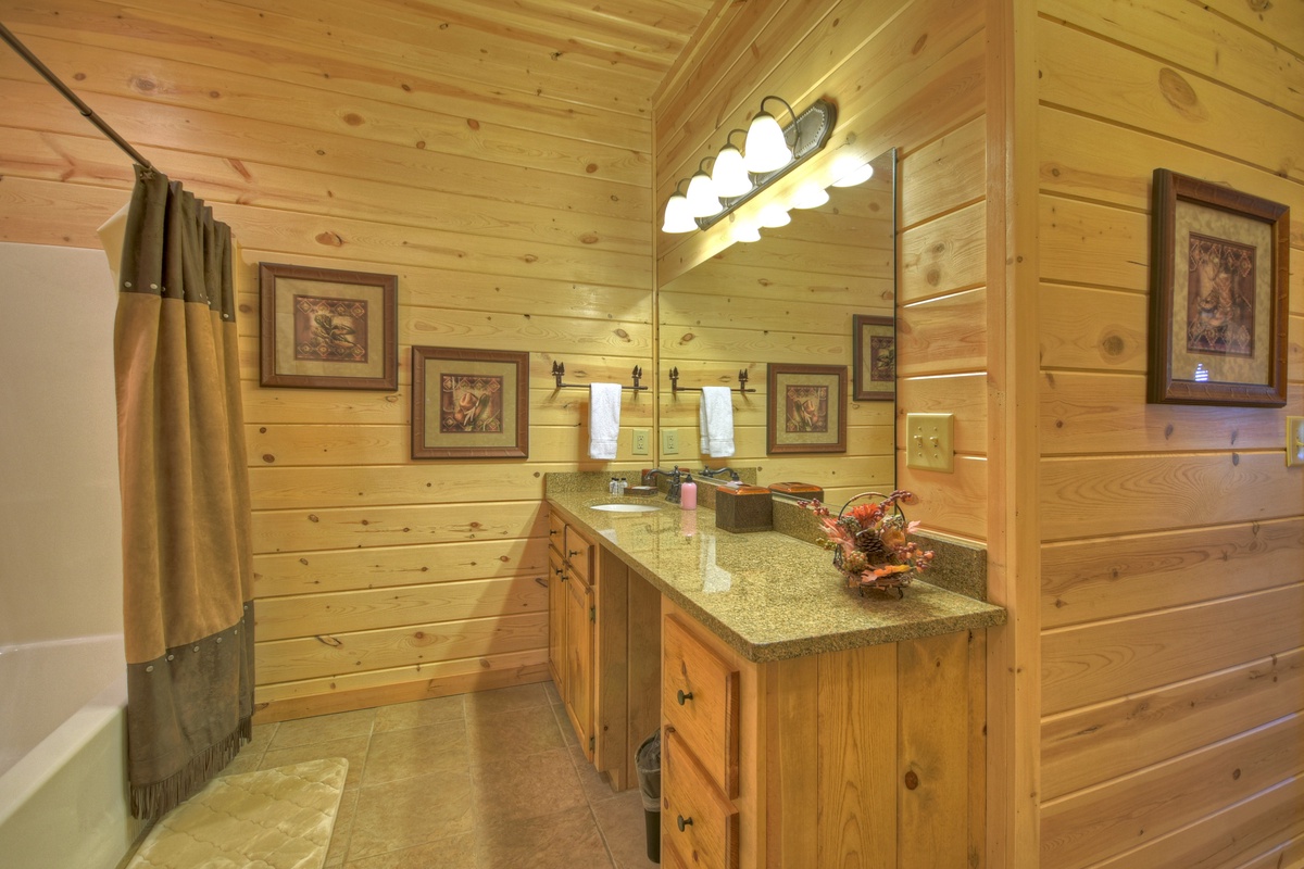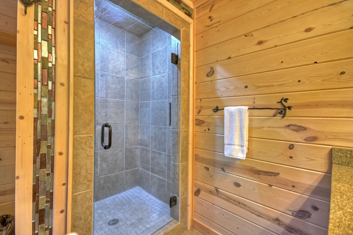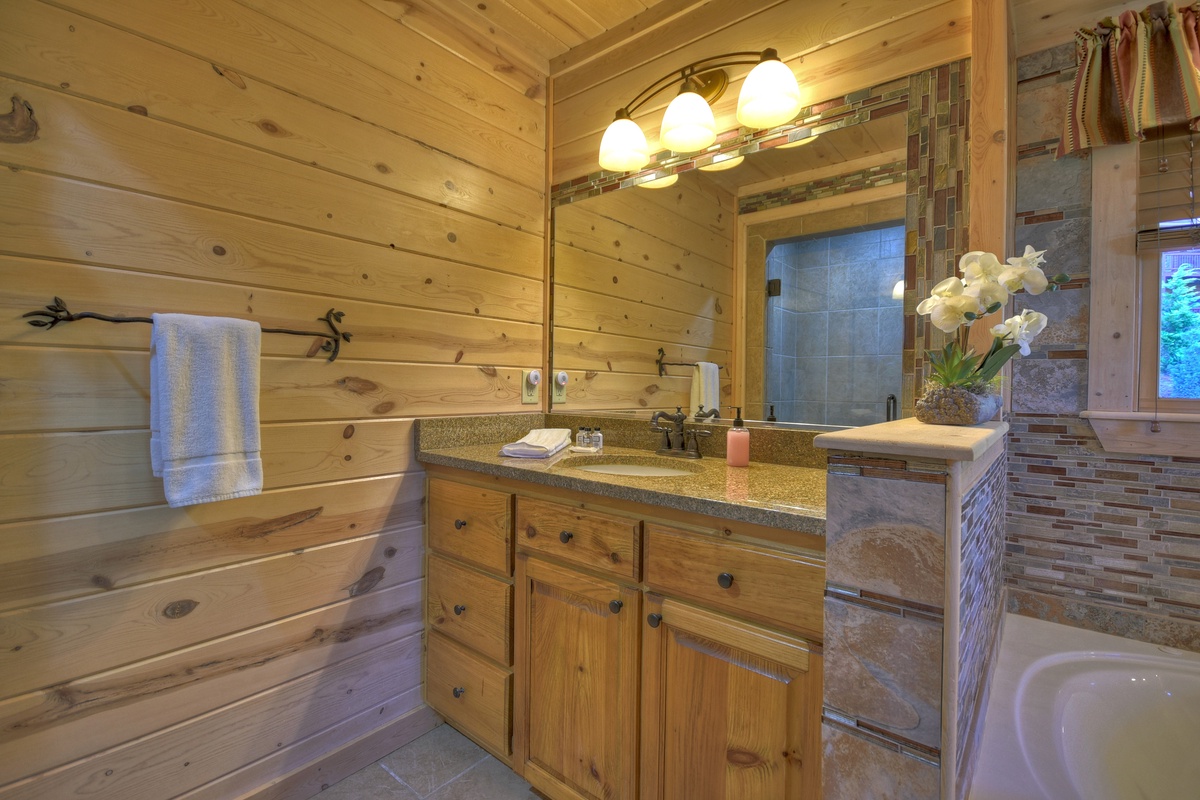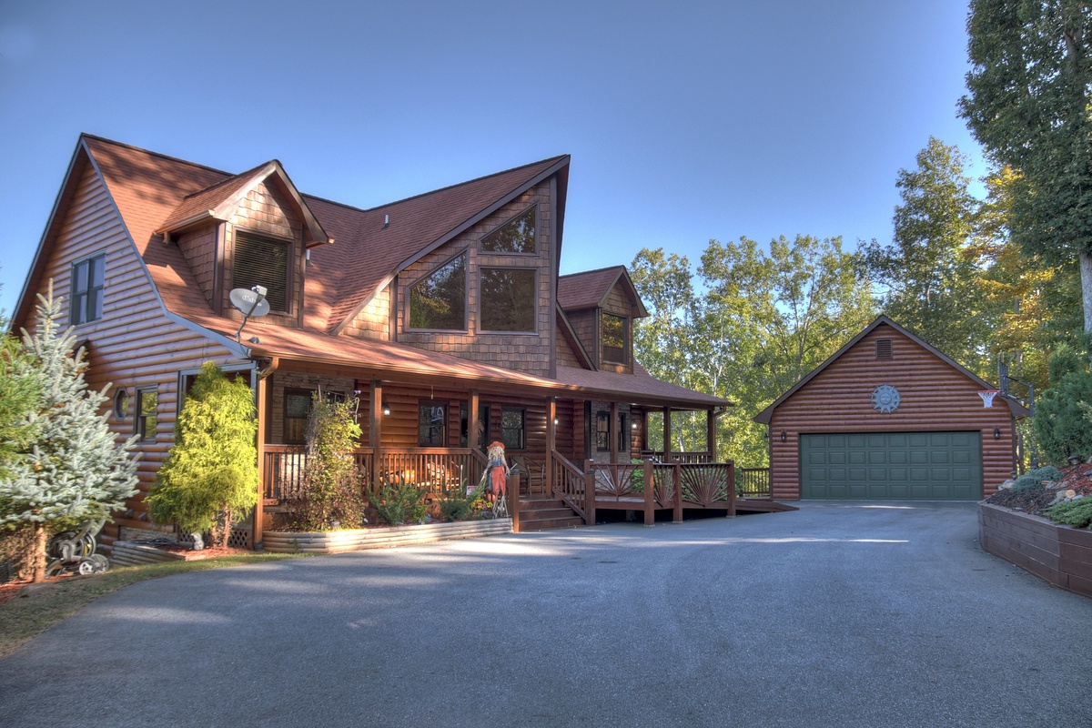 This majestic cabin set back in the North Georgia Mountains will take your breath away! Walking in the door, you will immediately be impressed by the lavish furnishings making you feel right at home. Kick back and relax on the finest brand new sectional set around the 55" TV and gas log fireplace for a perfect evening. There is also a half bathroom just off of the living area for your convenience. The first of the 5 bedrooms are on this level and would be suitable as a handicap accessible bedroom starting with a queen BeautyRest Black Series mattress that is adjustable and massages! The attached bathroom has a handicap accessible toilet with grip bar near the toilet and in the walk-in shower. Take advantage of the double sinks for convenience or even a relaxing soak in the jetted tub. The bedroom also has a large walk-in closet with private deck access and a 43" TV