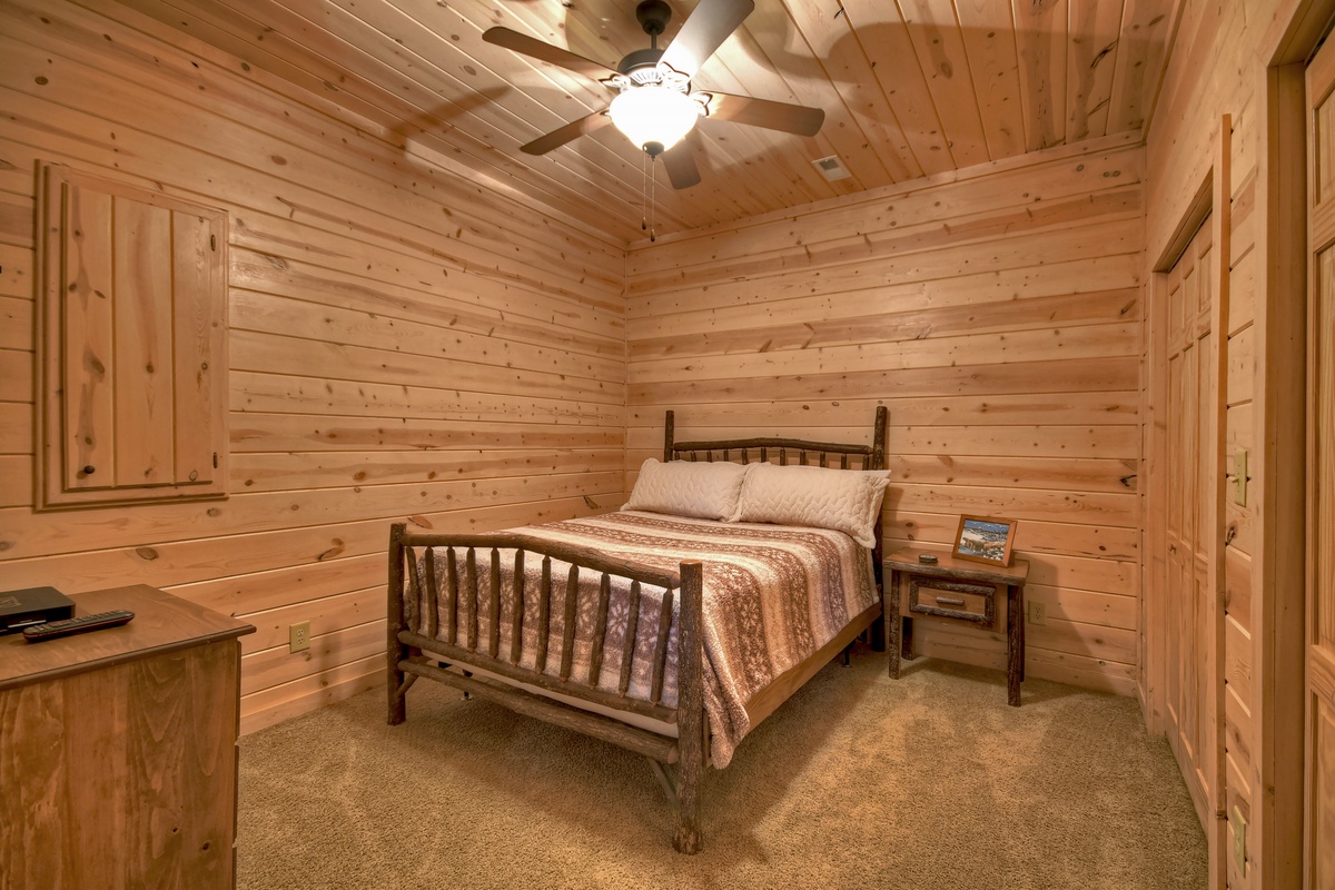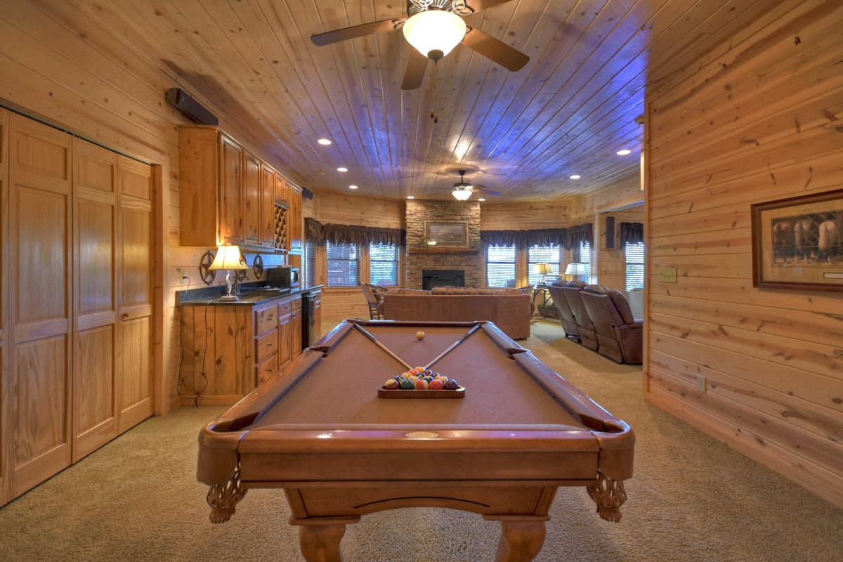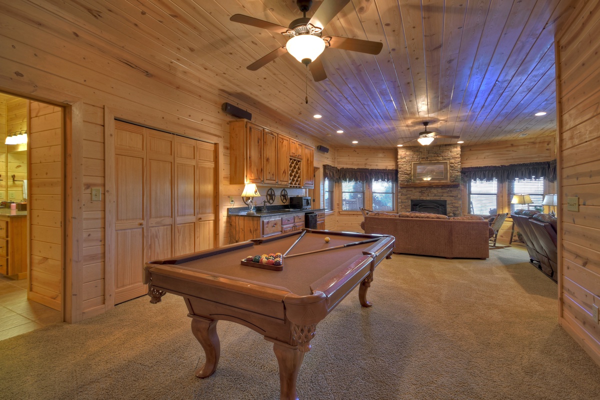 Once downstairs into the recreation room, you will be greeted by a top of the line billiards table. Beyond that is the wet bar with mini-fridge included and another gas log fireplace with seating. Just around the corner, you will find the entertainment section of the recreation room boasting a 75" TV with a 7.1 surround sound system and comfortable seating perfect for snuggling up and enjoying a movie with loved ones. The first bedroom of two is off of this room, with a queen-size bed and closet. The second bedroom is on the other side of the lower level with a king-size mattress and a 43" TV and an attached, shared shower/tub combo bathroom.
