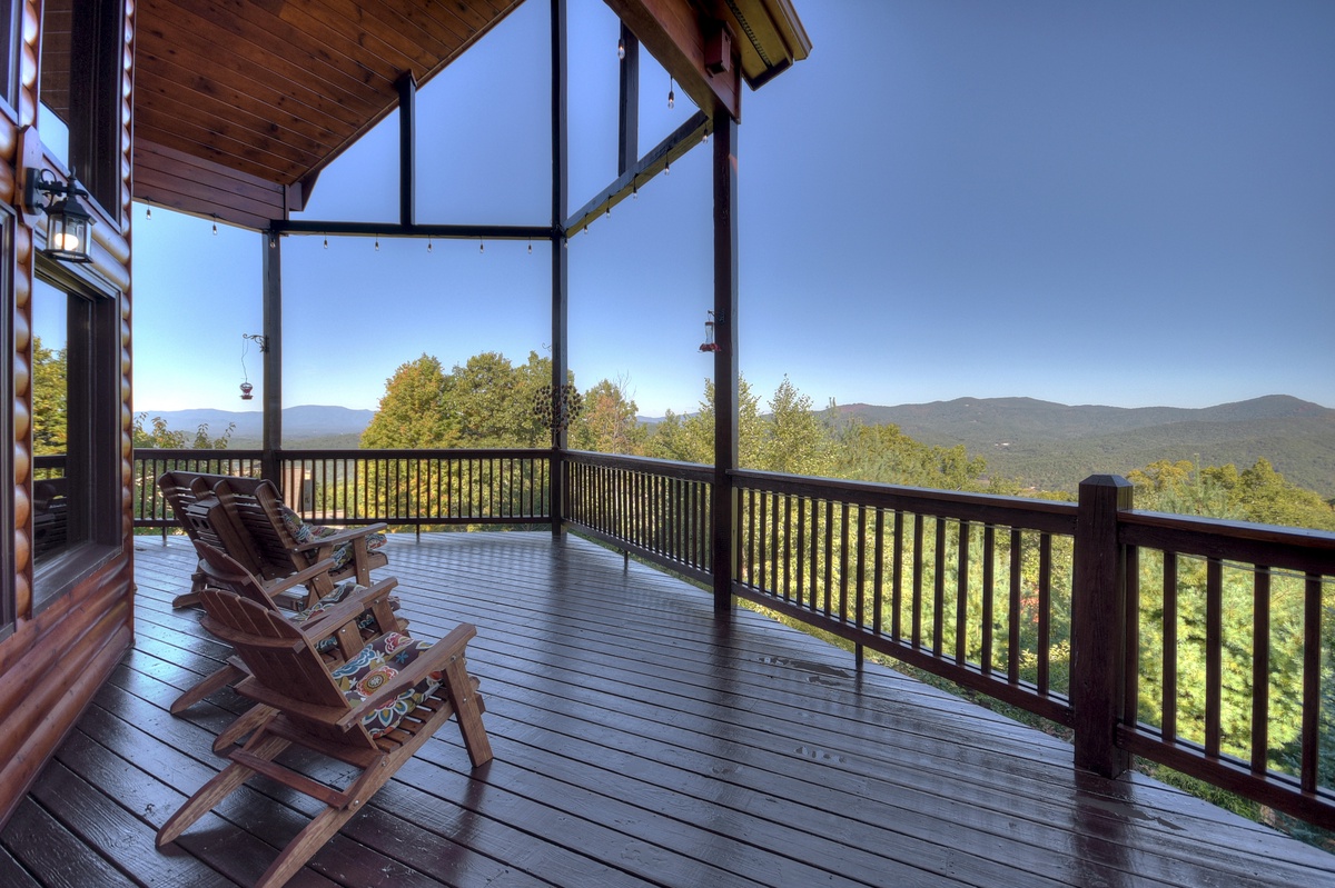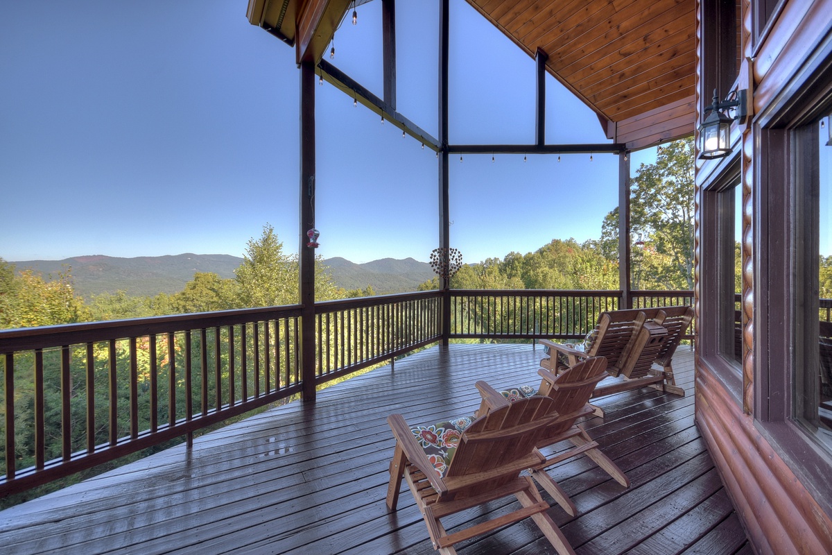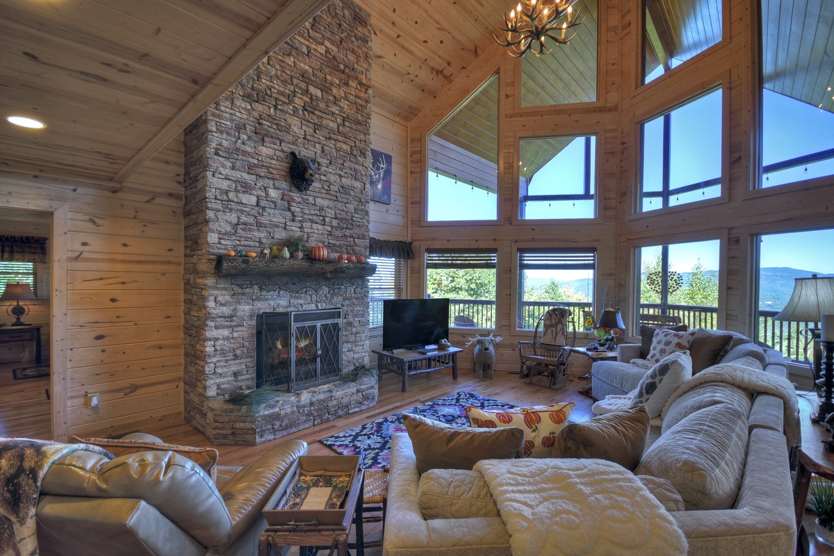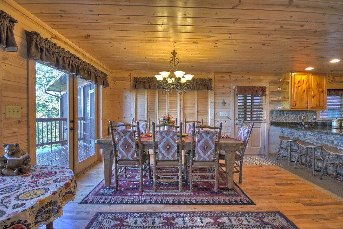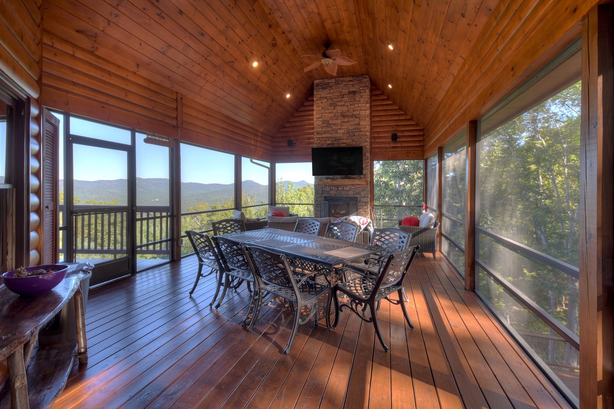 You will also find the entry-level deck access door behind the dining table. This leads you out the breathtaking mountain views that run panoramic from side to side! Soak it all in with plentiful seating as you watch the sunset behind the mountains. To the right, you will find a HUGE screened-in porch with a 65" TV over a wood-burning fireplace for your enjoyment. There is also plentiful wicker deck furniture to relax in while you watch your favorite shows or the big game.