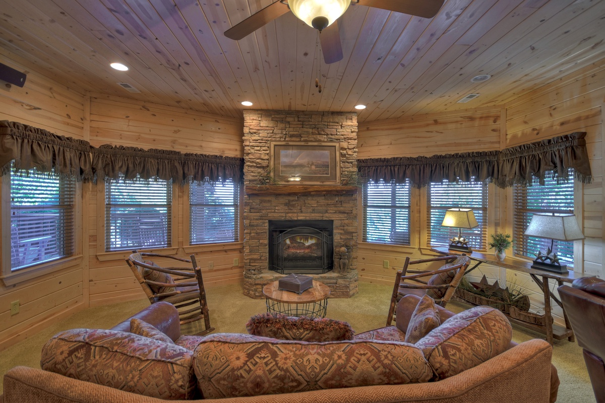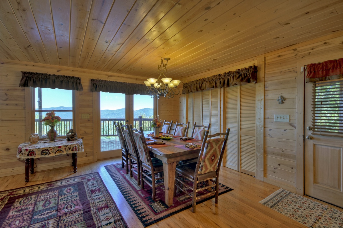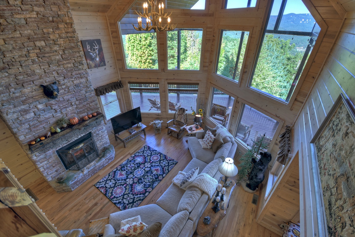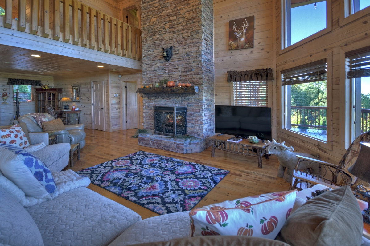 You will also find the entry-level deck access door behind the dining table. This leads you out the breathtaking mountain views that run panoramic from side to side! Soak it all in with plentiful seating as you watch the sunset behind the mountains. To the right, you will find a HUGE screened-in porch with a 65" TV over a wood-burning fireplace for your enjoyment. There is also plentiful wicker deck furniture to relax in while you watch your favorite shows or the big game.