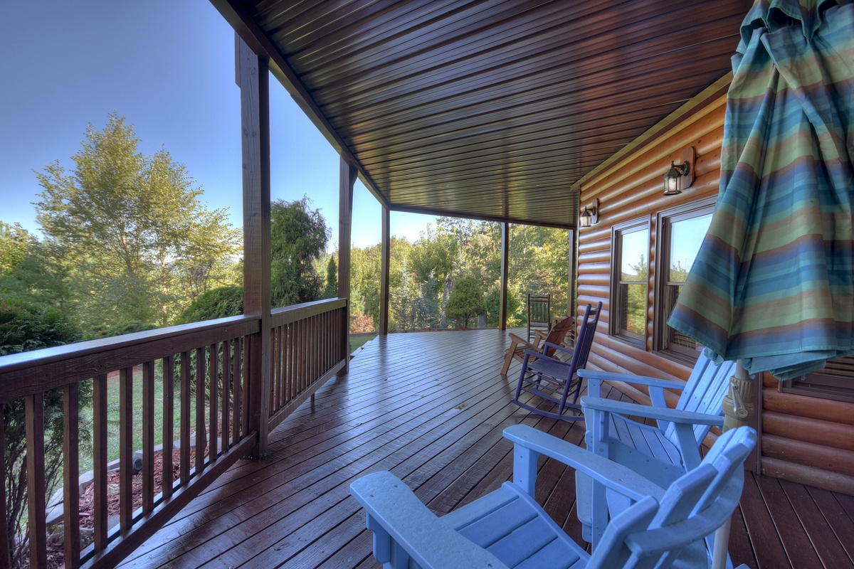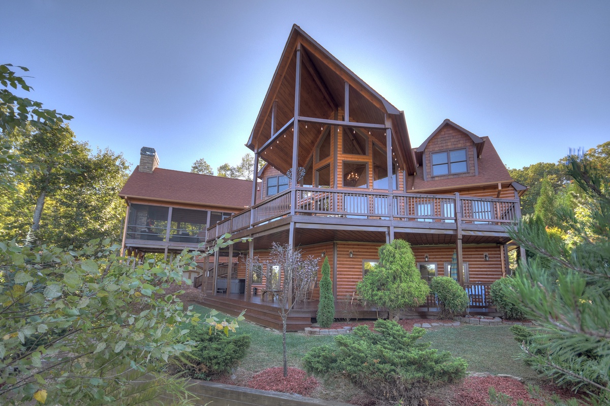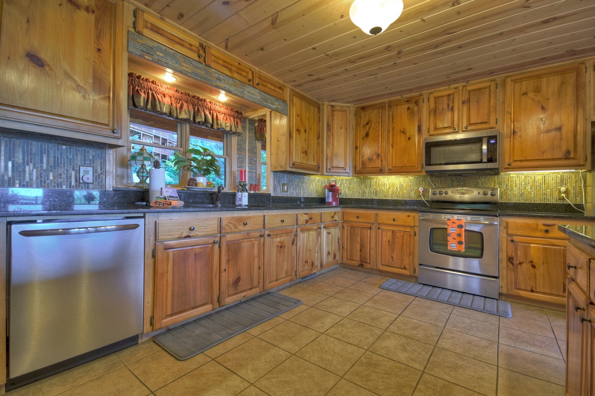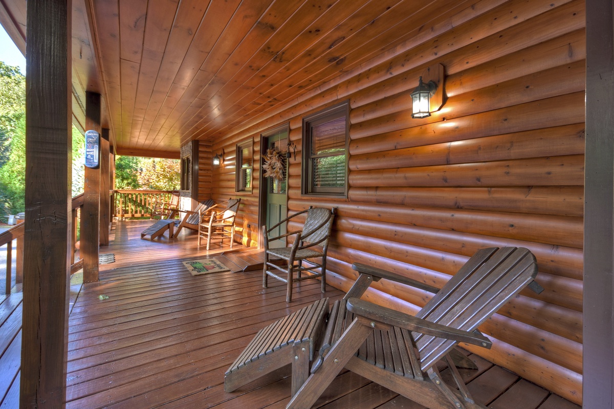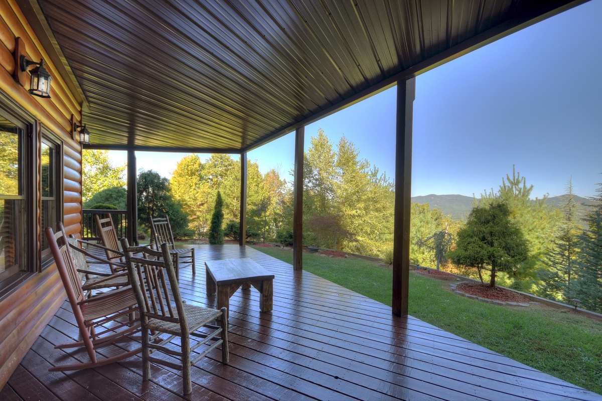 You will also find the entry-level deck access door behind the dining table. This leads you out the breathtaking mountain views that run panoramic from side to side! Soak it all in with plentiful seating as you watch the sunset behind the mountains. To the right, you will find a HUGE screened-in porch with a 65" TV over a wood-burning fireplace for your enjoyment. There is also plentiful wicker deck furniture to relax in while you watch your favorite shows or the big game.