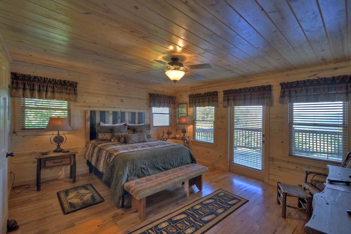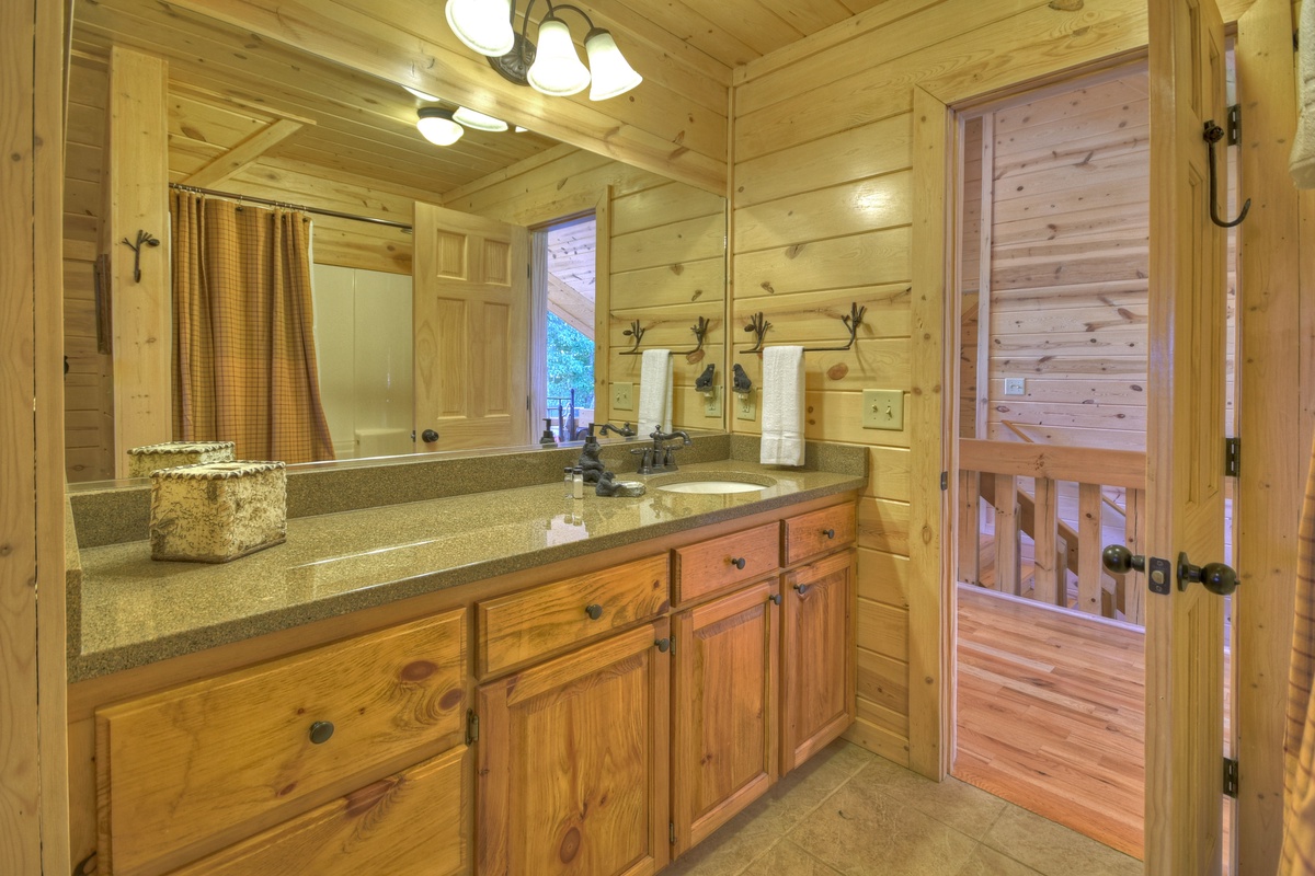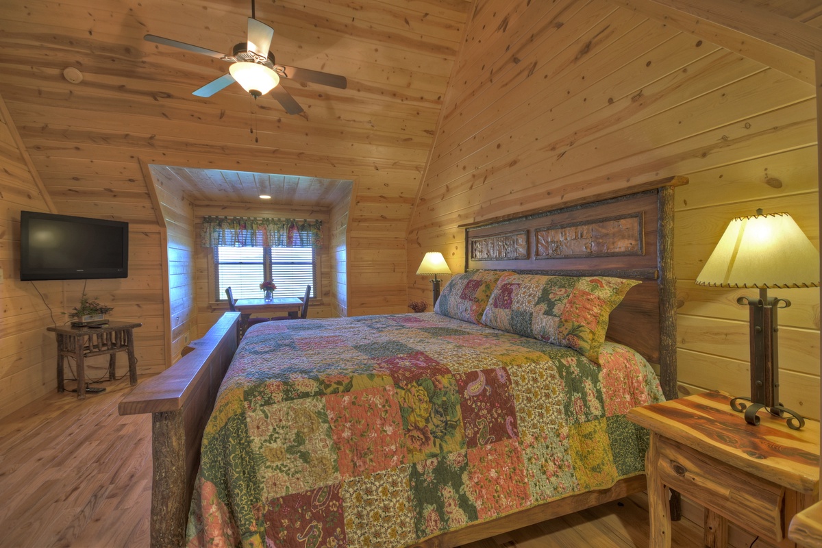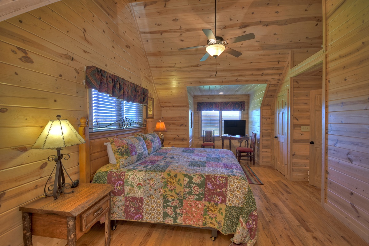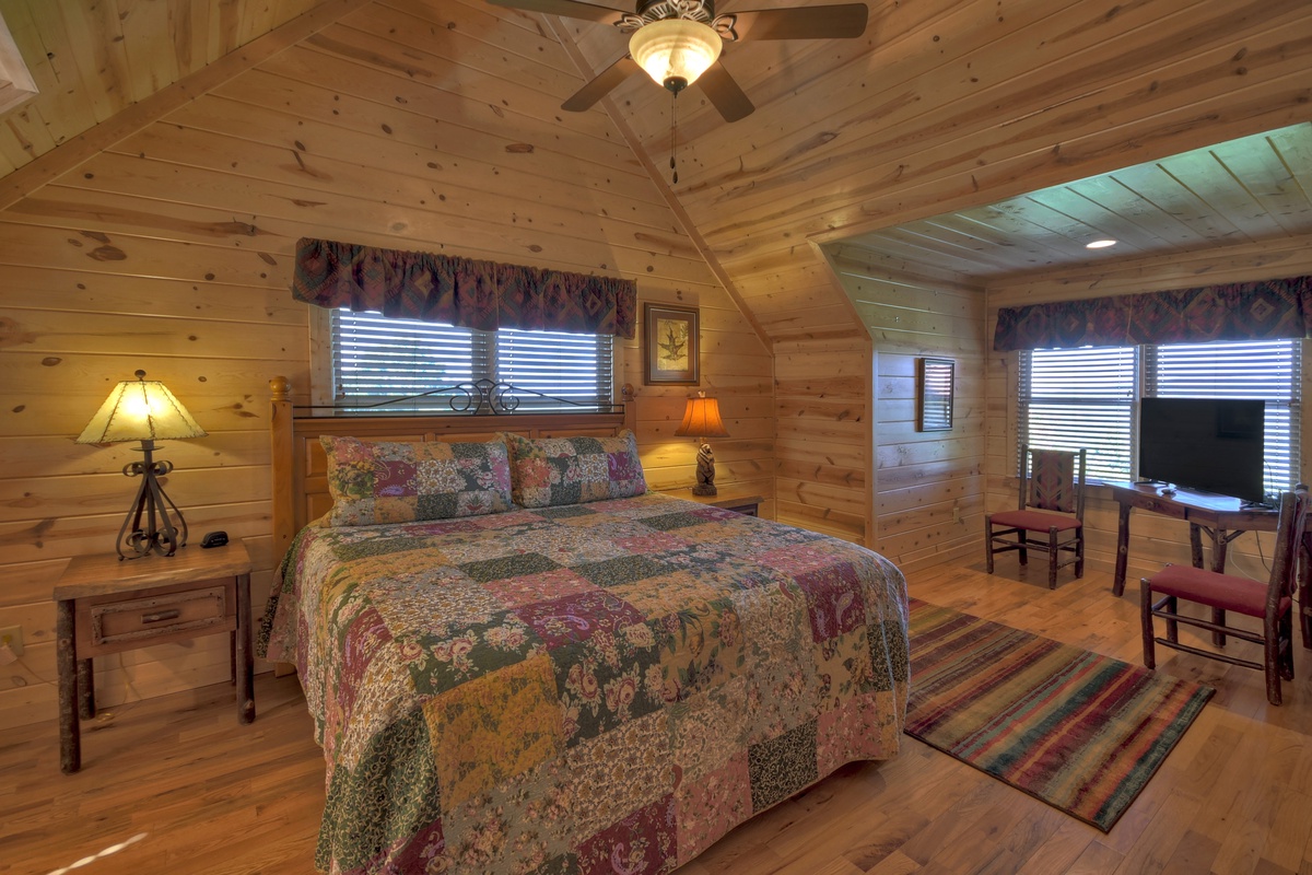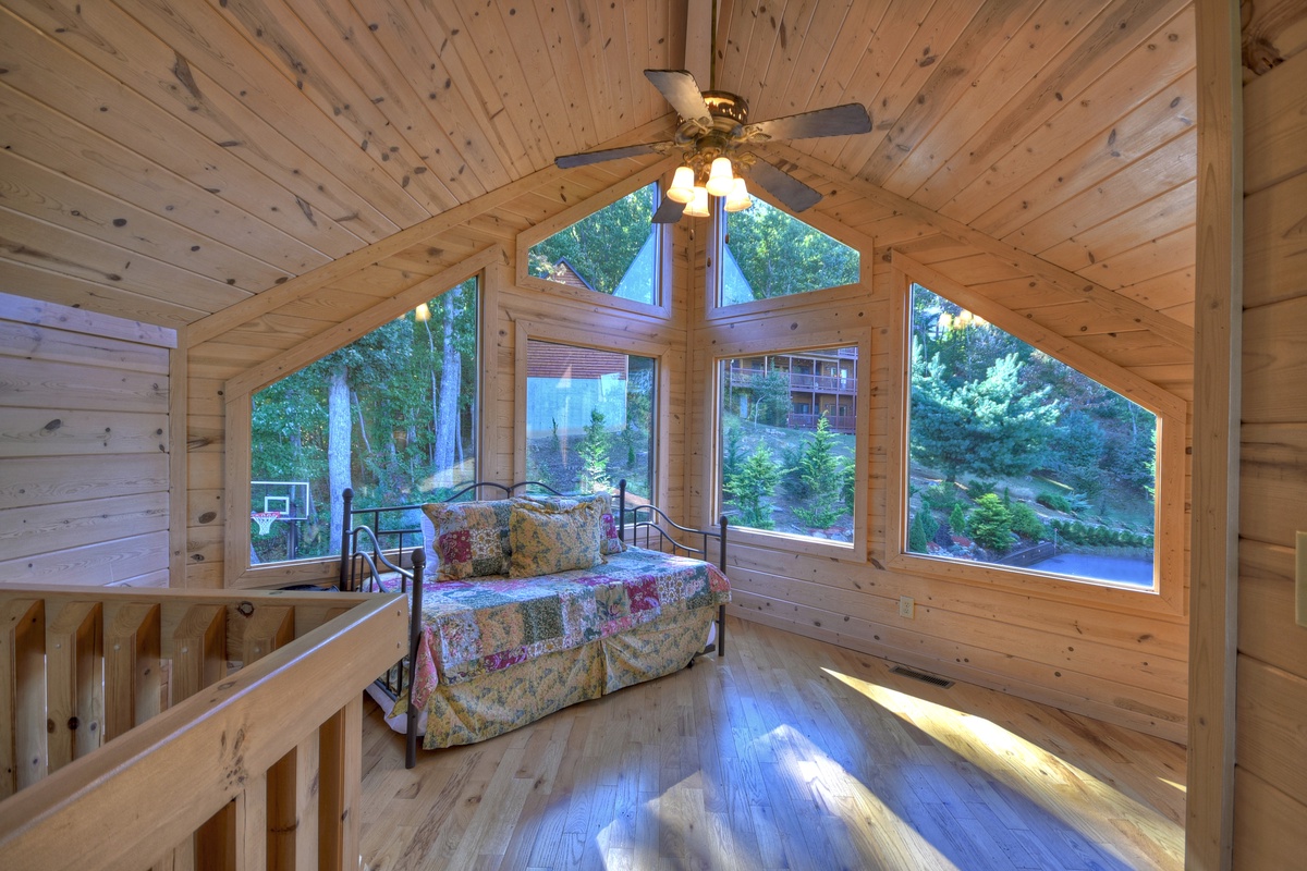 Head upstairs to the upper level of this property where you will find bedrooms #2 and #3. Both bedrooms boast king-size mattresses, with one having the attached, shared, tub/shower combo bathroom. Both bedrooms also come with some of the best views possible overlooking the rolling mountains in the distance. There is also a day bed/trundle bed in the open loft.