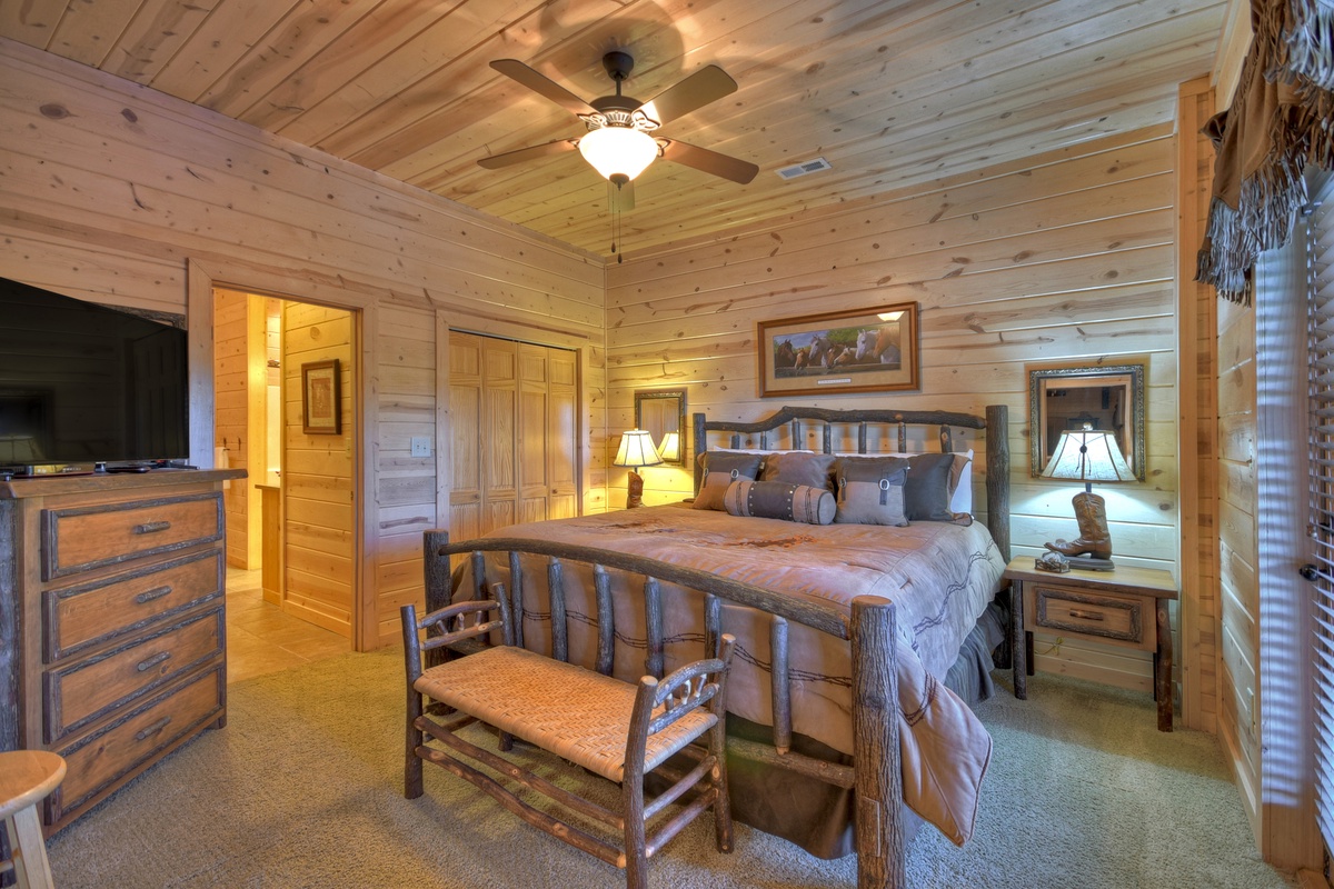 - King bedroom with 43" TV and attached, shared tub/shower combo bathroom