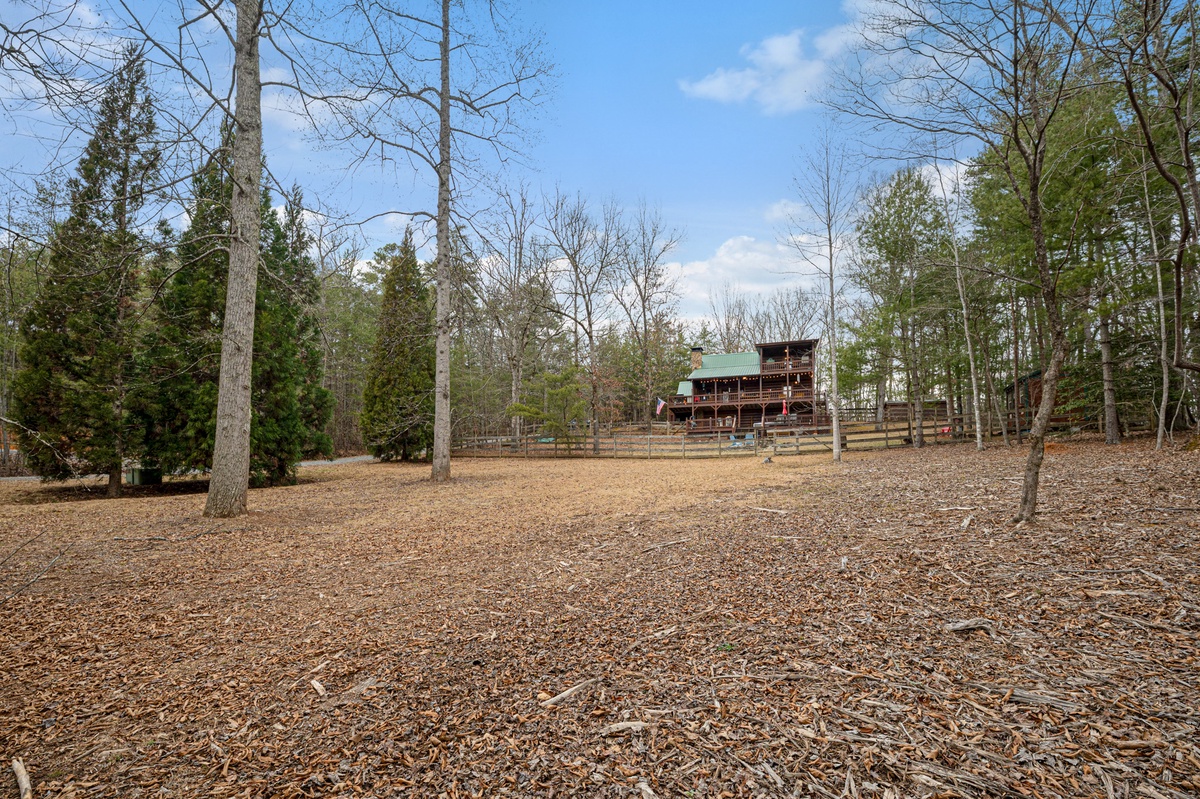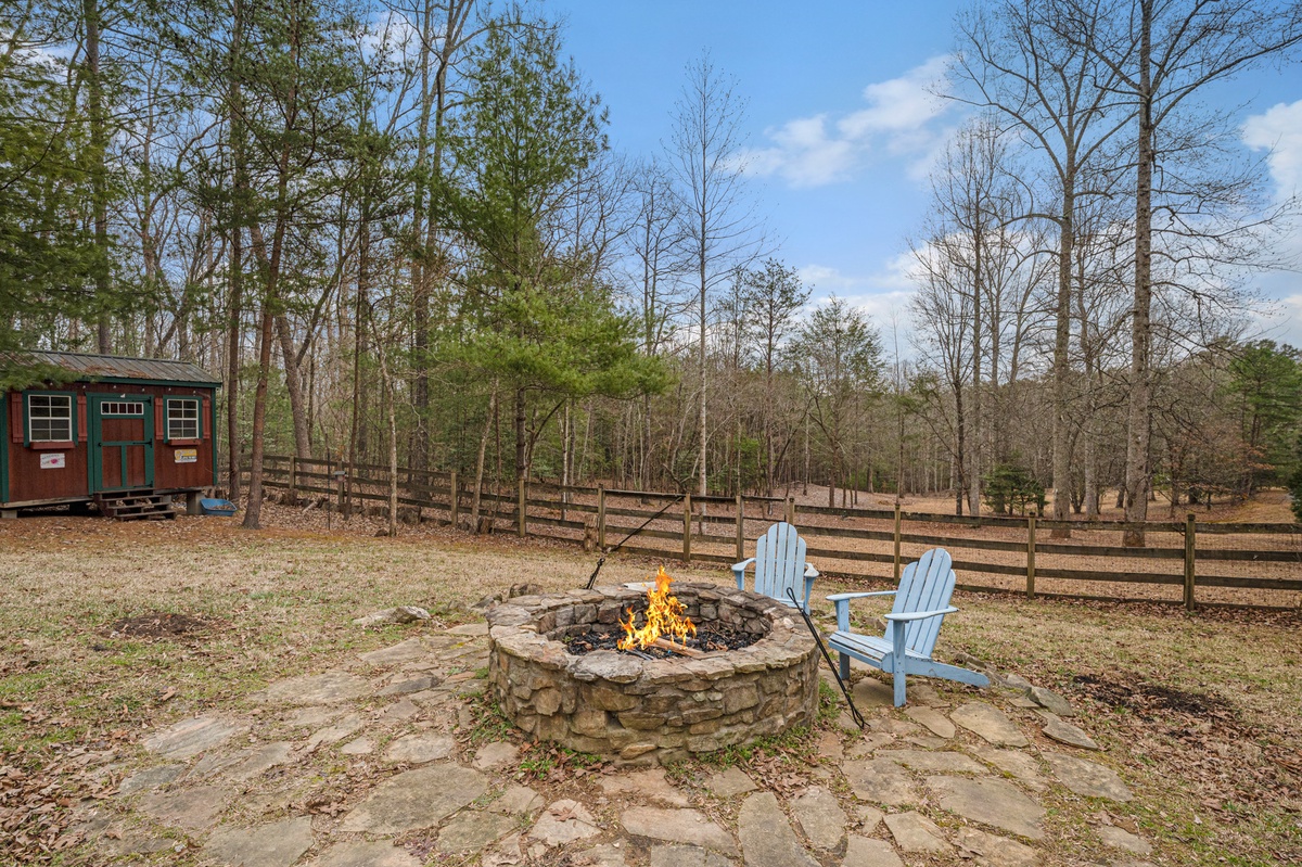Outdoor spaces include a main-level deck with dining for ten, rockers, a gas grill, and glider bench seating. The lower-level deck features a hot tub and an outdoor dining table, while the upper-level balcony provides a quiet spot with Adirondack chairs. The grounds offer over seven acres to explore, a large fenced-in backyard, a stone firepit with Adirondack chairs, and a gravel driveway.