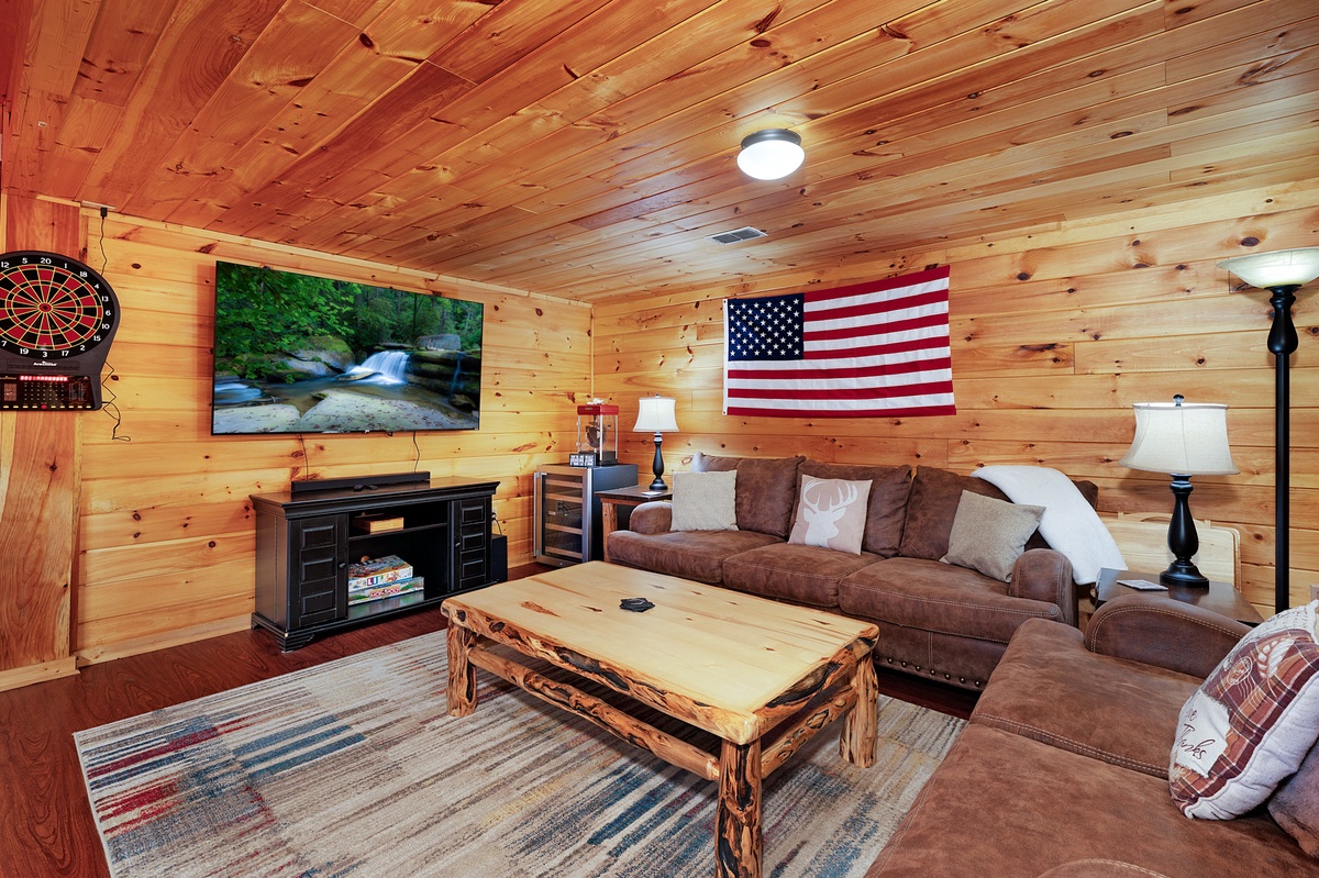 Downstairs, the lower-level entertainment room is designed for fun and downtime with a pool table, dart board, streaming TV, wine fridge, popcorn maker, custom chess table, board games, and plenty of seating. A bunk room with multiple sleeping options and a shared full bathroom complete this level.
