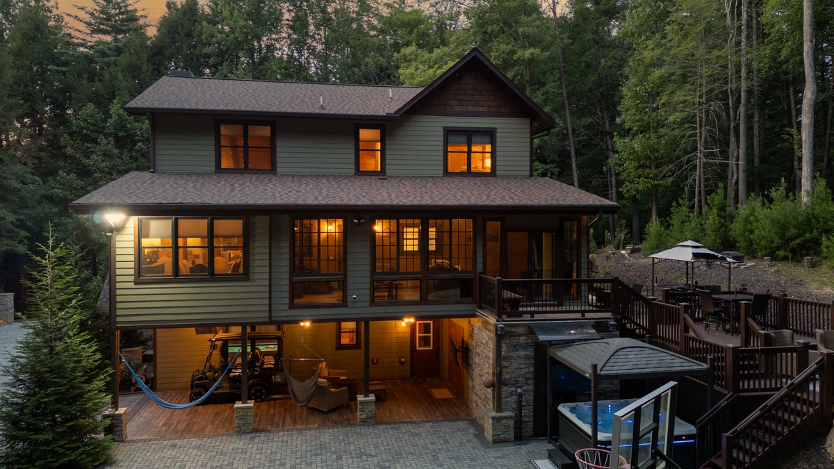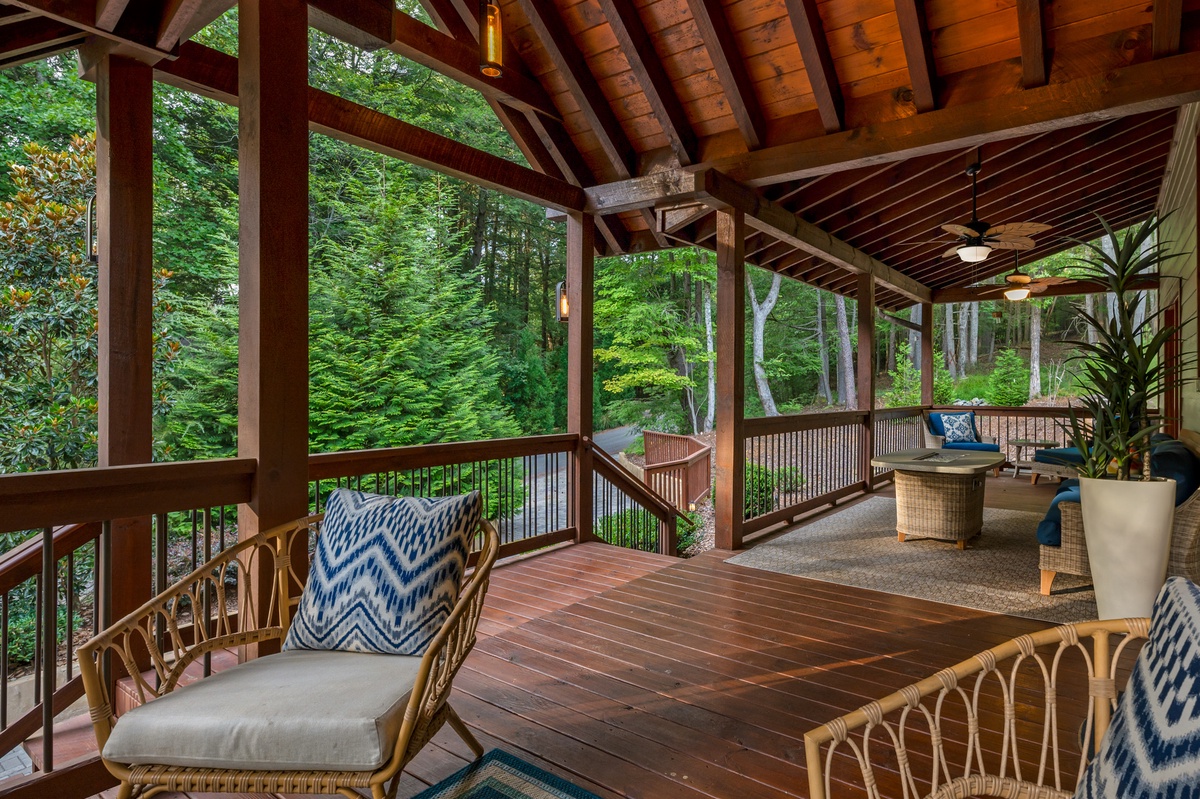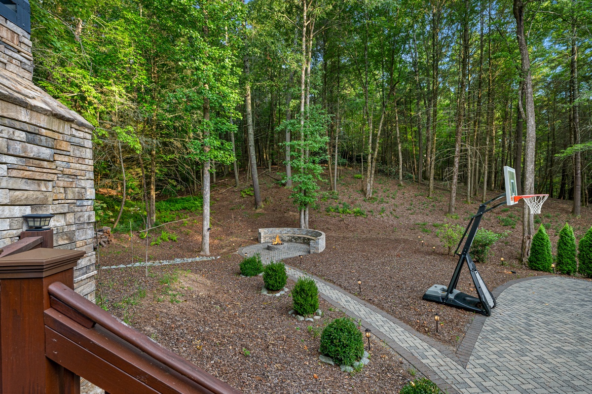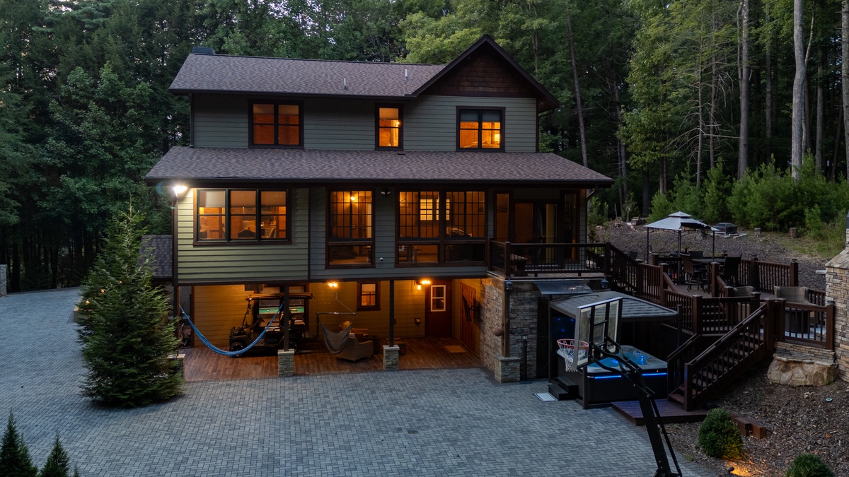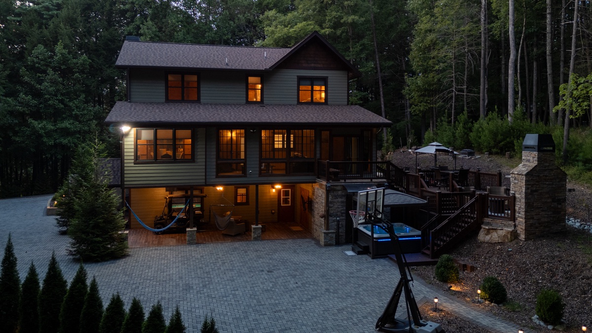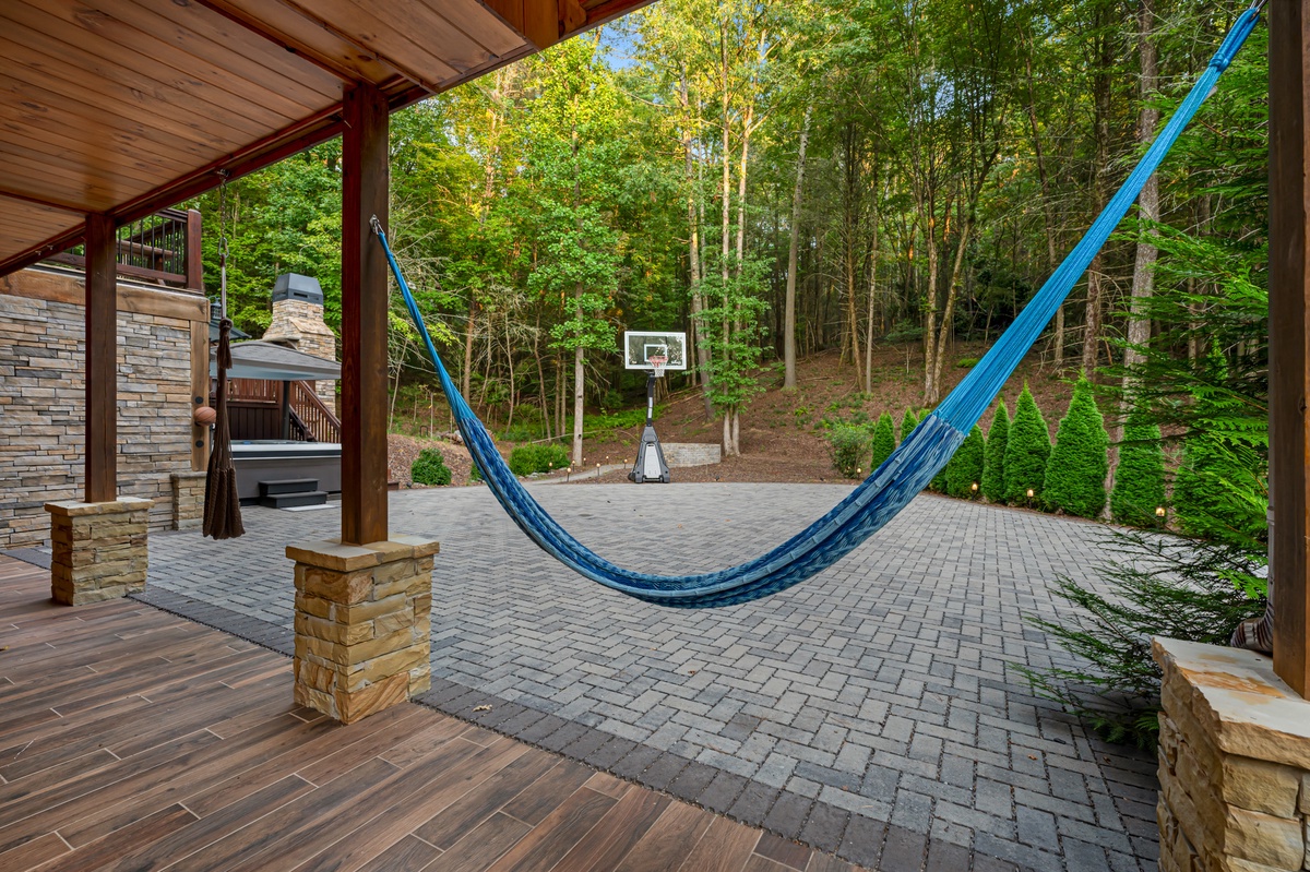 Outside, the allure continues with multiple outdoor living spaces designed for both entertainment and relaxation. The entry-level covered deck invites you to unwind with ample seating and a stylish gas fire table. The back deck, with its covered BBQ area, outdoor dining space, and a grand wood-burning fireplace, is perfect for hosting unforgettable gatherings. But the pièce de résistance is the lower-level entertainment area, featuring a luxurious hot tub with a flat-screen TV and a serene sitting area complete with hammocks. And for the first time in our program, Goose Island Retreat boasts a private basketball court, offering a unique blend of sport and luxury rarely found in mountain retreats. End your days gathered around the firepit, surrounded by the tranquil sounds of nature, as you reflect on the memories made.