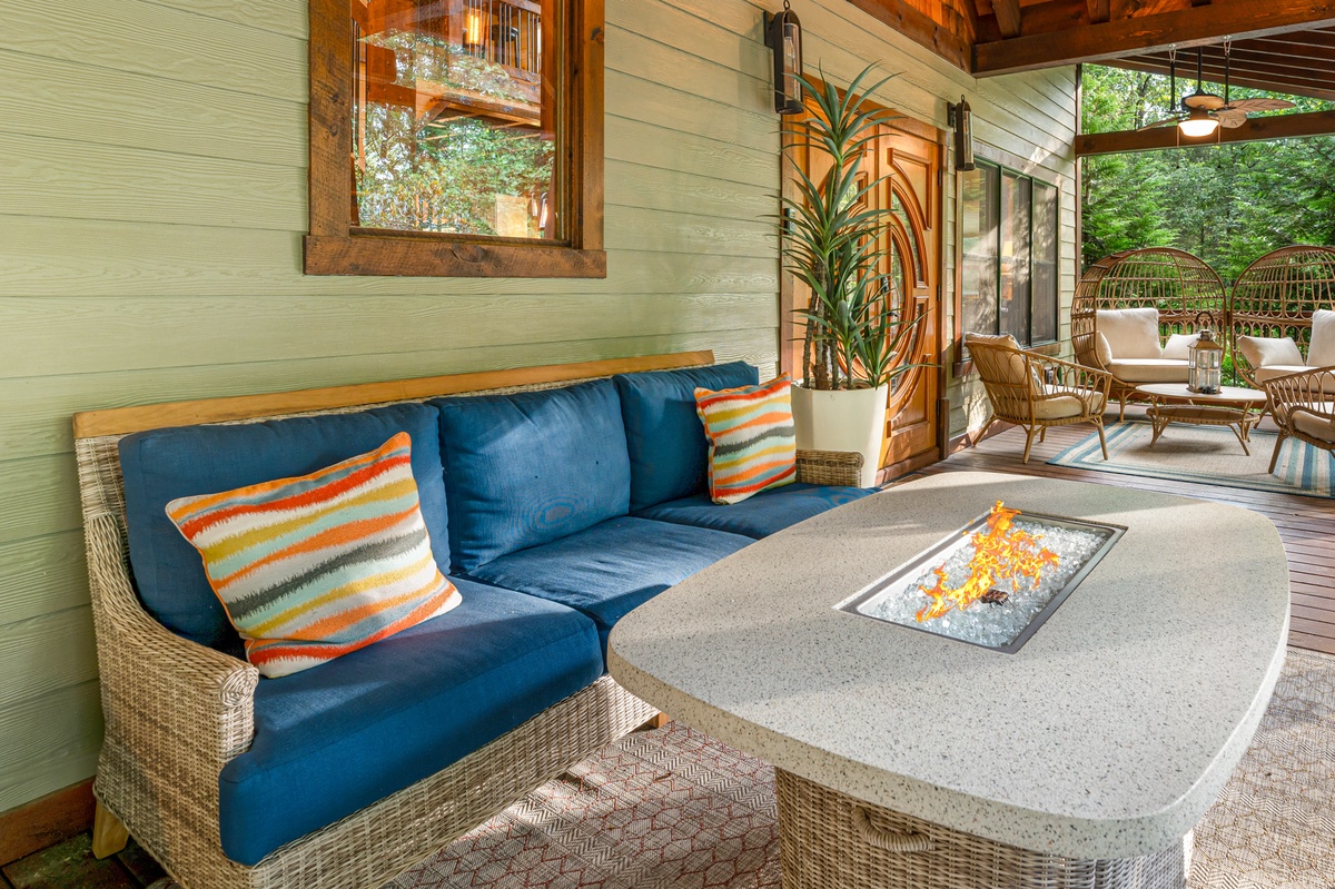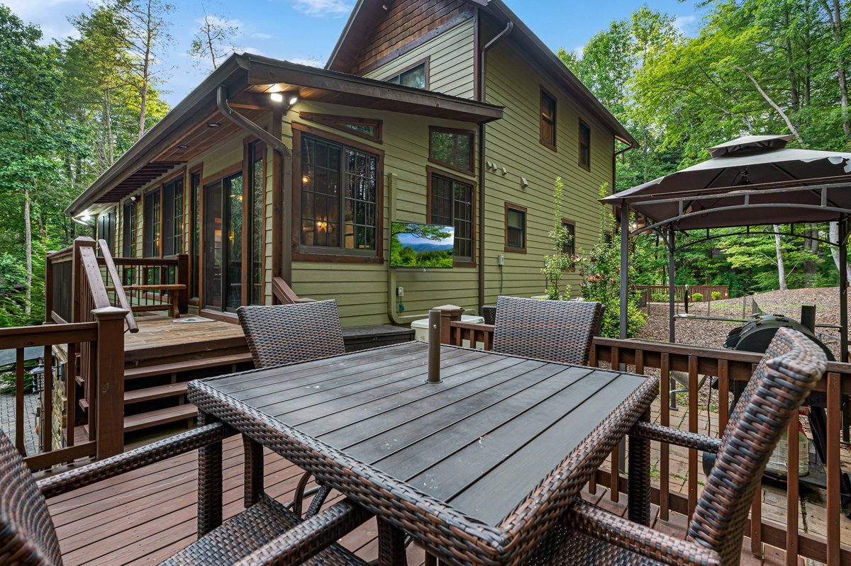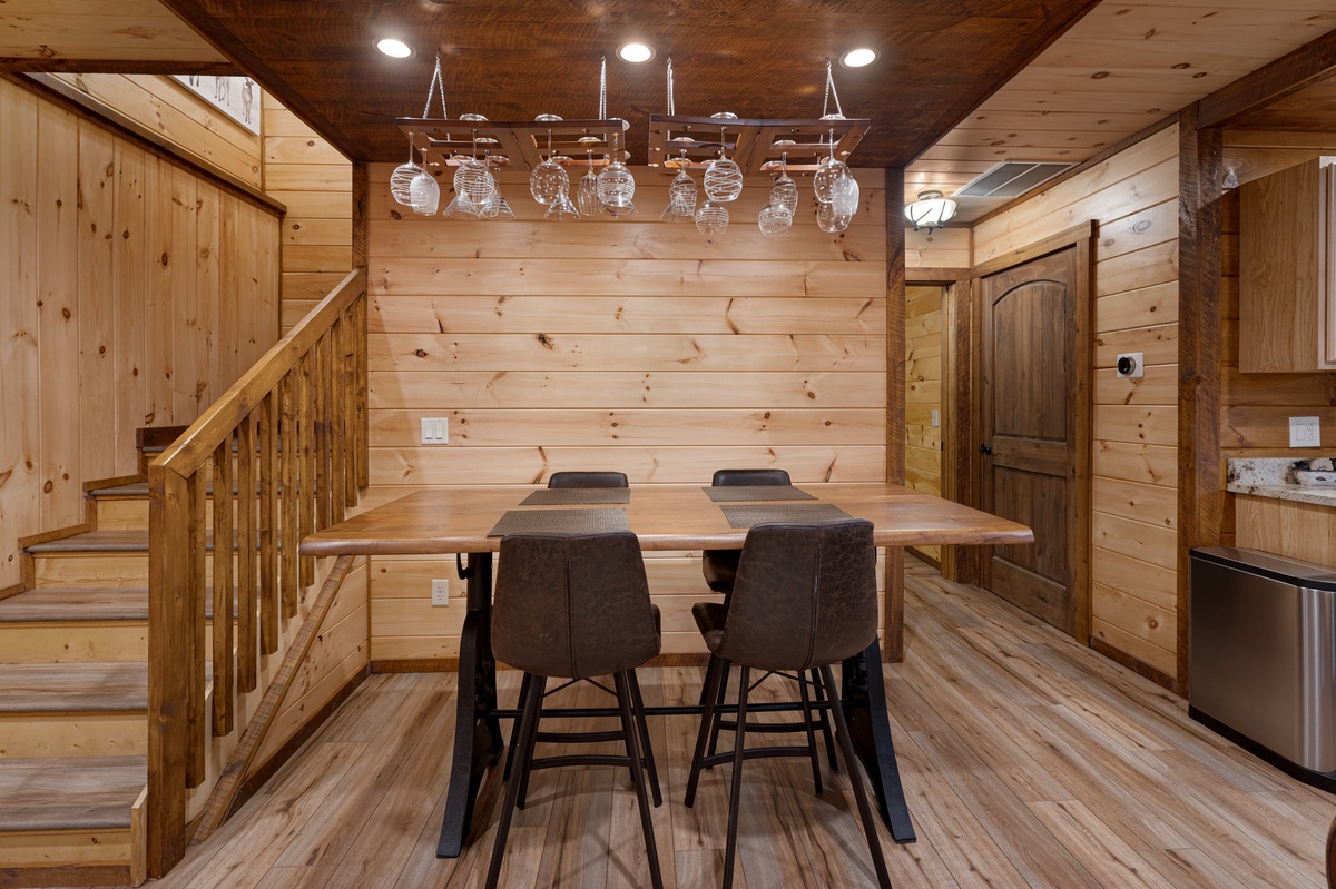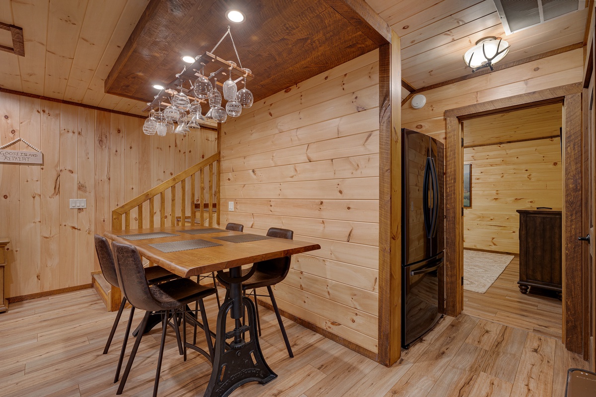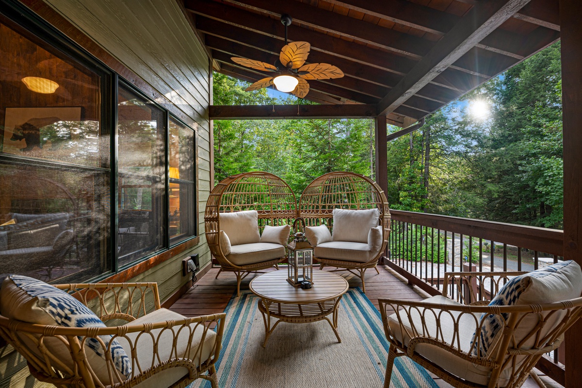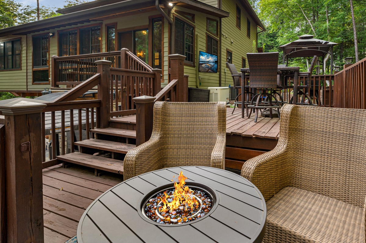 Outside, the allure continues with multiple outdoor living spaces designed for both entertainment and relaxation. The entry-level covered deck invites you to unwind with ample seating and a stylish gas fire table. The back deck, with its covered BBQ area, outdoor dining space, and a grand wood-burning fireplace, is perfect for hosting unforgettable gatherings. But the pièce de résistance is the lower-level entertainment area, featuring a luxurious hot tub with a flat-screen TV and a serene sitting area complete with hammocks. And for the first time in our program, Goose Island Retreat boasts a private basketball court, offering a unique blend of sport and luxury rarely found in mountain retreats. End your days gathered around the firepit, surrounded by the tranquil sounds of nature, as you reflect on the memories made.