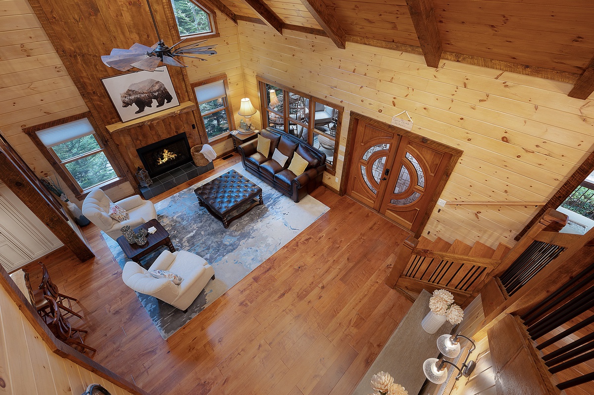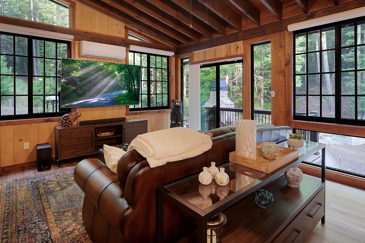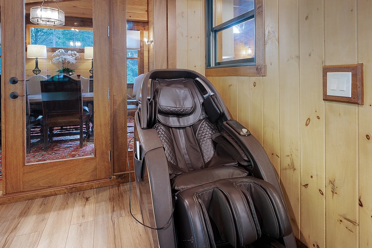 The main level also features an opulent living room with a state-of-the-art massage chair, a large TV, and direct access to the expansive deck, where the mountain air invites relaxation. The King Primary Suite is a sanctuary of luxury, featuring a lavish king-size bed, a private sitting area, and exclusive access to a covered front deck. The en-suite bathroom offers a spa-like experience with double vanities, a custom tile shower, and a soaking tub designed for ultimate relaxation.