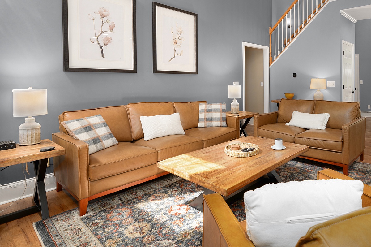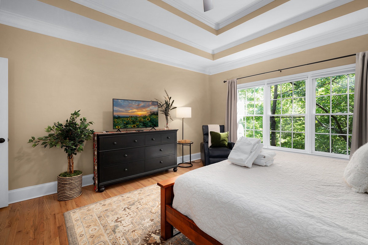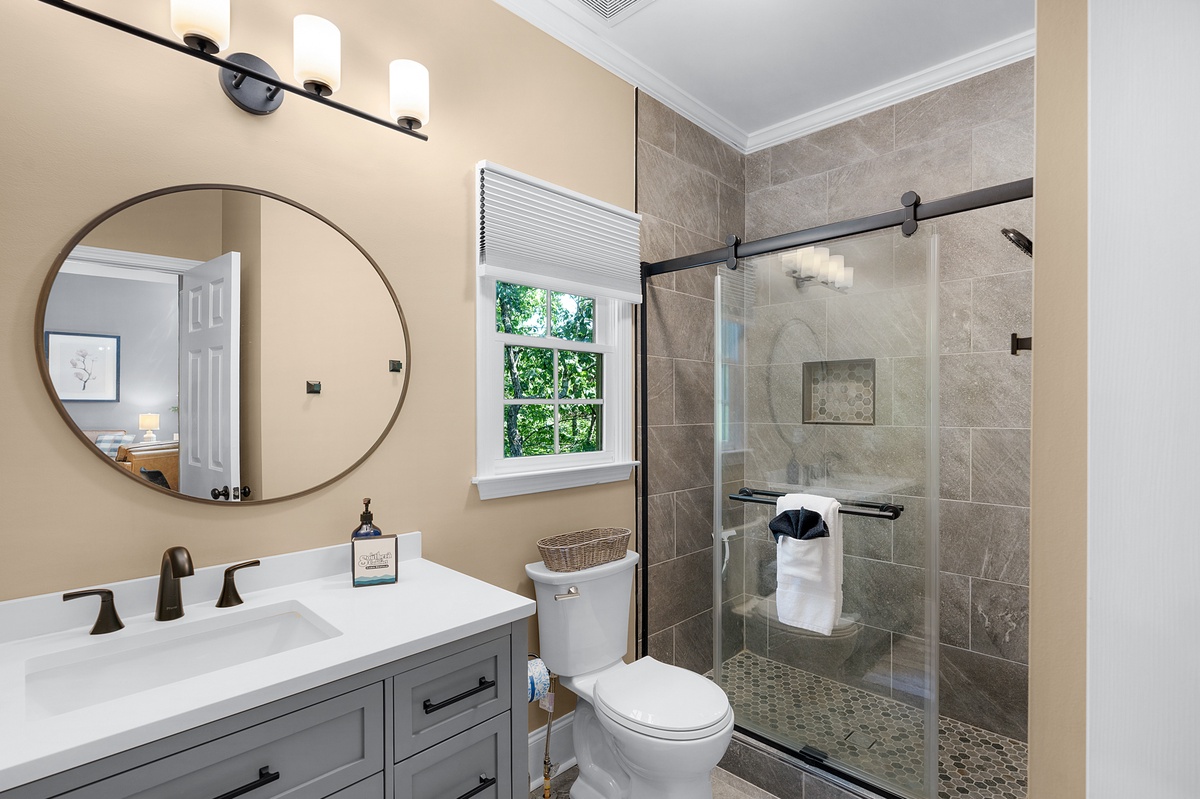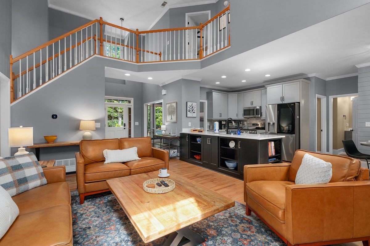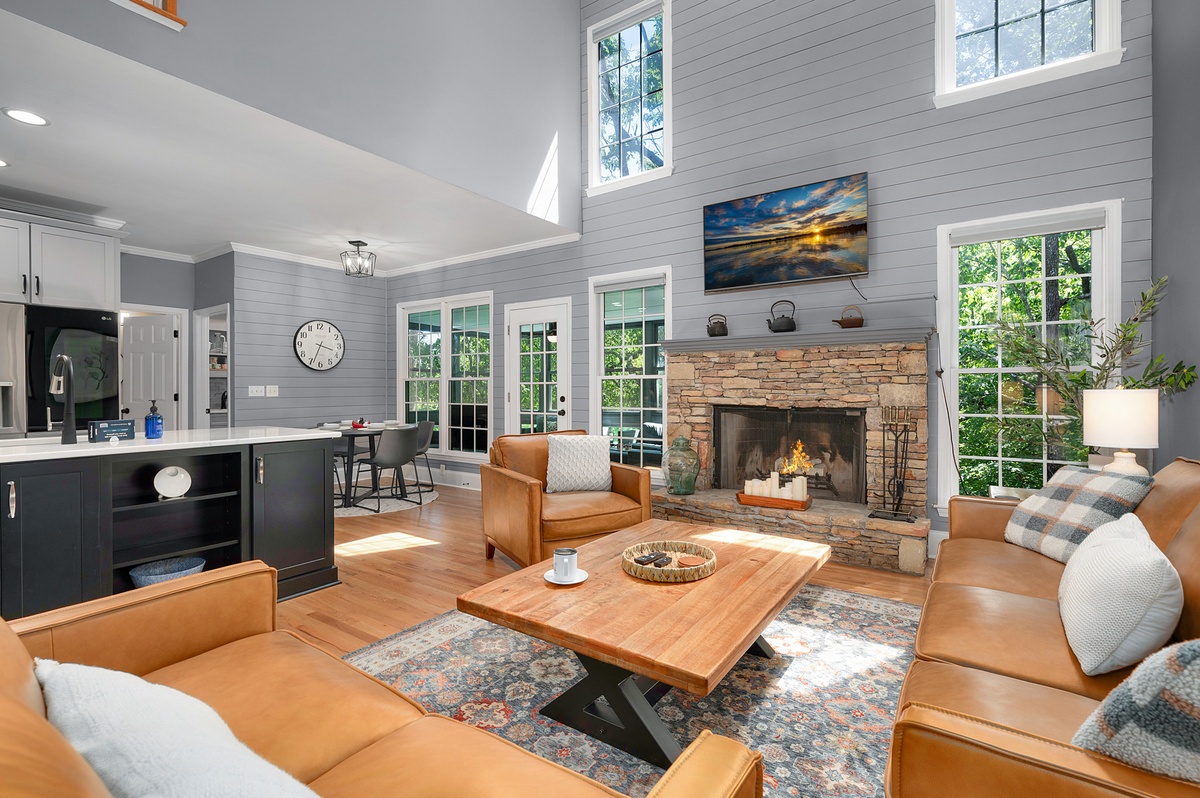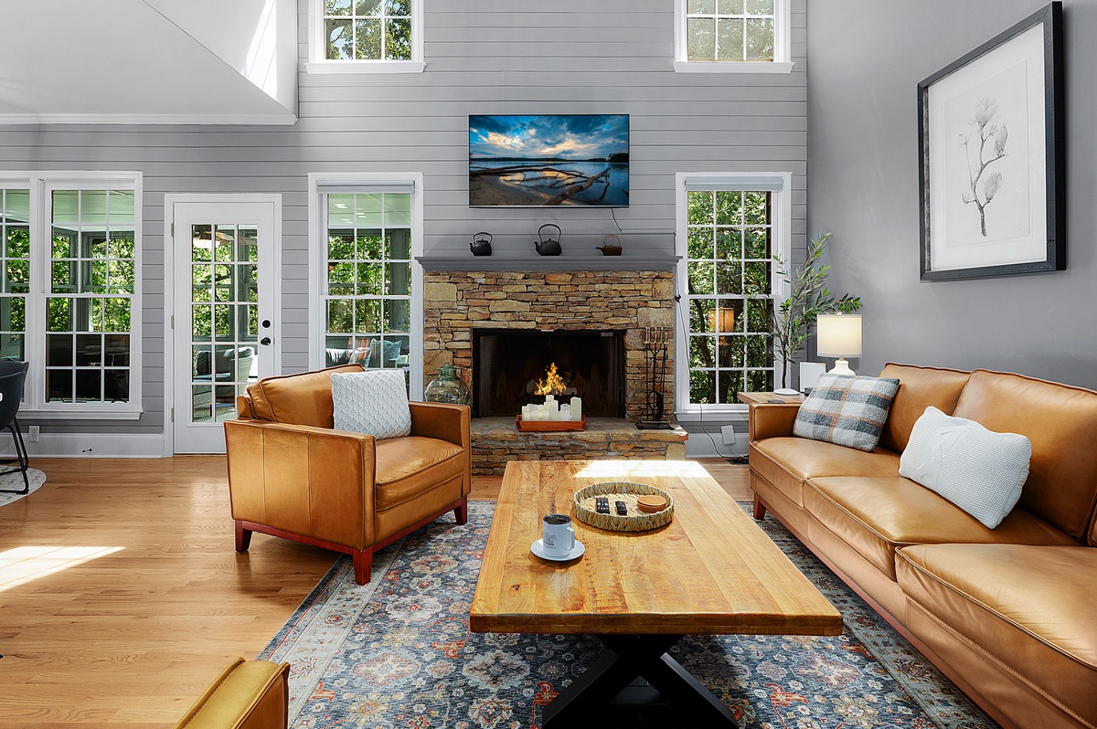The front entrance opens to a great room with a flat-screen TV and wood-burning stacked stone fireplace, a fully furnished kitchen, and a dining room that seats 6-10. The kitchen boasts new appliances, a large prep area, and a butler's pantry with a sink. The charming breakfast area seats an additional four. Newly renovated spa-like bathrooms are throughout the home.