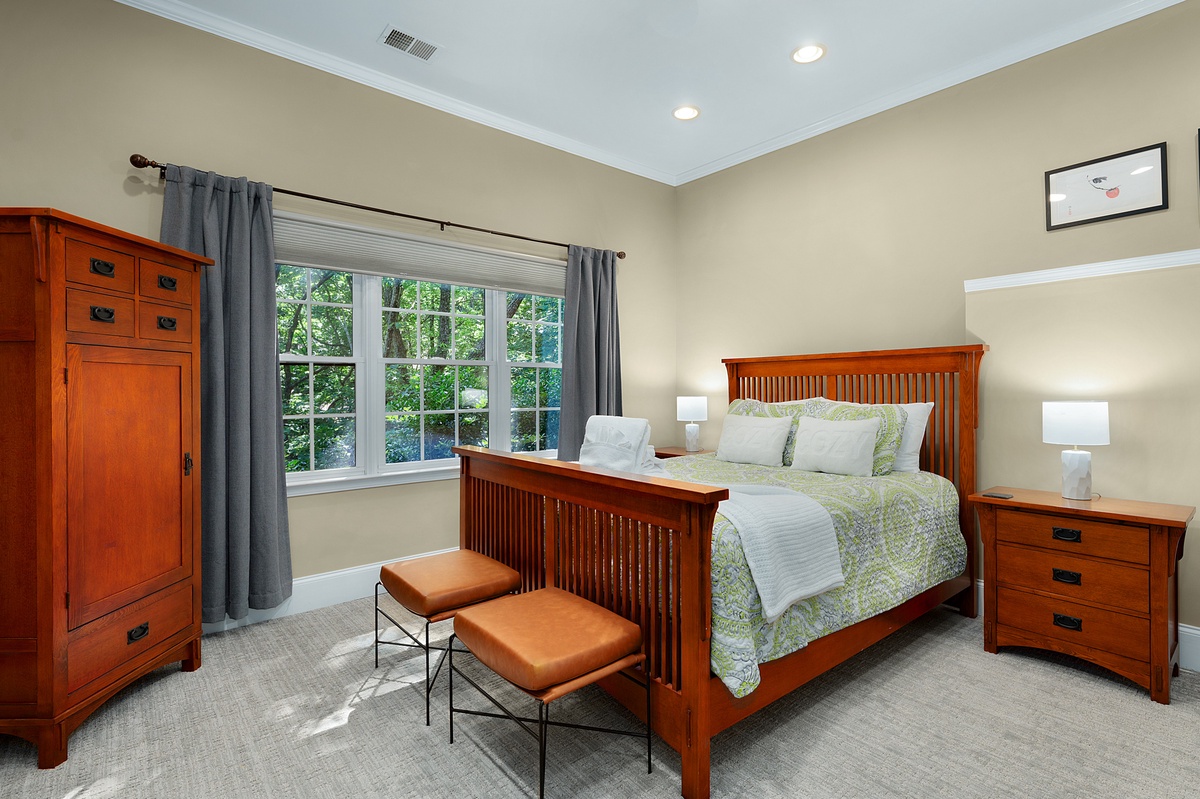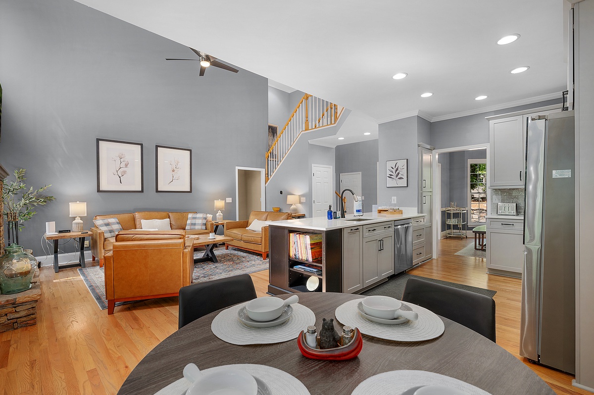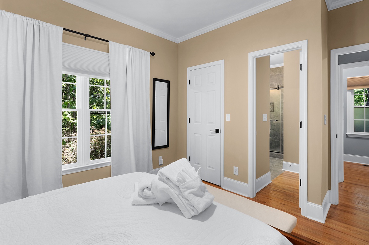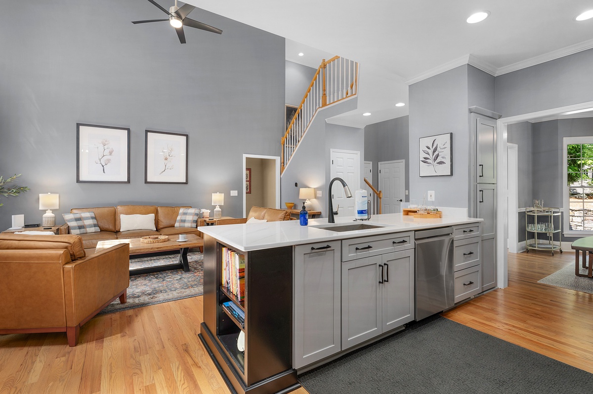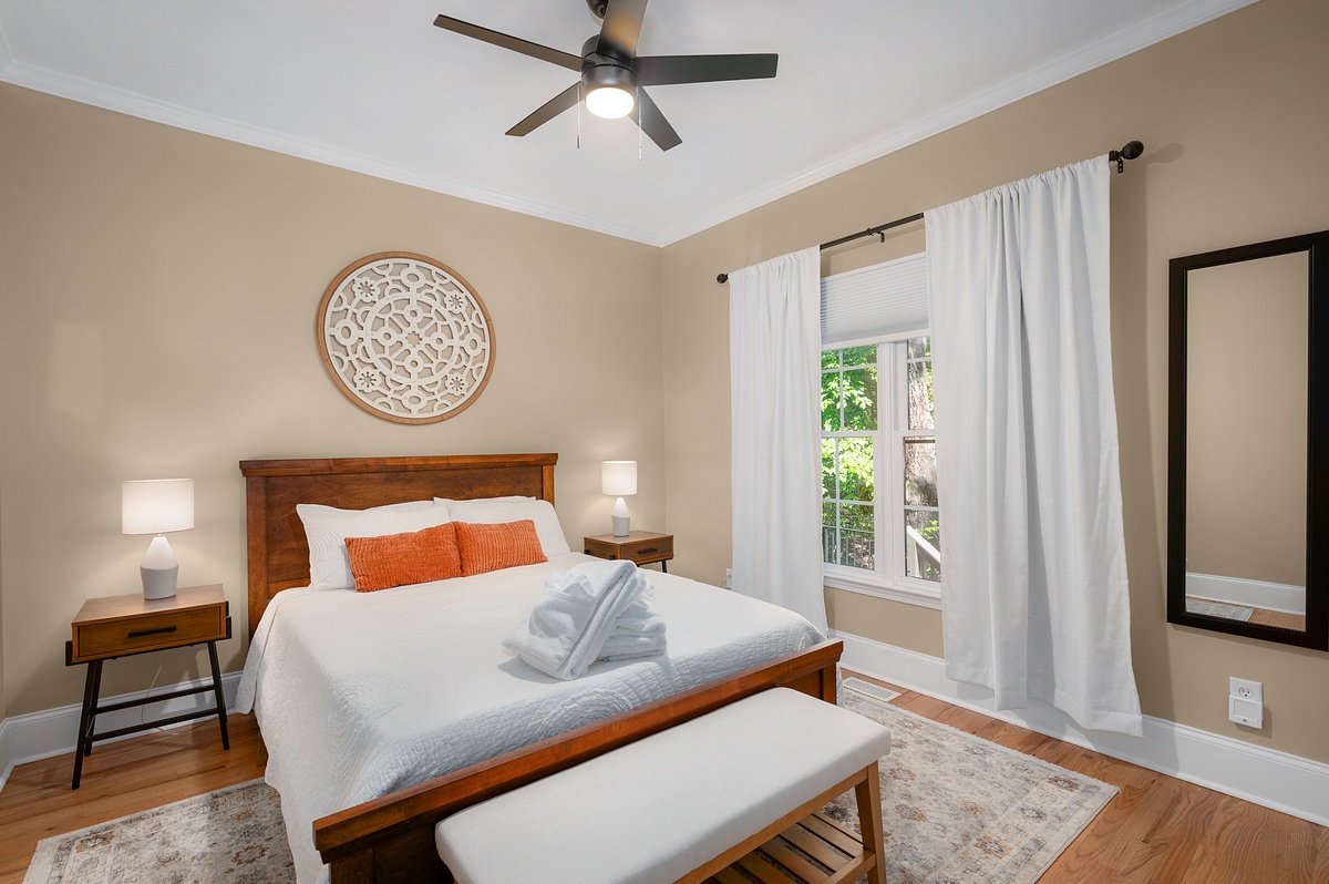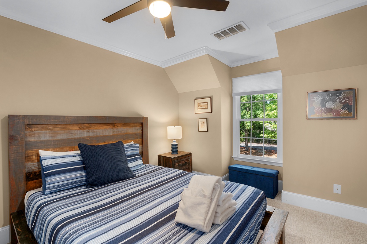 The front entrance opens to a great room with a flat-screen TV and wood-burning stacked stone fireplace, a fully furnished kitchen, and a dining room that seats 6-10. The kitchen boasts new appliances, a large prep area, and a butler's pantry with a sink. The charming breakfast area seats an additional four. Newly renovated spa-like bathrooms are throughout the home.